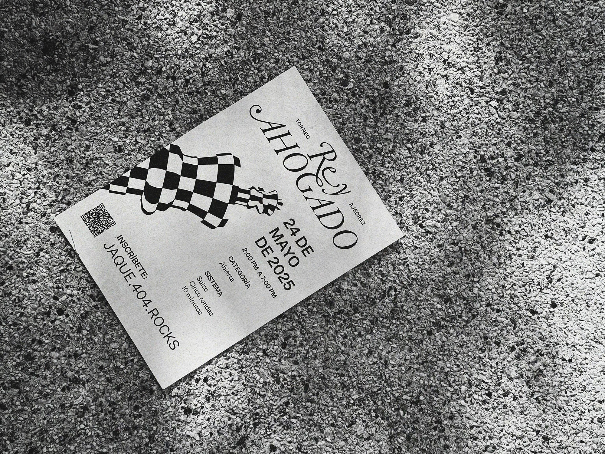 To honor this collaboration, we combined 3D graphic generation with 3D-printed object production and augmented reality, inspired by the concept and chess situation known as the “smothered mate”, or “rey ahogado” in Spanish. The graphic composition is based on the contrast between Garamond Premier and Untitled Sans. The central poster features a king piece wrapped in checkered squares, evoking the chessboard. The project was created as part of a broader effort to highlight chess as art, game, and educational tool.