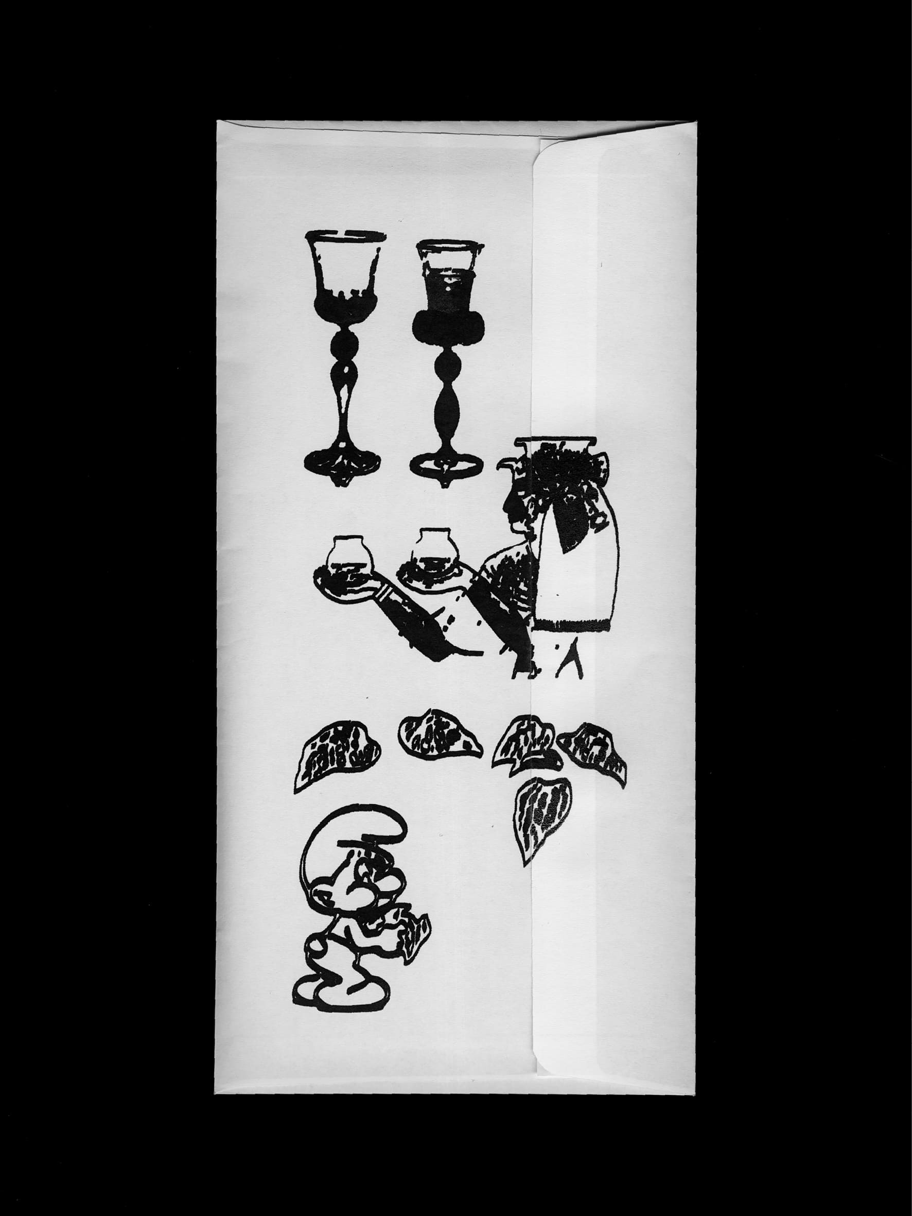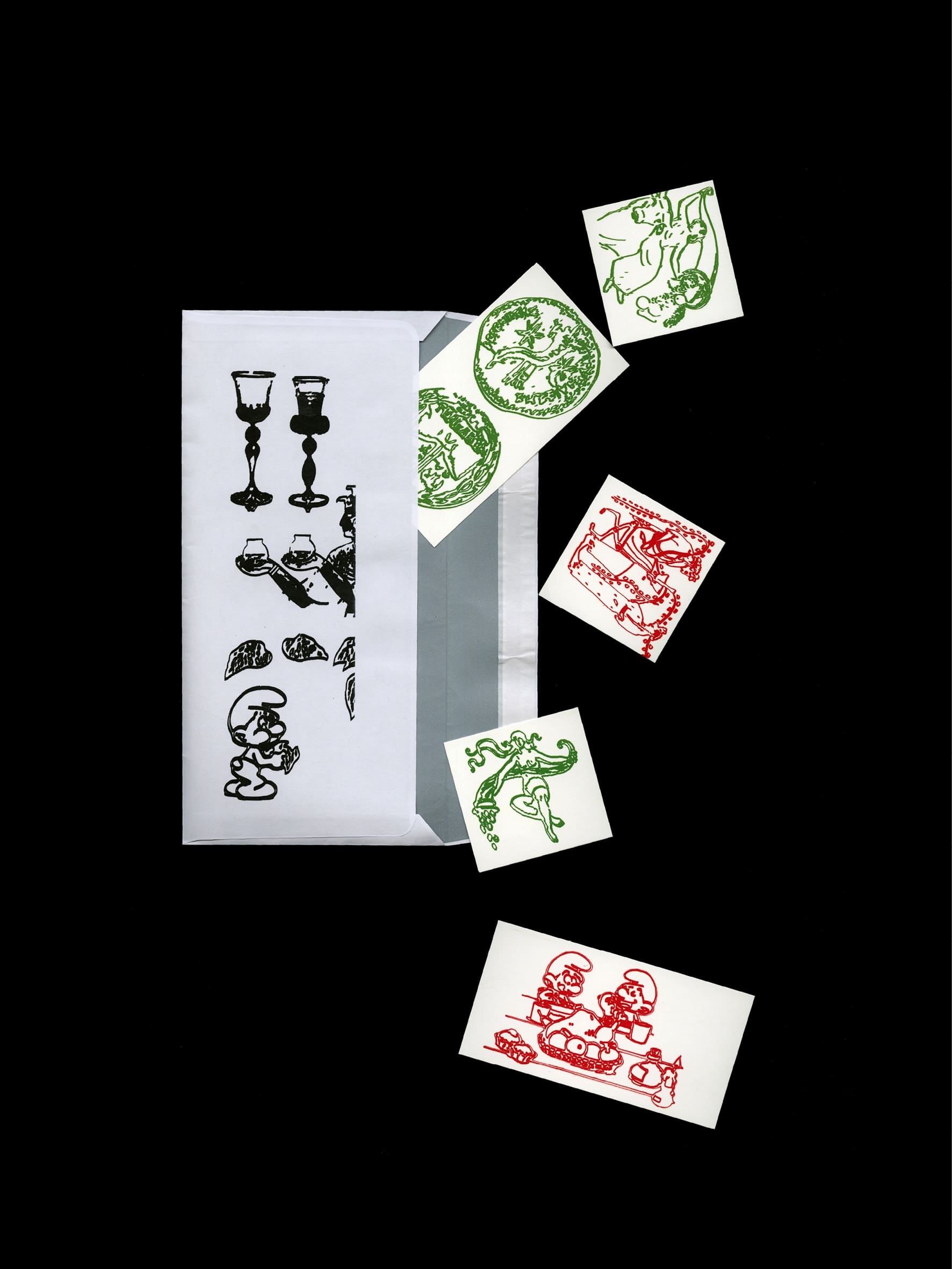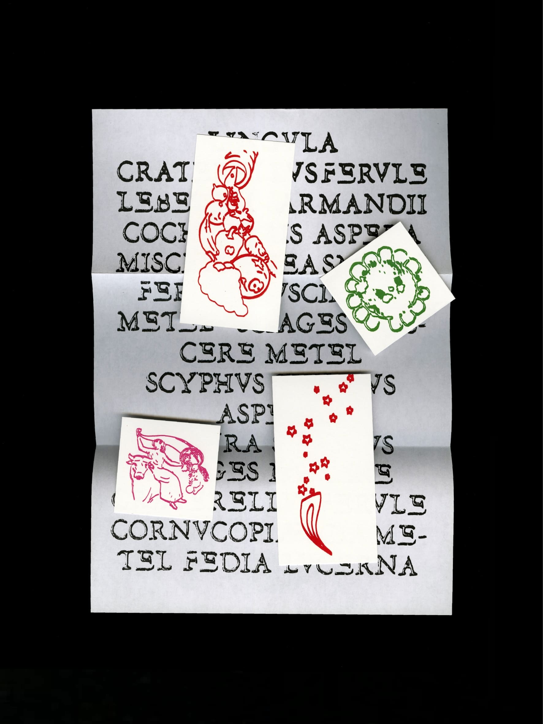 In classical antiquity, the cornucopia (from the Latin cornu “horn” and copia “abundance”), was a symbol of abundance of food and wealth. The invitation, designed with Laurie Giraud, took the form of an envelope filled with small cards, illustrations, and texts about the exhibition. We developed a rich collection of images as a starting point, as if to create a visual map evoking the theme of the exhibition. The text is set in FD Garamon(d/t).