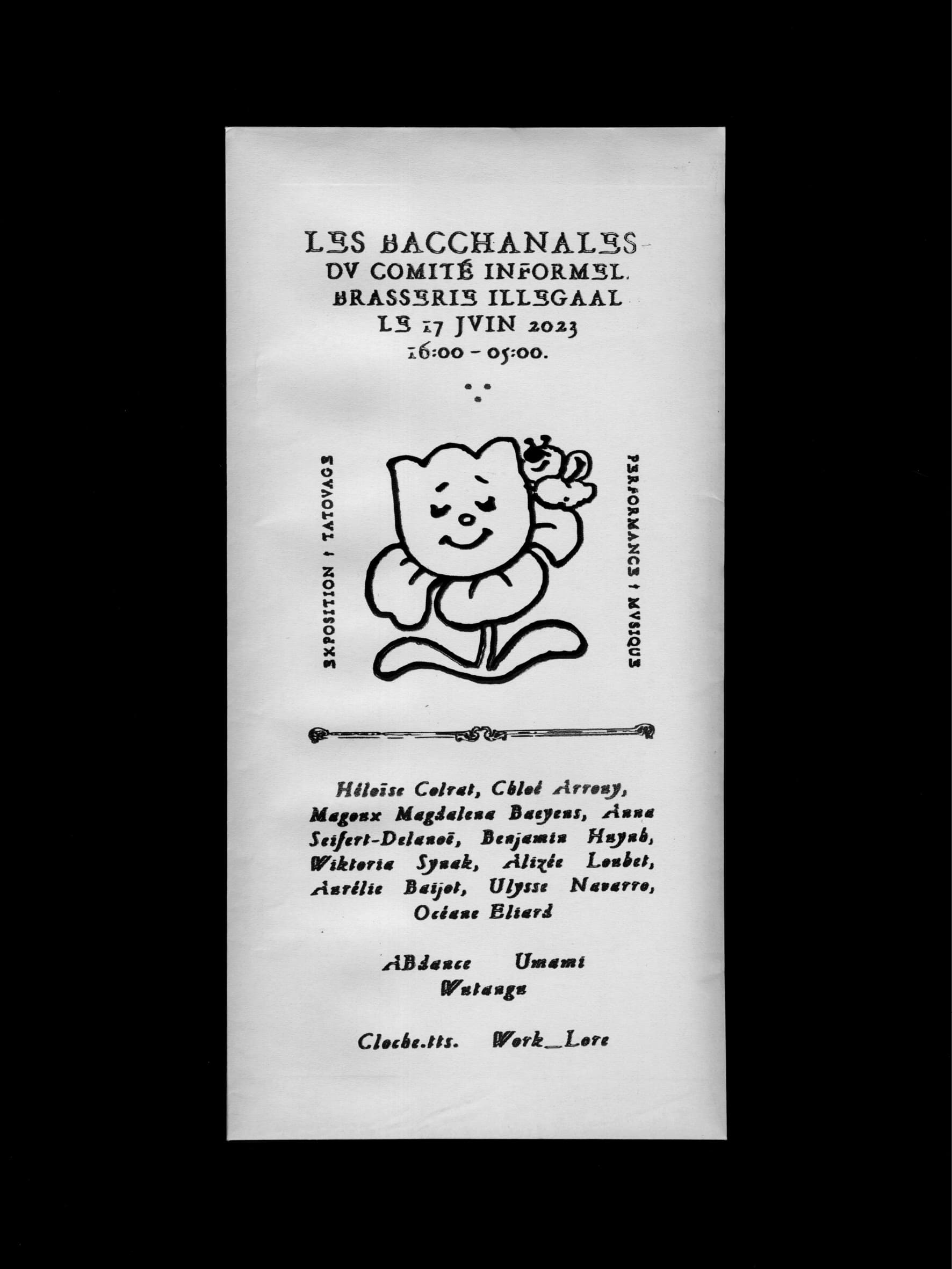 Les Bacchanales du comité informel was a multidisciplinary micro festival involving an art exhibition, tattooing, a DJ set, and hedonism. It took place at Brussels’ Brasserie ILLegaal in June 2023.
