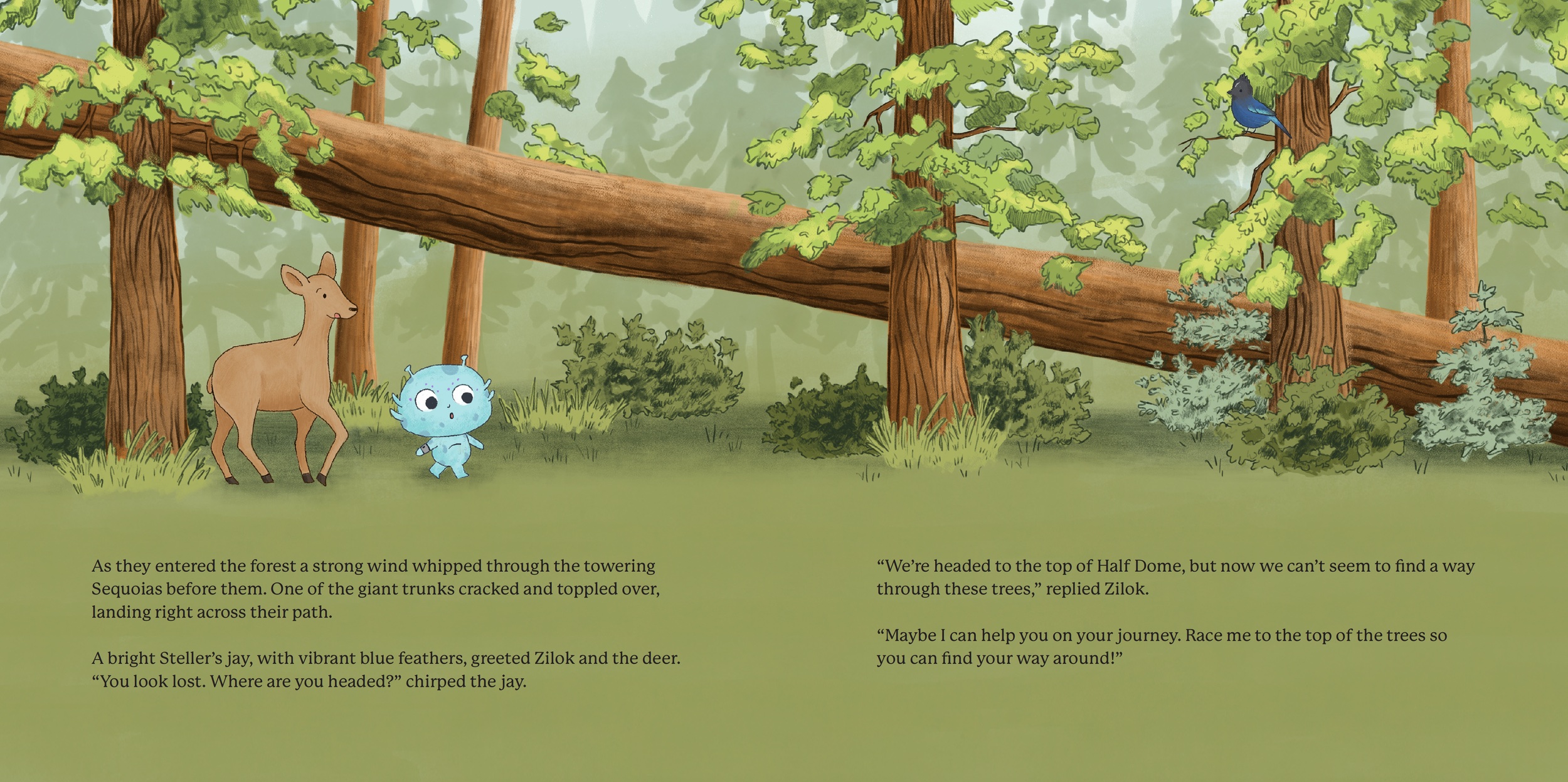 Zilok Roams Yosemite is a children’s book written by Lee Peglow and PJ McCabe, and illustrated by Jamie Kwok Sitt. It tells the story of an alien stranded in Yosemite National Park. From the illustrator’s website: