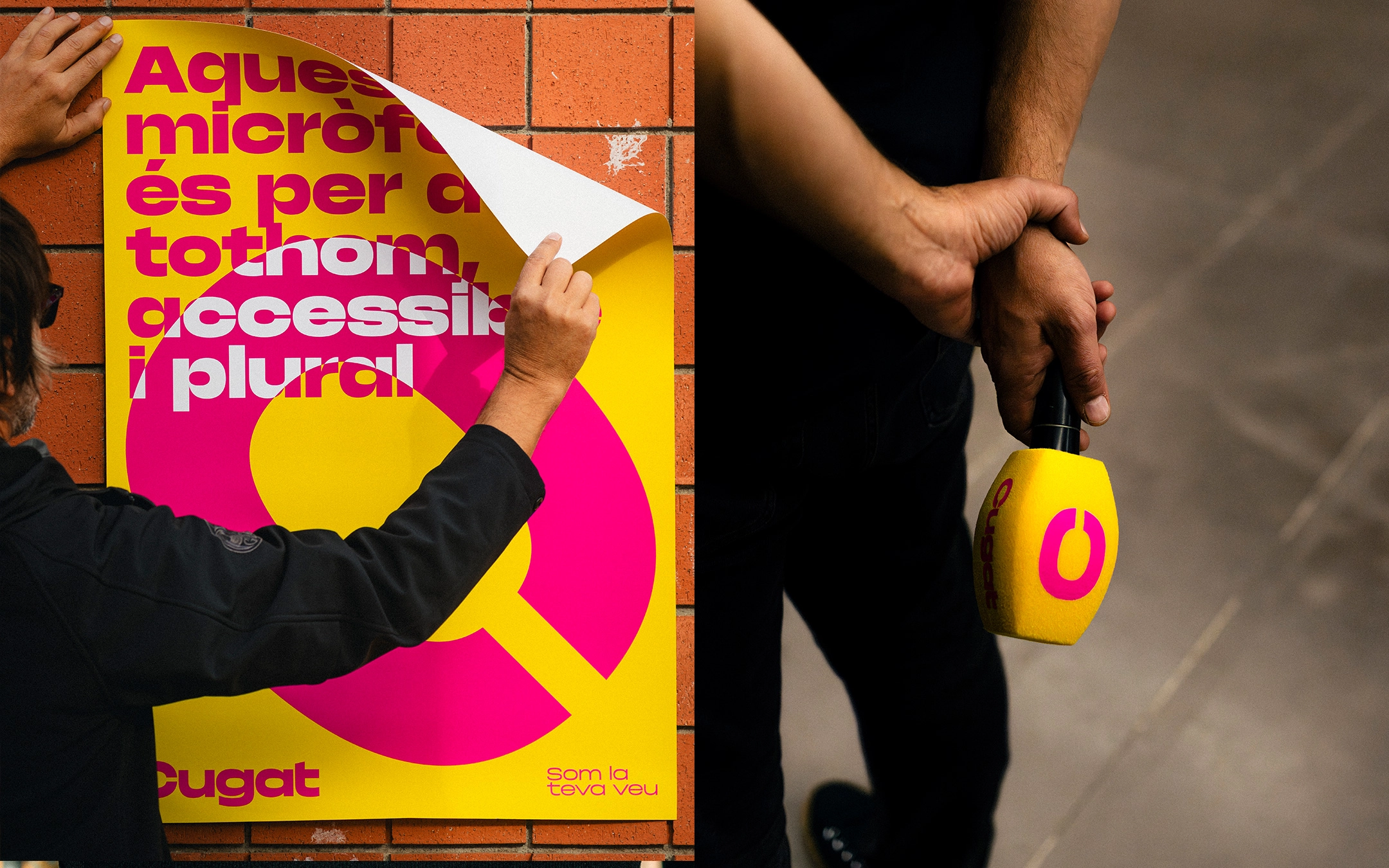 Cugat Mèdia’s identity system – crafted by ESIETE – reimagines public media branding, think radio, TV, podcasts, and digital press. A minimalist typographic gesture unveils a microphone, honoring Ràdio Sant Cugat’s 43-year heritage while symbolizing connection.