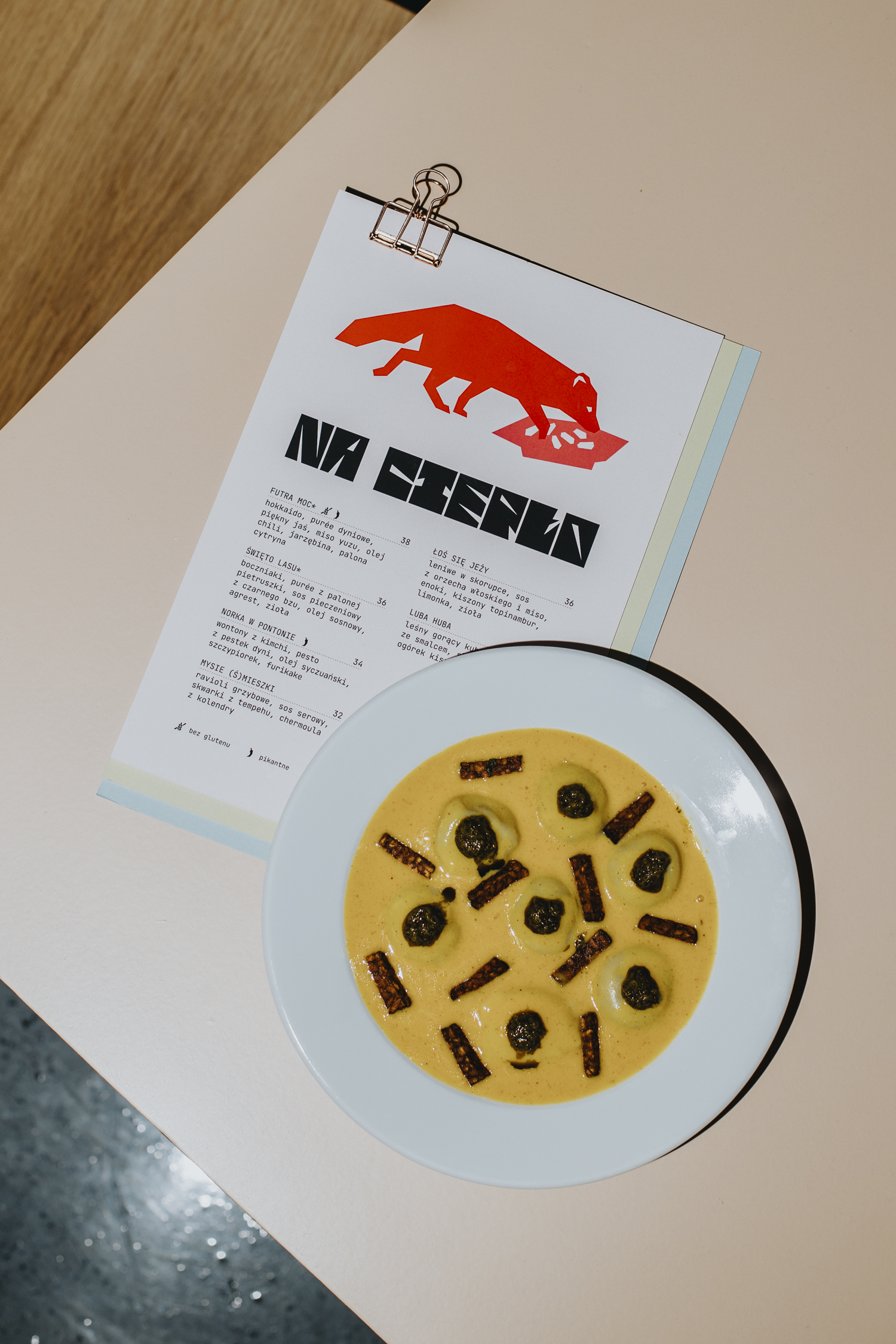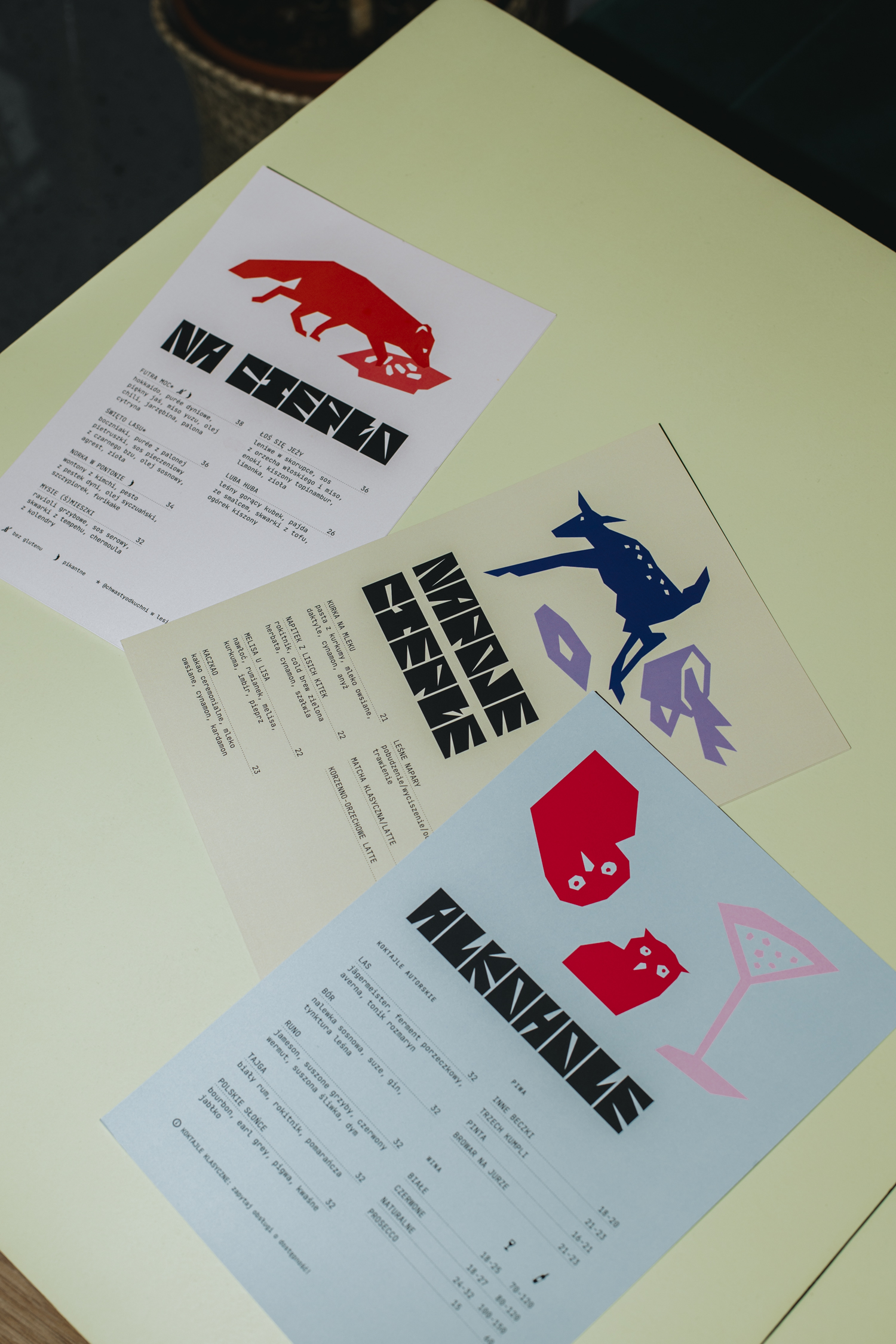 The brand identity for Las was designed by PALL studio (Anc Ciechanowicz and Piotr Lipowicz) with a heavy emphasis on playful typography, illustration and color. Together the illustrations and type form the logo; a combination of the letter L and an illustration of a fox. This continues with the forest animal themed illustrations combined with typography on the menus, advertisements and other branding like the stickers for the take-away bags.
