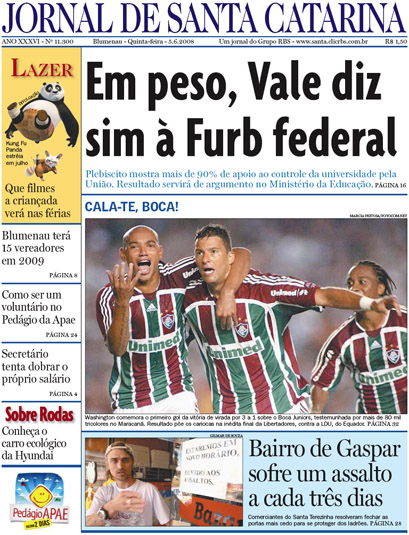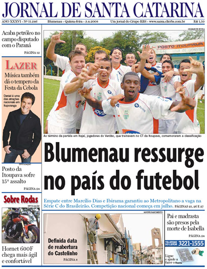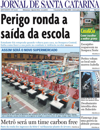 Jornal de Santa Catarina, or Santa for short, is a weekly newspaper from the municipality of Blumenau in southern Brazil. Founded in 1971, it belongs to NSC Comunicação. It was the first newspaper in the state of Santa Catarina and one of the first in the country to have an online edition with real time news updates.