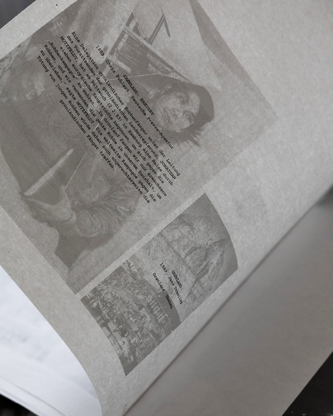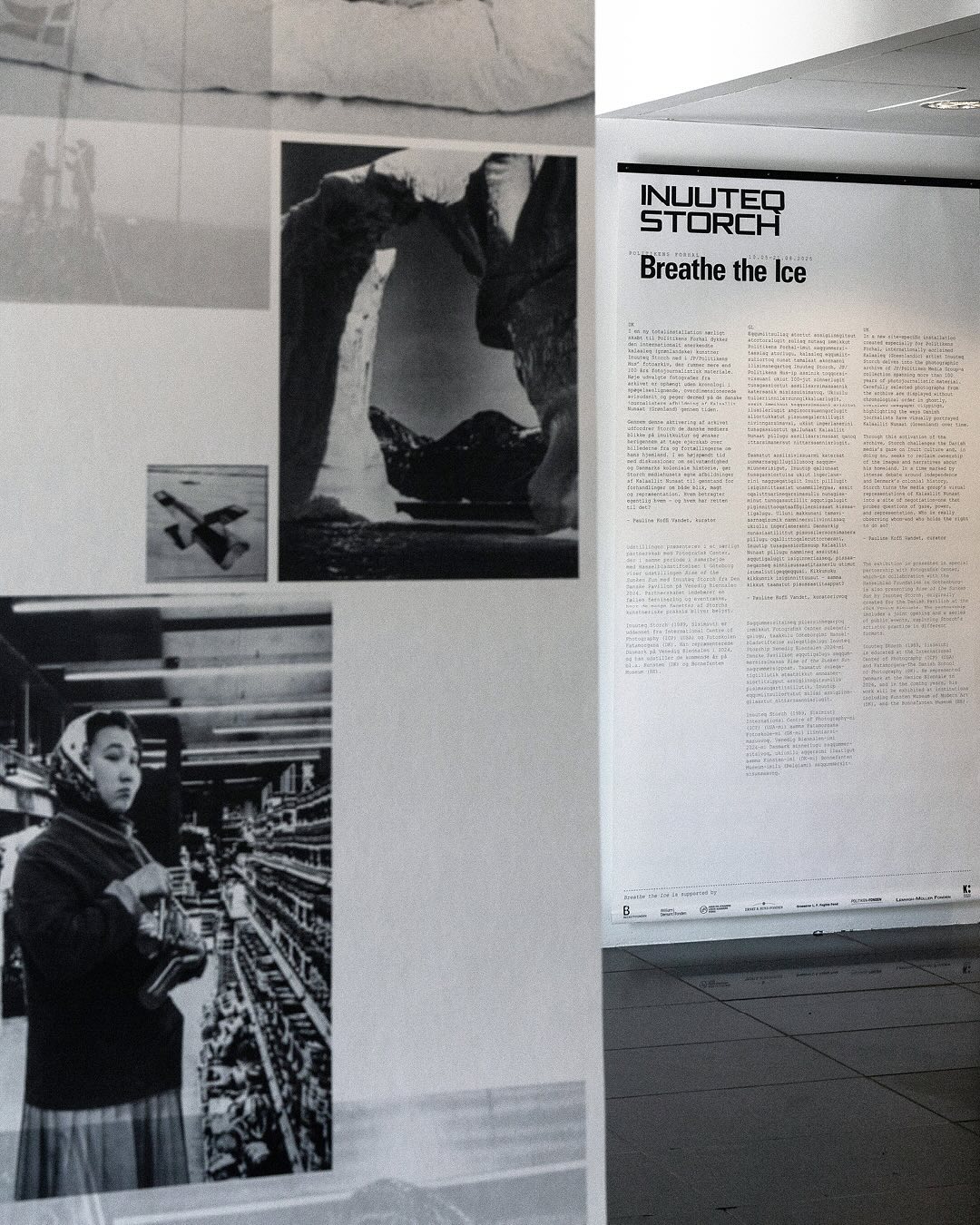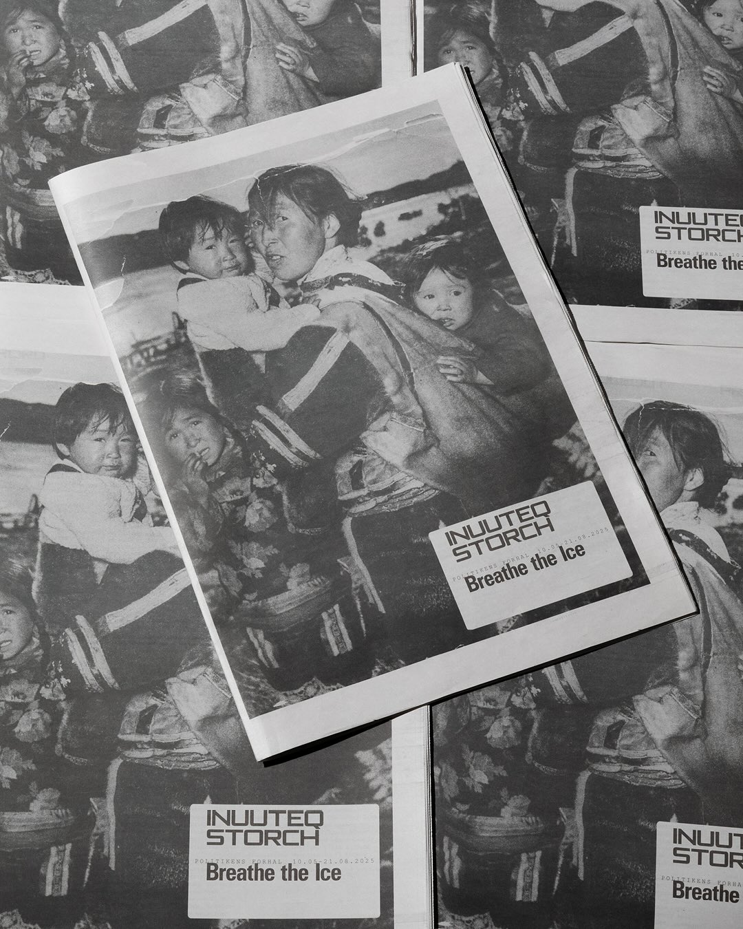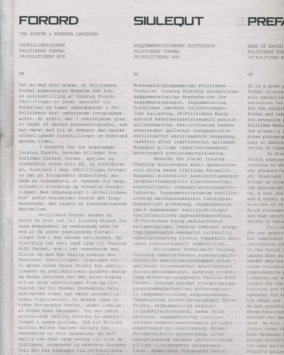 Exhibition design and newspaper-like catalog designed by Spine Studio for Inuuteq Storch’s Breathe the Ice exhibition at Politikens Forhal.