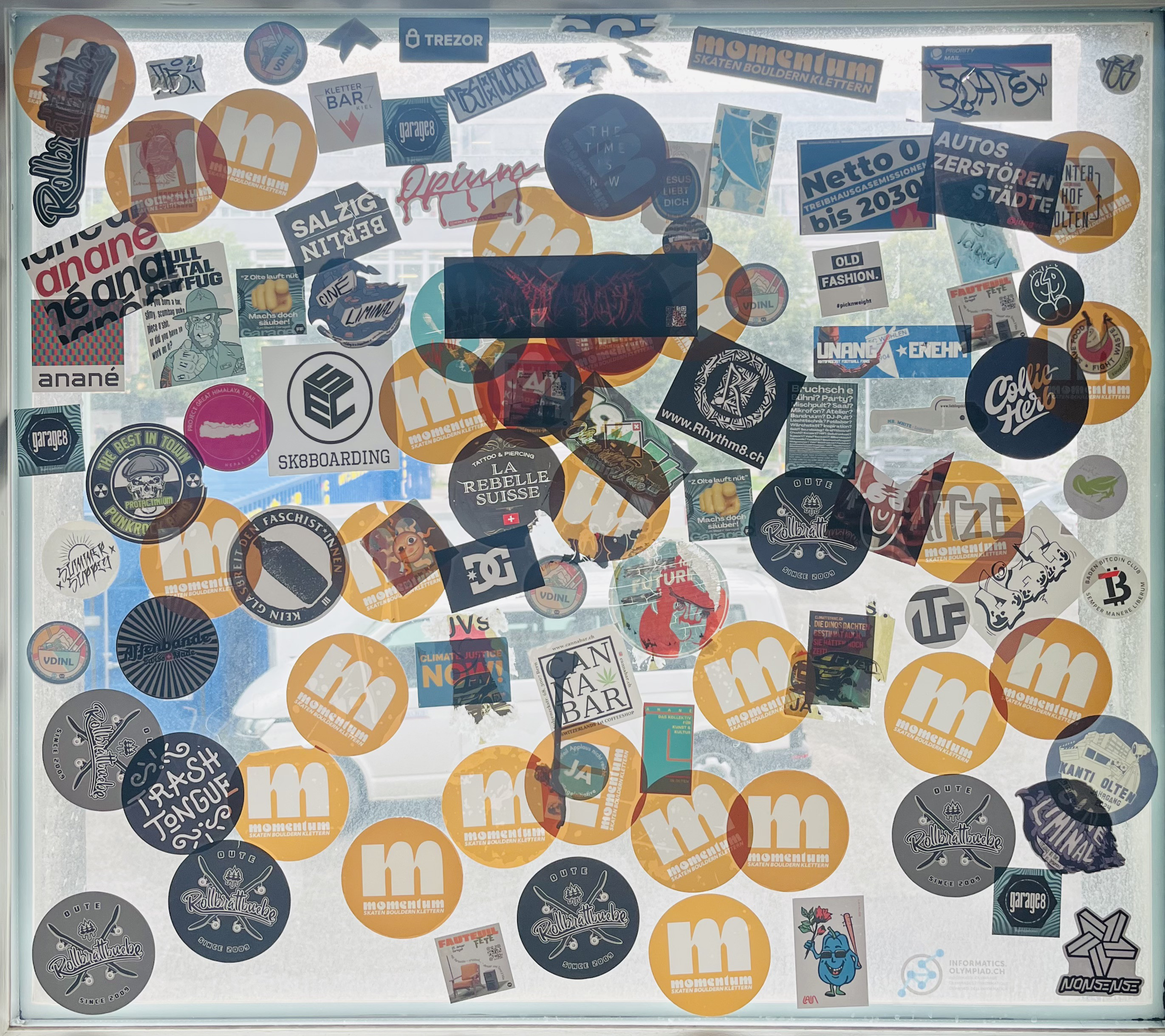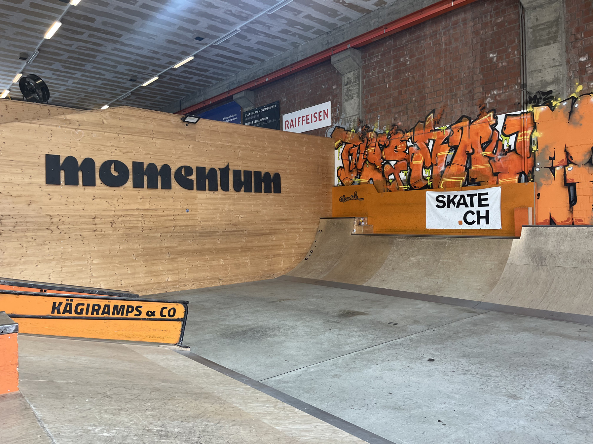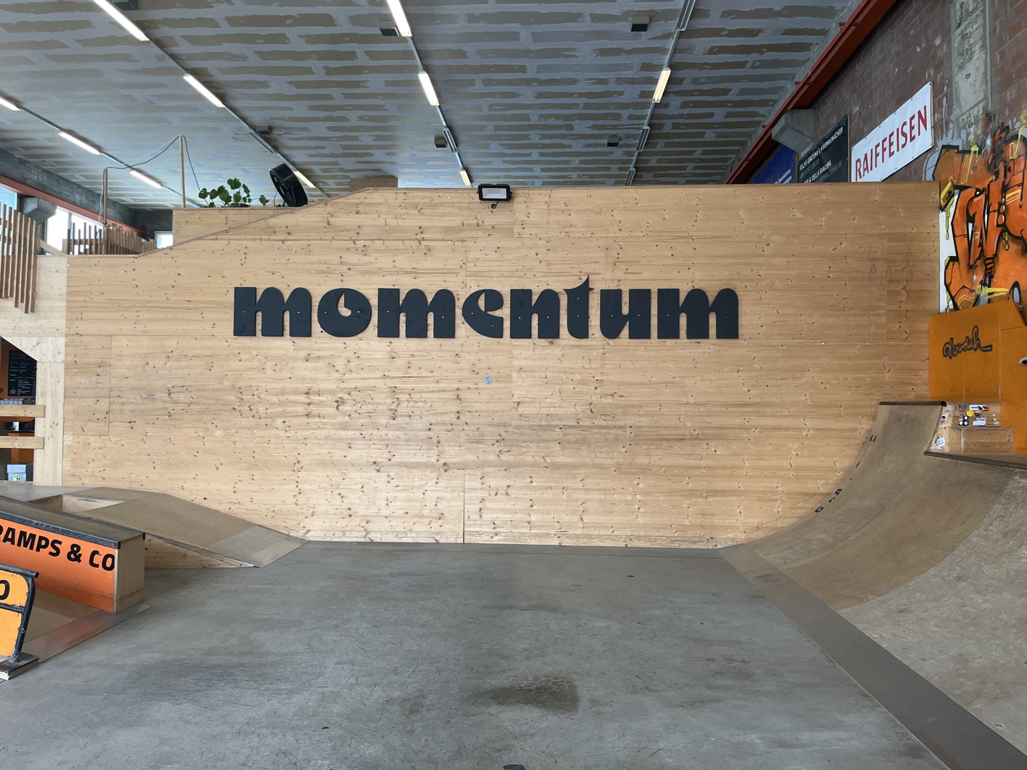 The logo typeface for momentum has been “found on the internet” by one of the operators, Tobias Flotron. It’s Motter Ombra which has also been applied in big hand-cut wooden letters to one of the walls. Next to this main logo font, the subtitle is Avenir Next Bold Italic. On the ramps are vinyl letters by their producer KÄGIRAMPS & CO. They appear to be from Cairo Black 900, the Arabic version of Titillum that is less fat than its Latin counterpart.