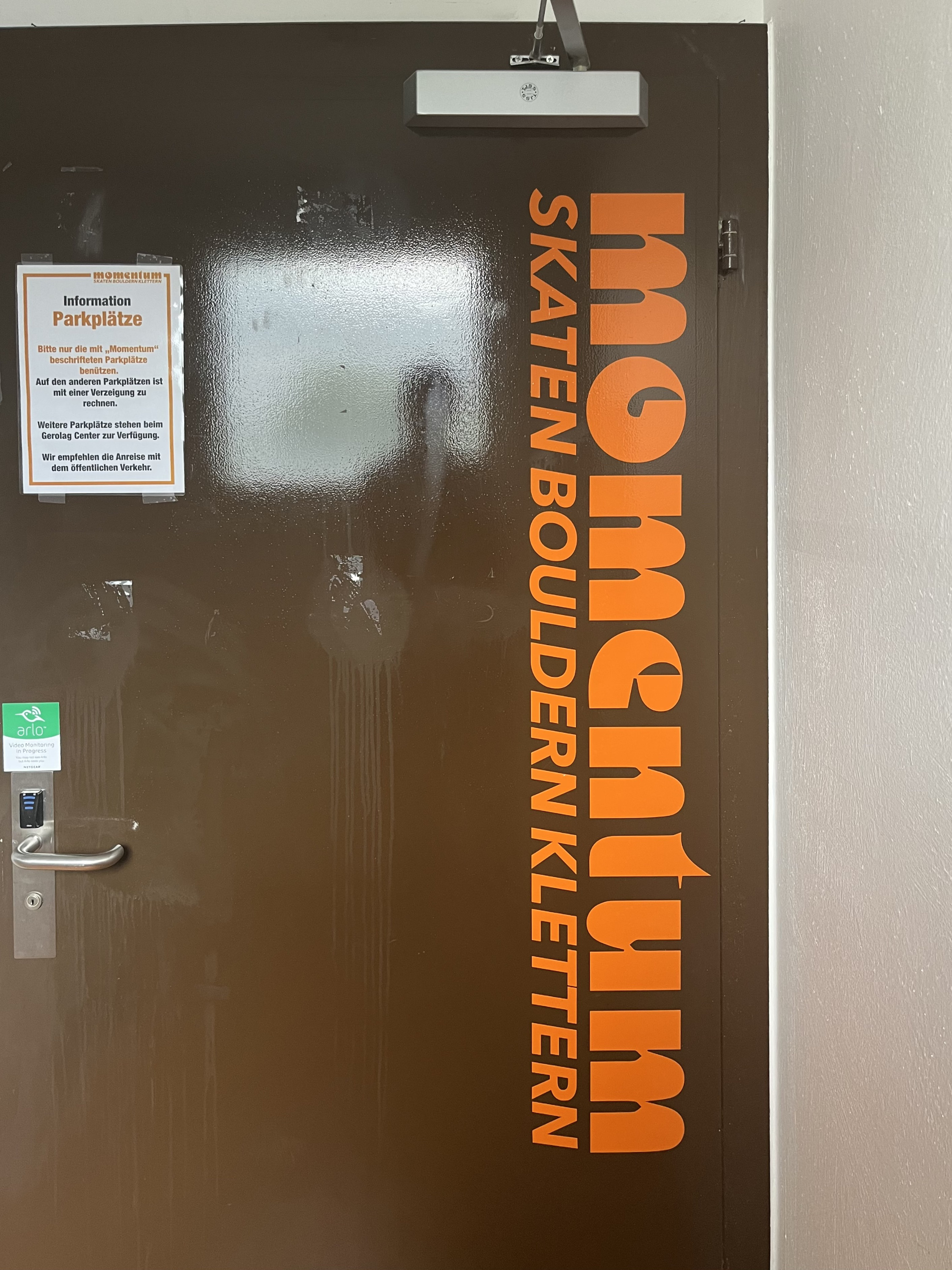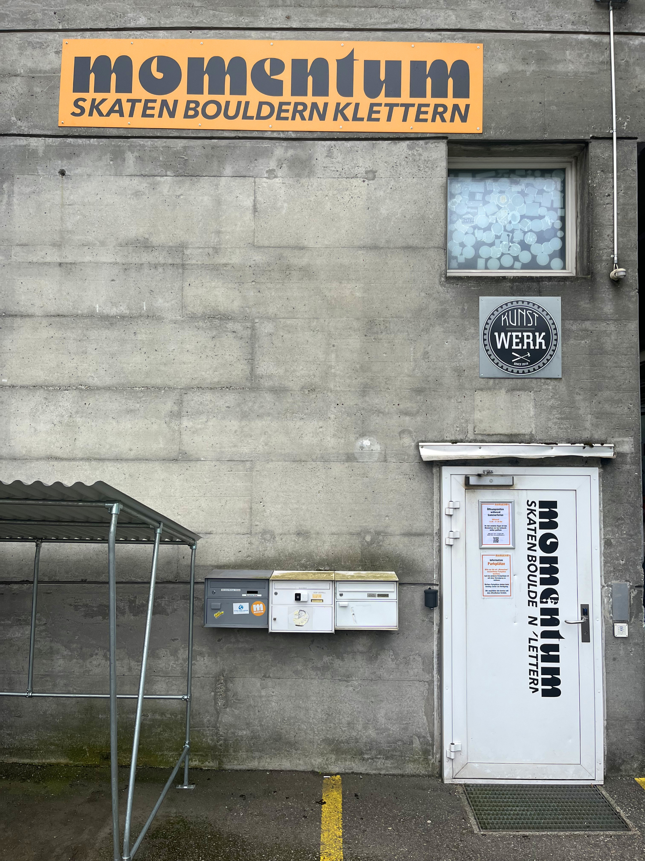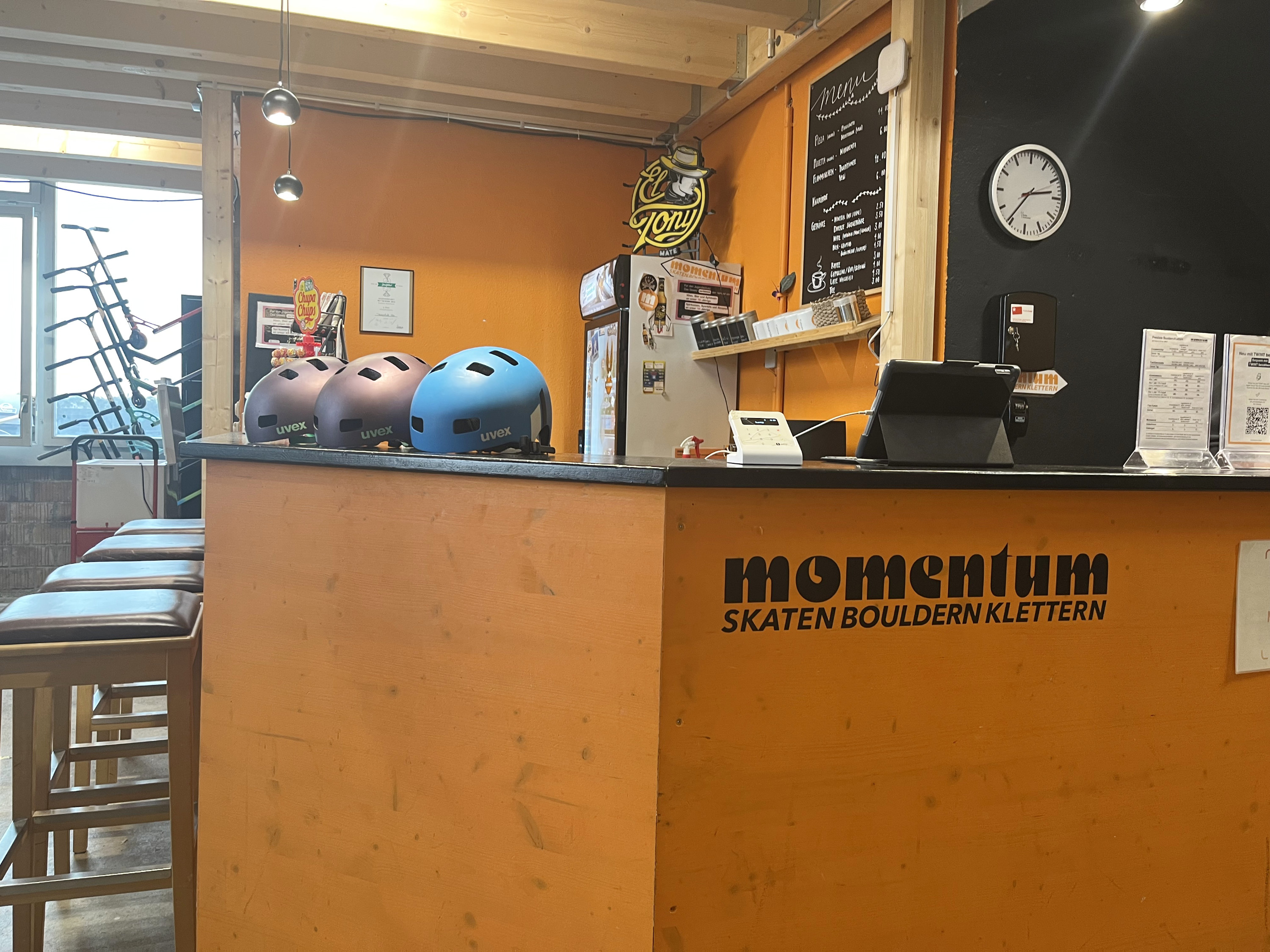 In the industrial district next to the train track in Olten, Switzerland, there’s an indoor skate and boulder hall on the second floor of an industrial building. At our visit, it was run by a single person who took care of ticketing, rentals, introductions, a small bar, and the tiny shop in the corner. The note saying that there was no pizza or tarte flambée might have been related to this understaffed situation.
