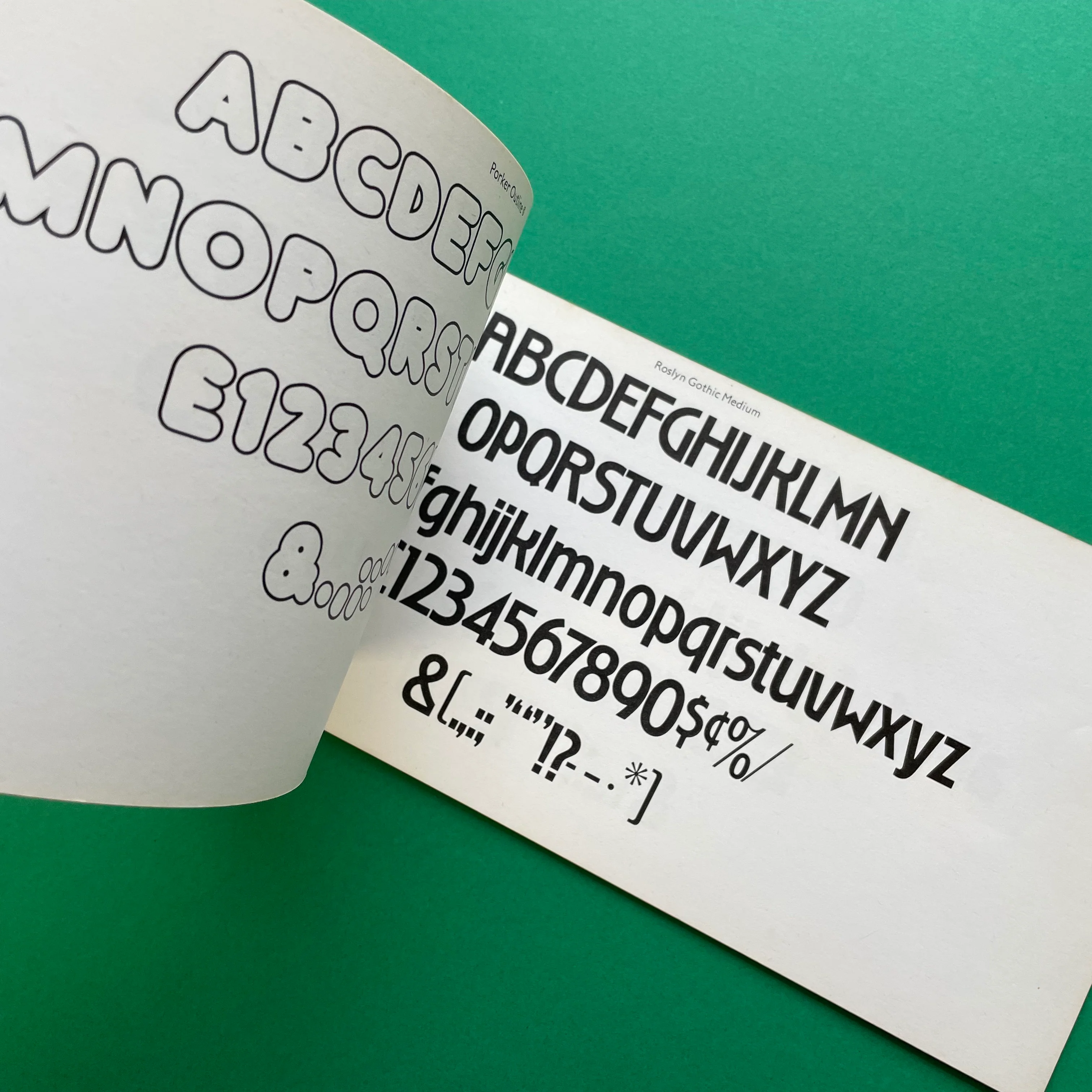 Porker is a film typeface that, as you showed, appears in catalogs by Alphabet Photosetting – without credits, as far as I know. Roundel is a typeface that was produced for dry transfer lettering by Mecanorma, the French Letraset competitor. In their 1975 catalog, it’s credited to John Hamon. I compared Porker to Roundel: apart from the contour in the latter, they are basically the same design. This suggests that Porker is by Hamon as well. A phototype version of Roundel is listed in a 1984 catalog by Alphabet Photosetting, too. It looks like the design originated at the London-based phototype company – in three styles: Porker, Porker Outline, and Roundel.