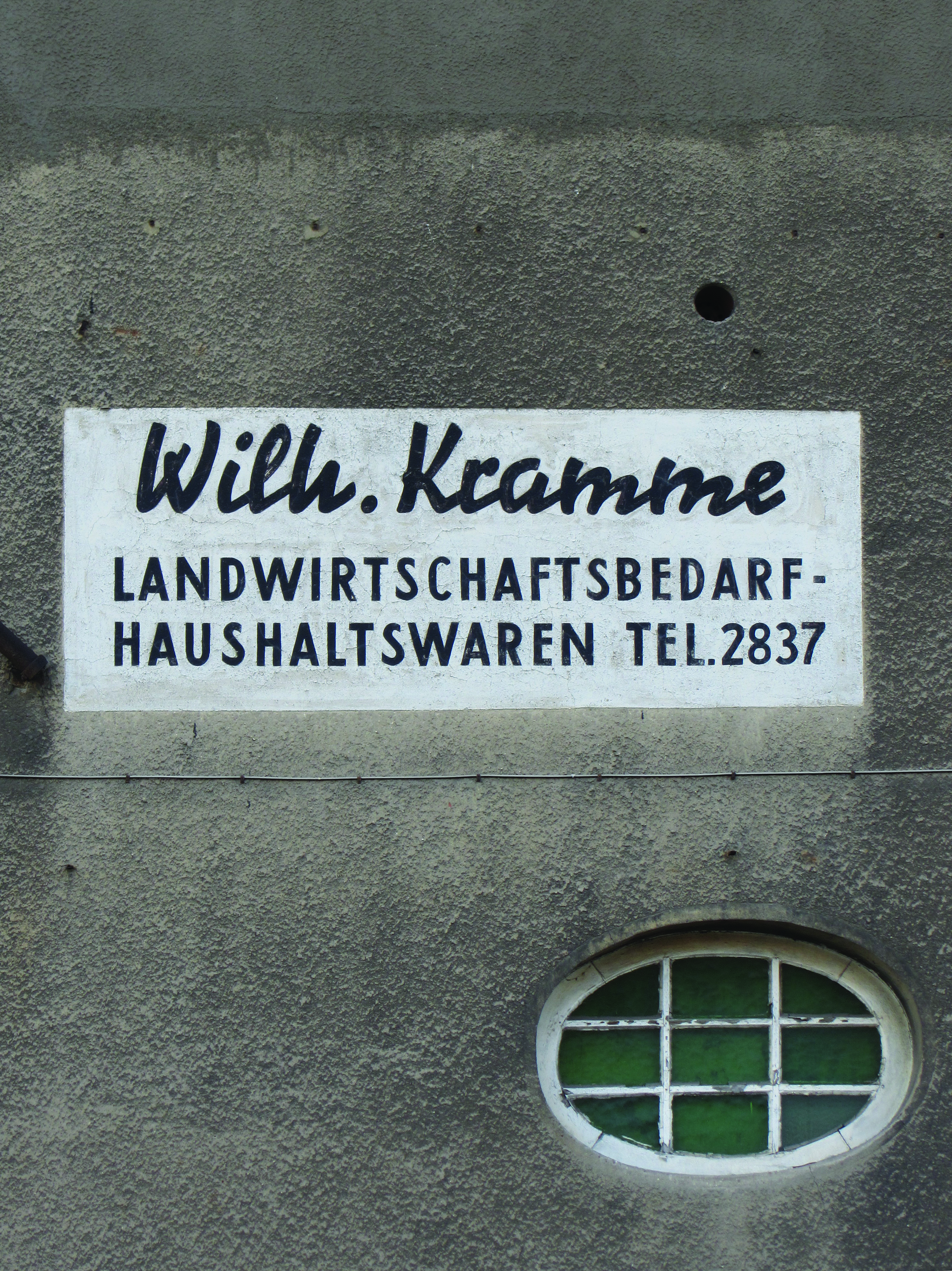Painted sign for Wilhelm Kramme, agricultural supplies and household goods in Lage (Lippe), Germany. The script is clearly modeled after Signal. The business is still in existence, and it still has its four-digit phone number.
