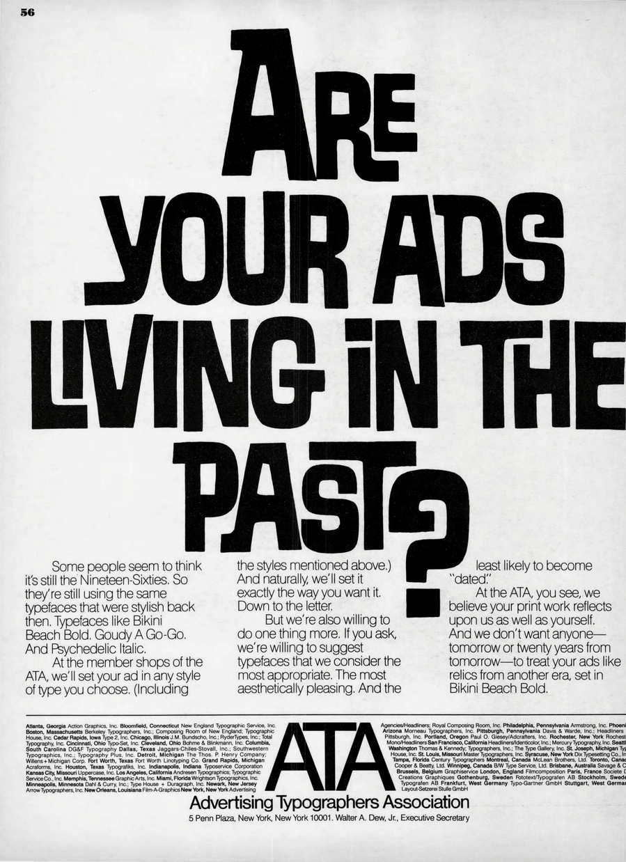 At the ATA, you see, we believe your print work reflects upon us as well as yourself. And we don’t want anyone—tomorrow or twenty years from tomorrow—to treat your ads like relics from another era, set in Bikini Beach Bold.