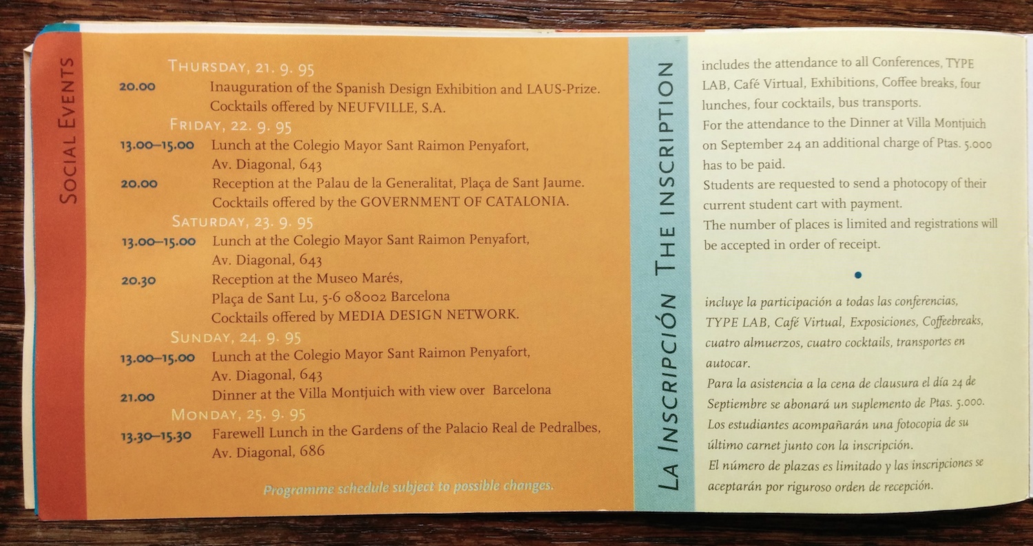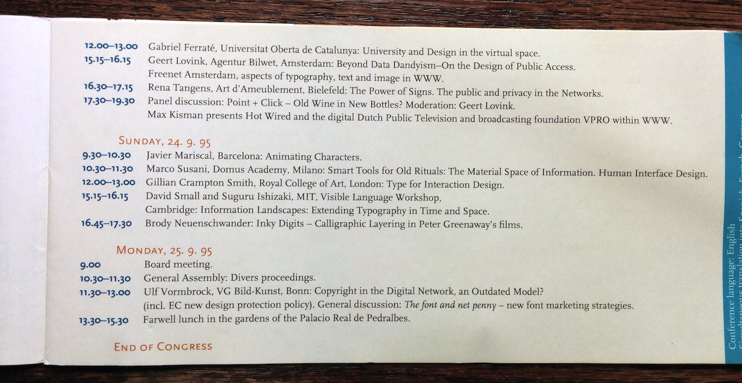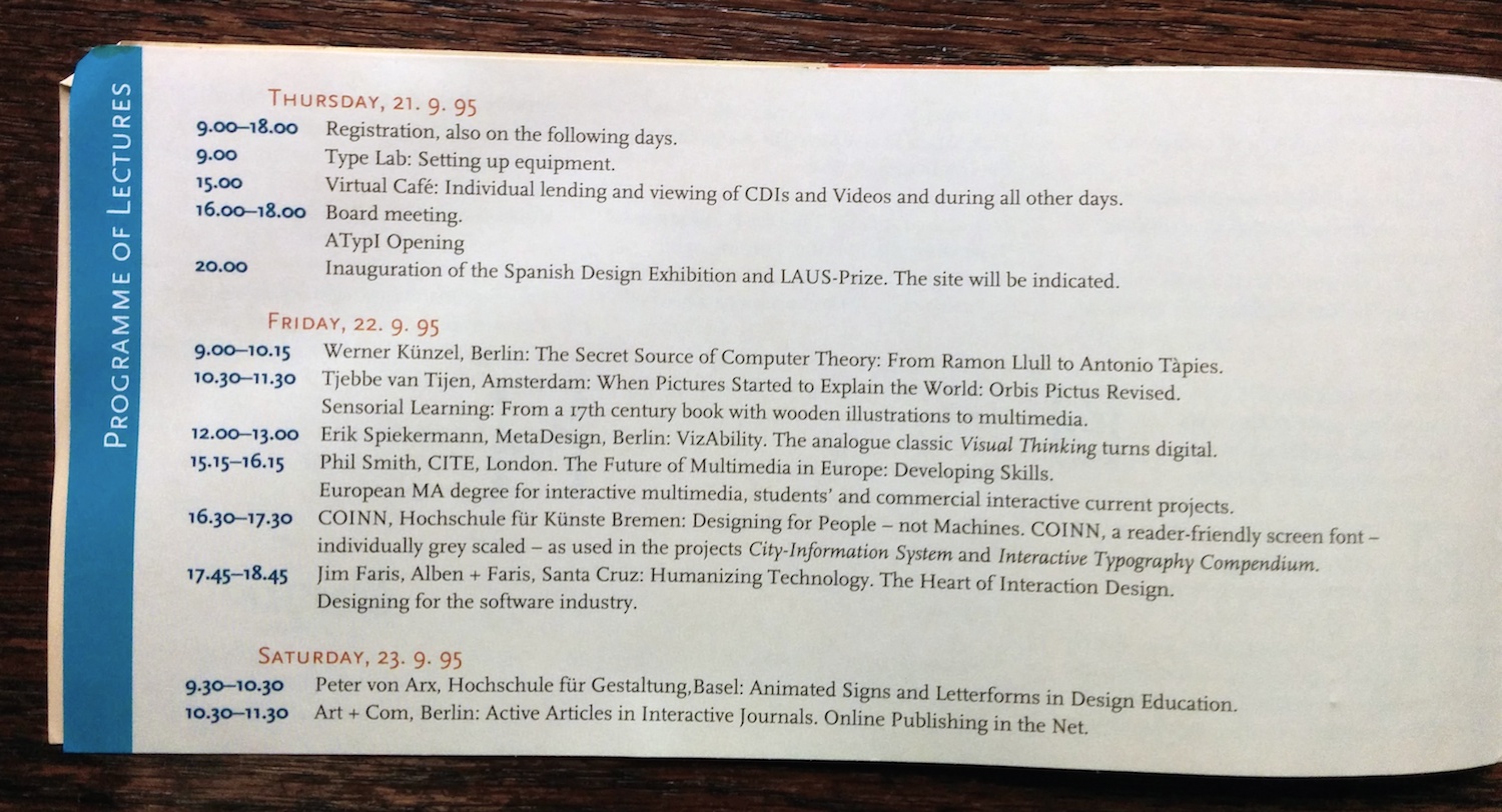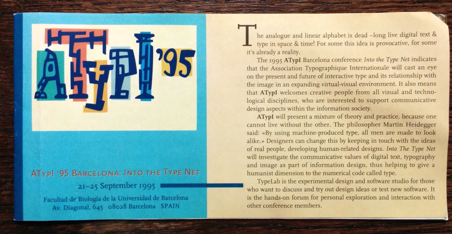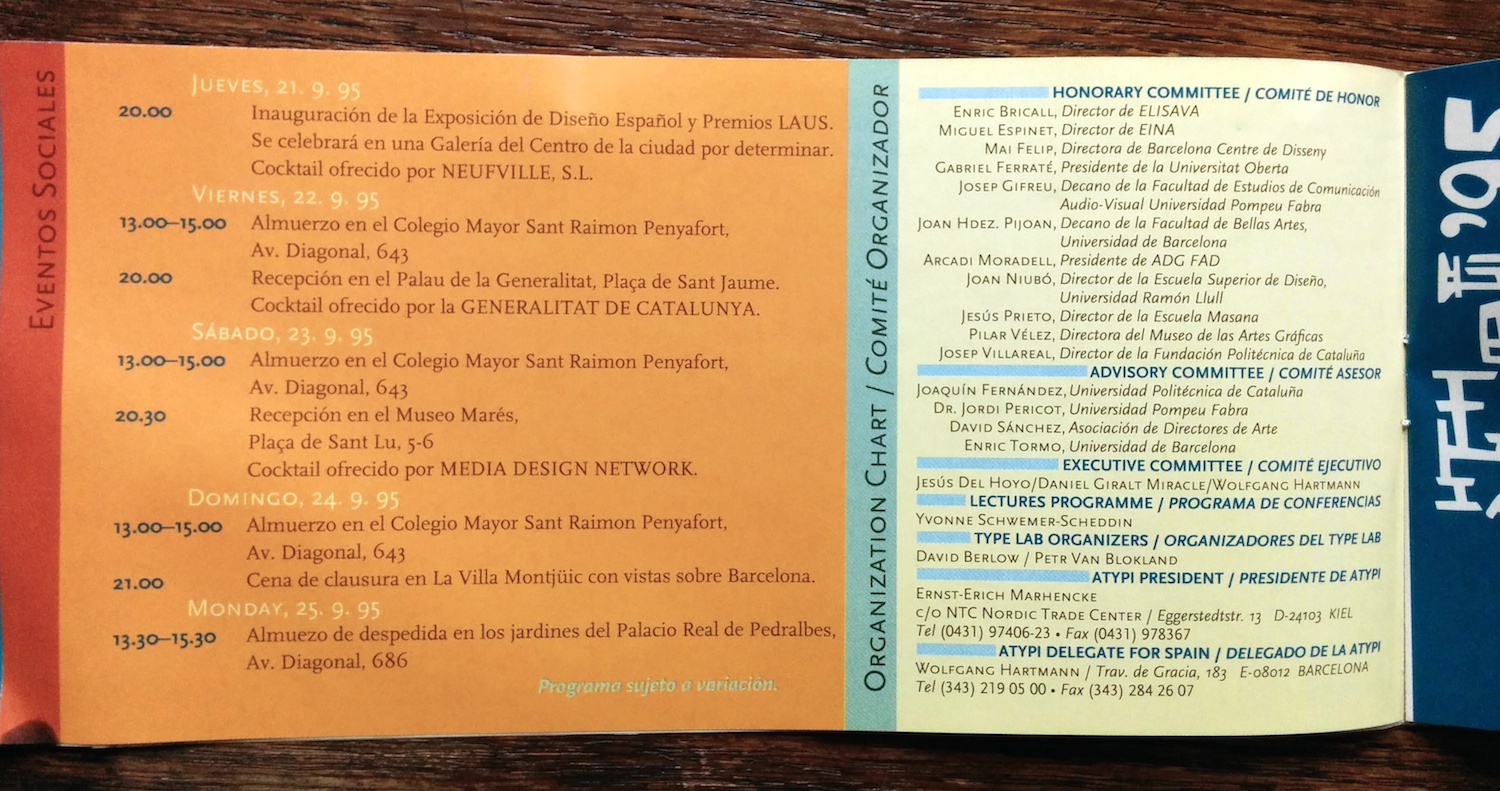 The advance program (in English and Spanish) for the 1995 conference of the Association Typographique Internationale. The logo is by Javier Mariscal and the rest of the booklet was probably designed by his studio as well.