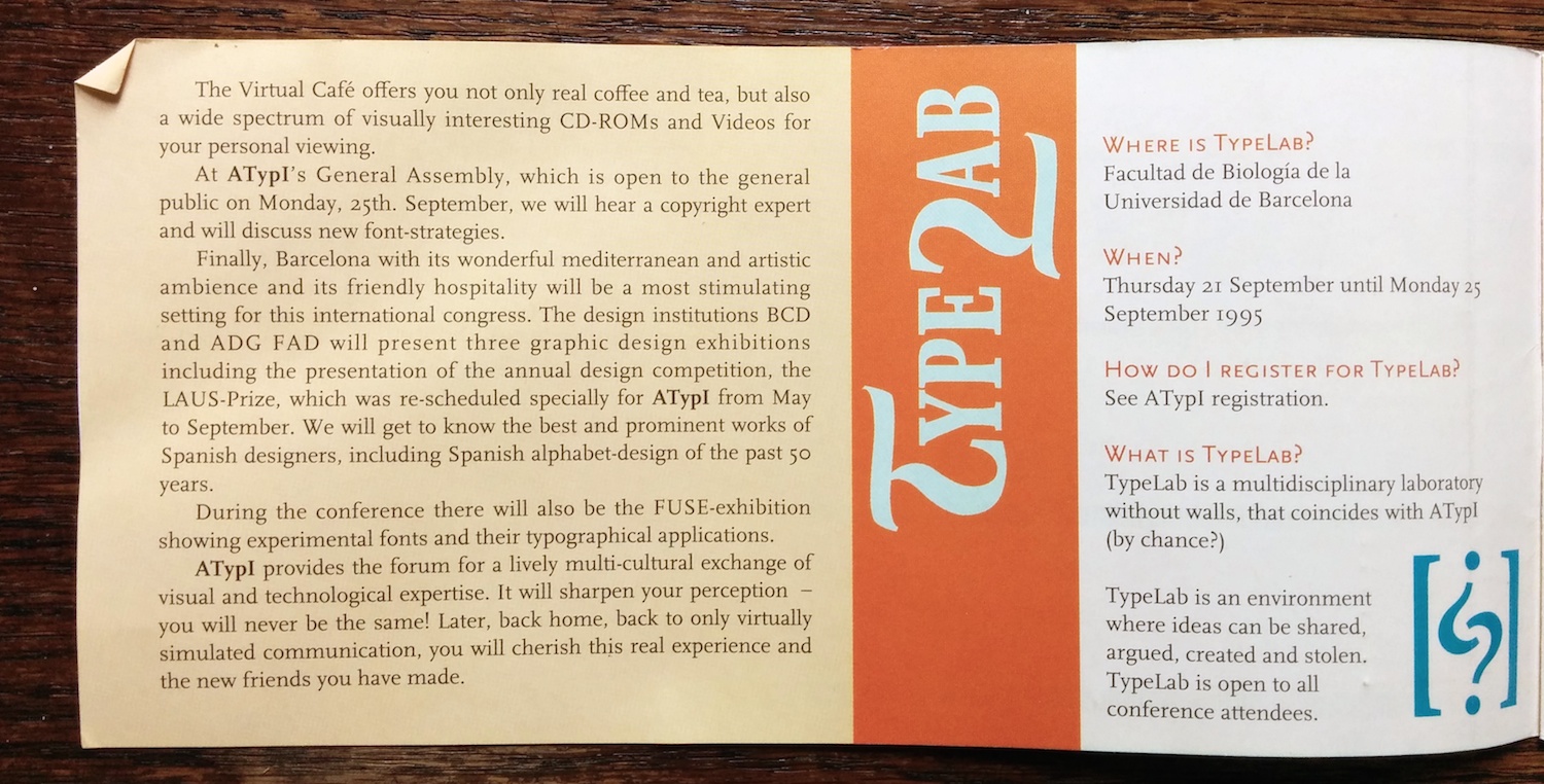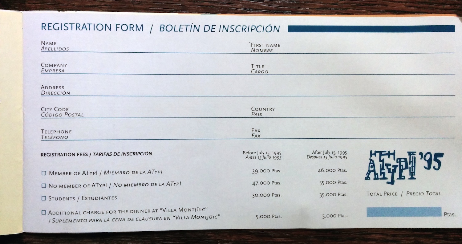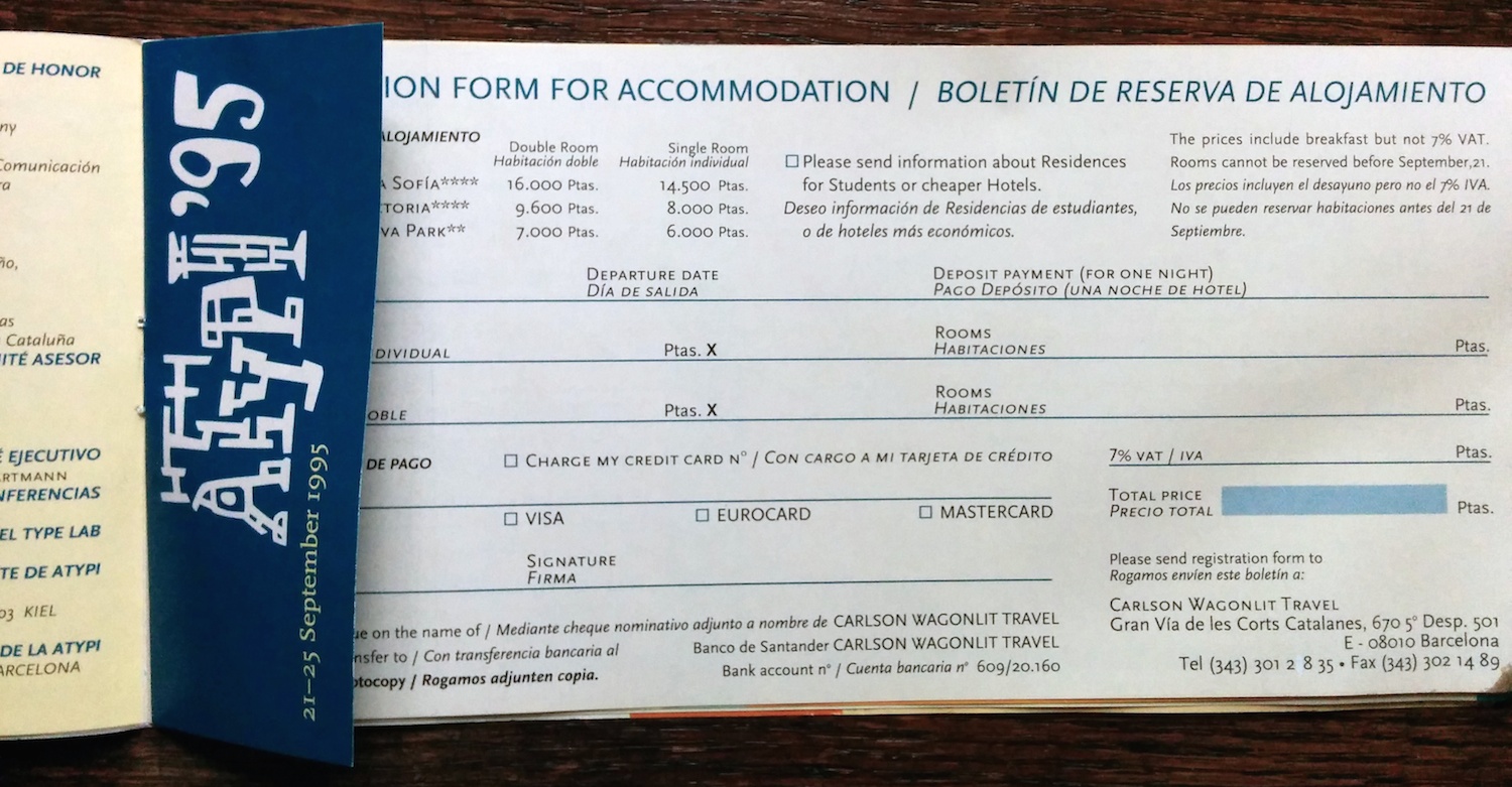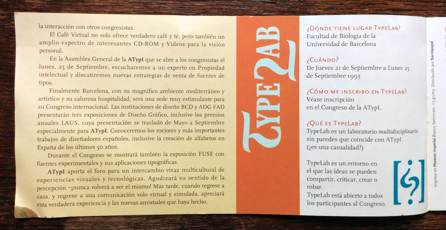 The advance program (in English and Spanish) for the 1995 conference of the Association Typographique Internationale. The logo is by Javier Mariscal and the rest of the booklet was probably designed by his studio as well.