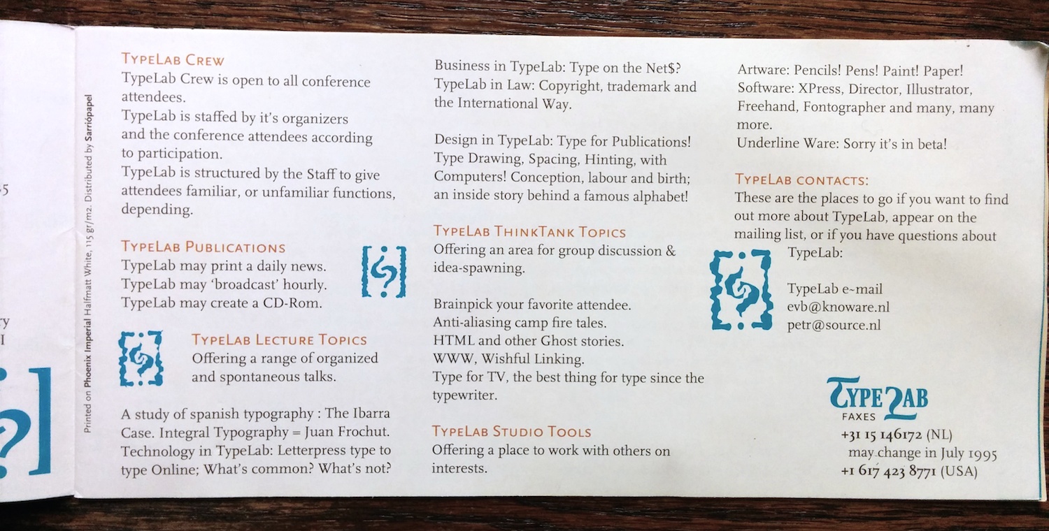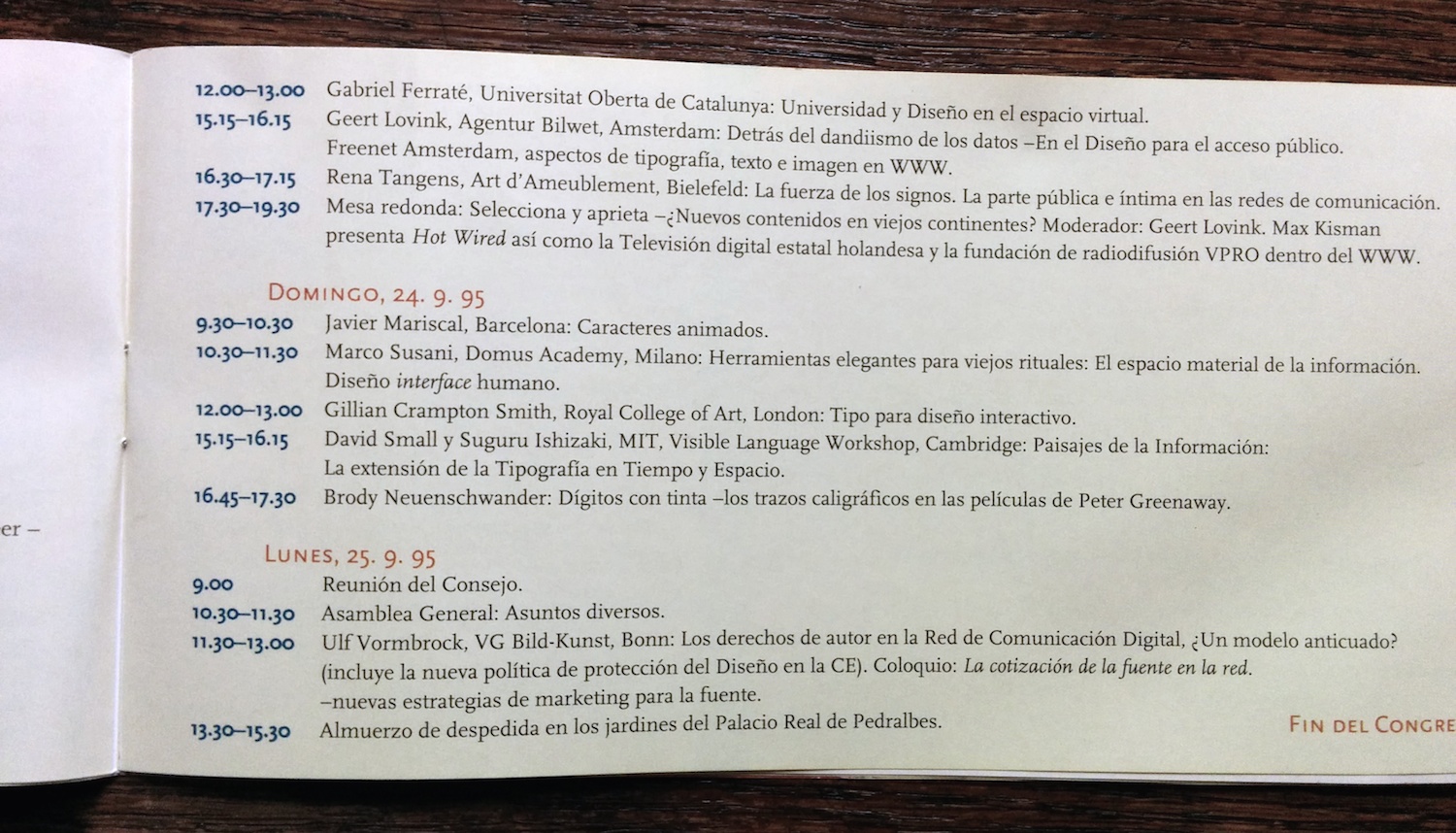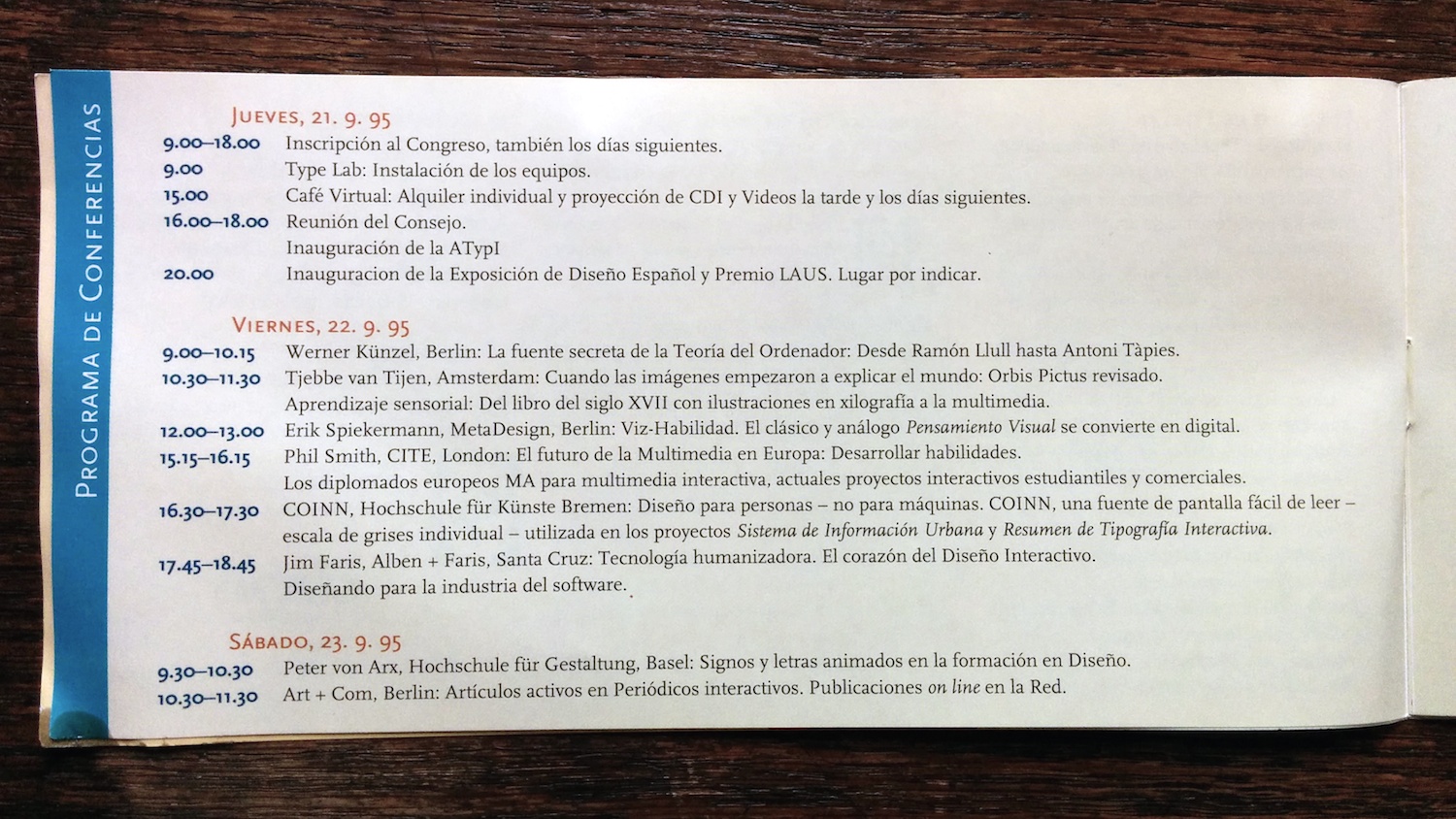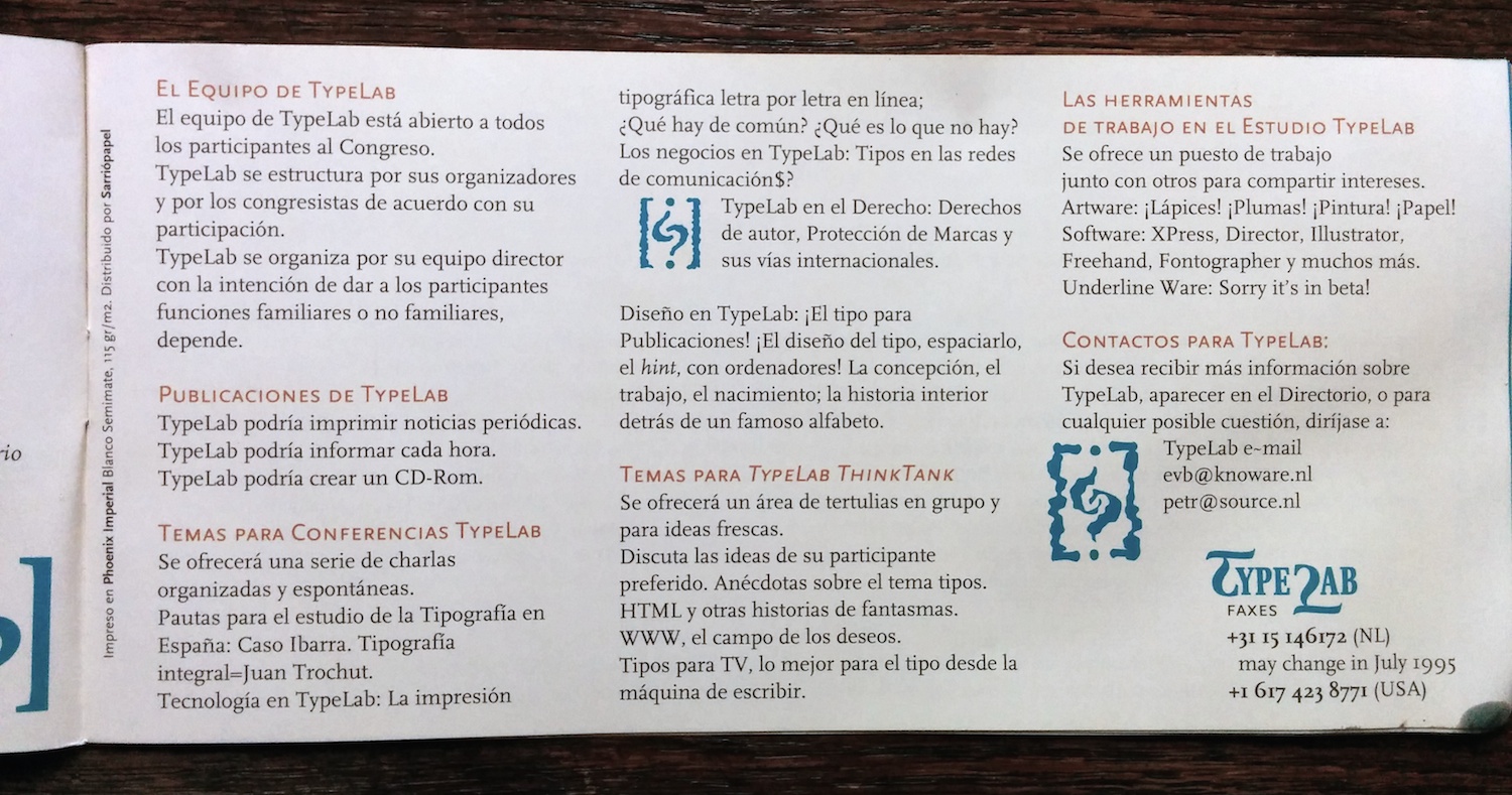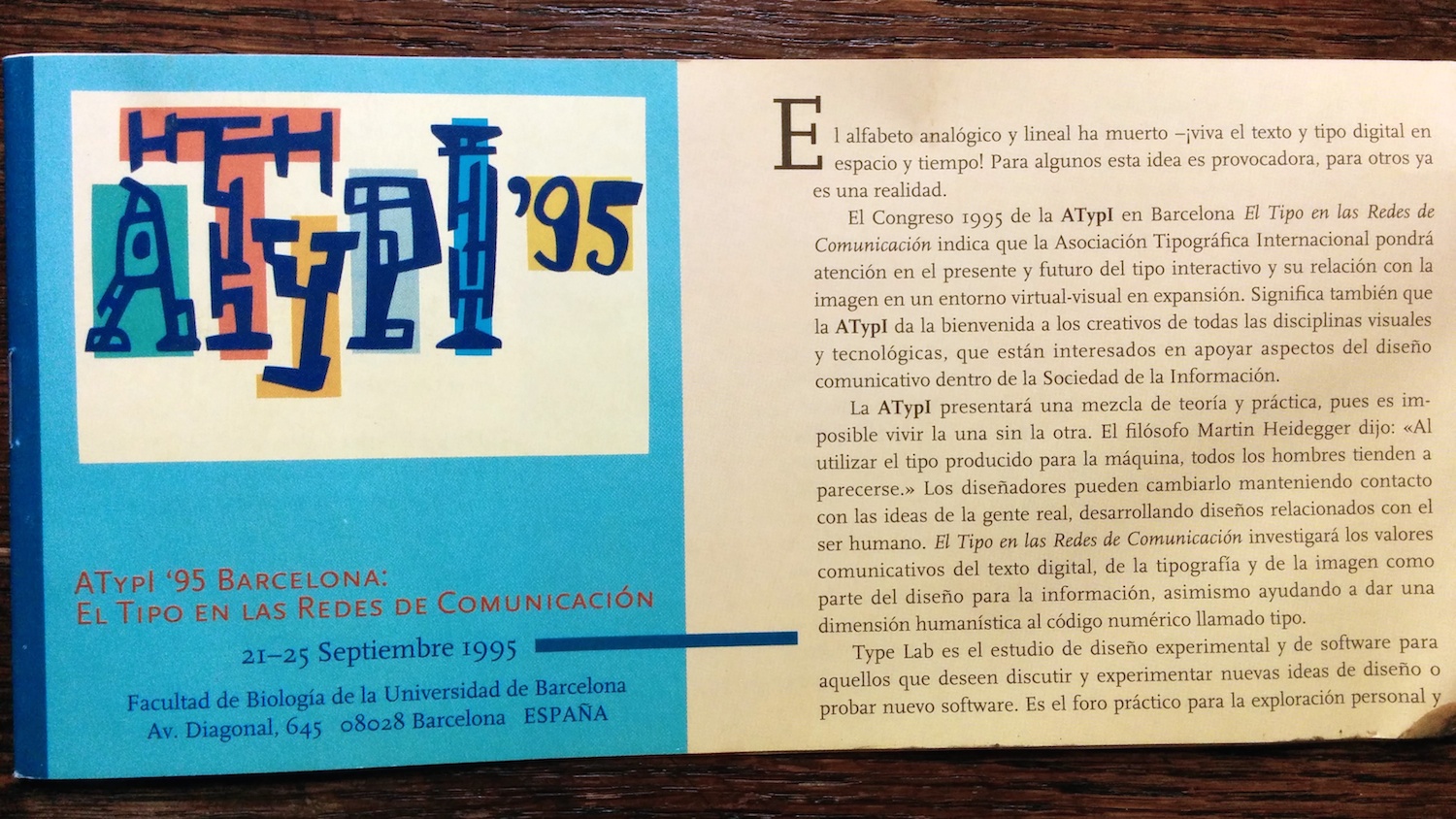 The advance program (in English and Spanish) for the 1995 conference of the Association Typographique Internationale. The logo is by Javier Mariscal and the rest of the booklet was probably designed by his studio as well.