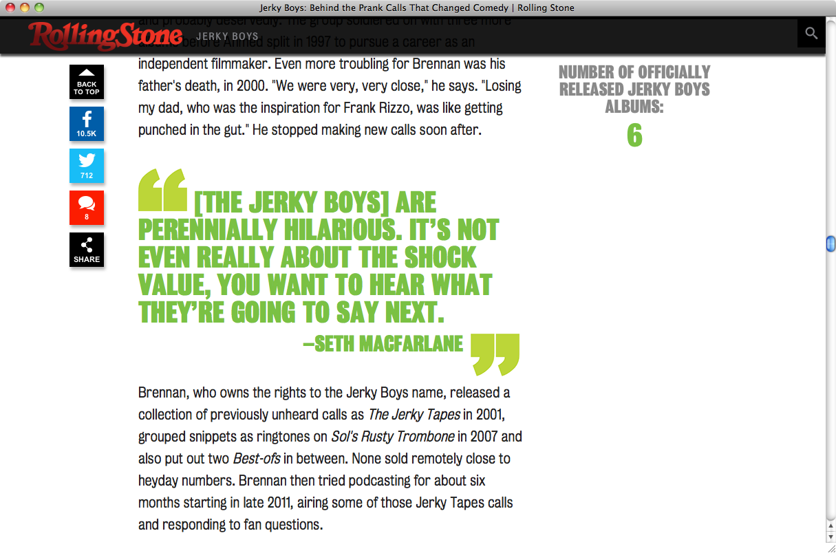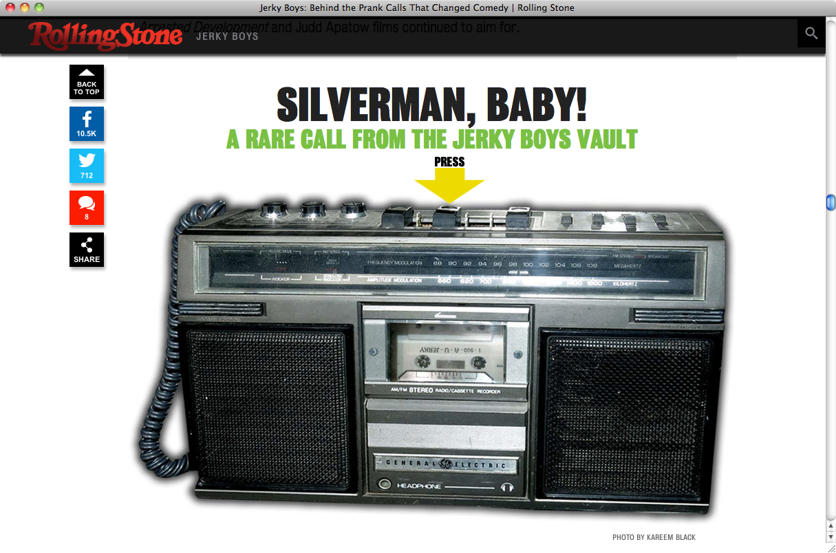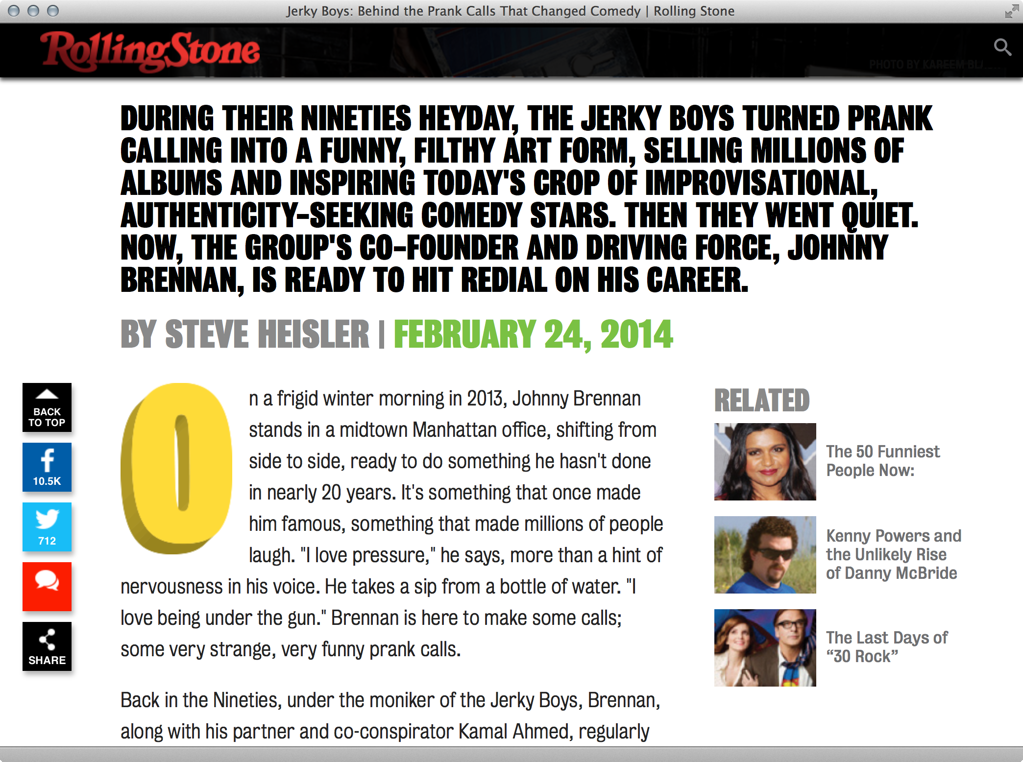 Jerky Boys is an art-directed post on Rolling Stone about the group’s legendary prank calling activities in the 1990s. The designers picked Bureau Grot Light for body copy — a less seen but interesting and fitting choice — the Book weight for subheads and asides, and the Black style for heads, intro and fun blinking drop caps. ’90s all around.