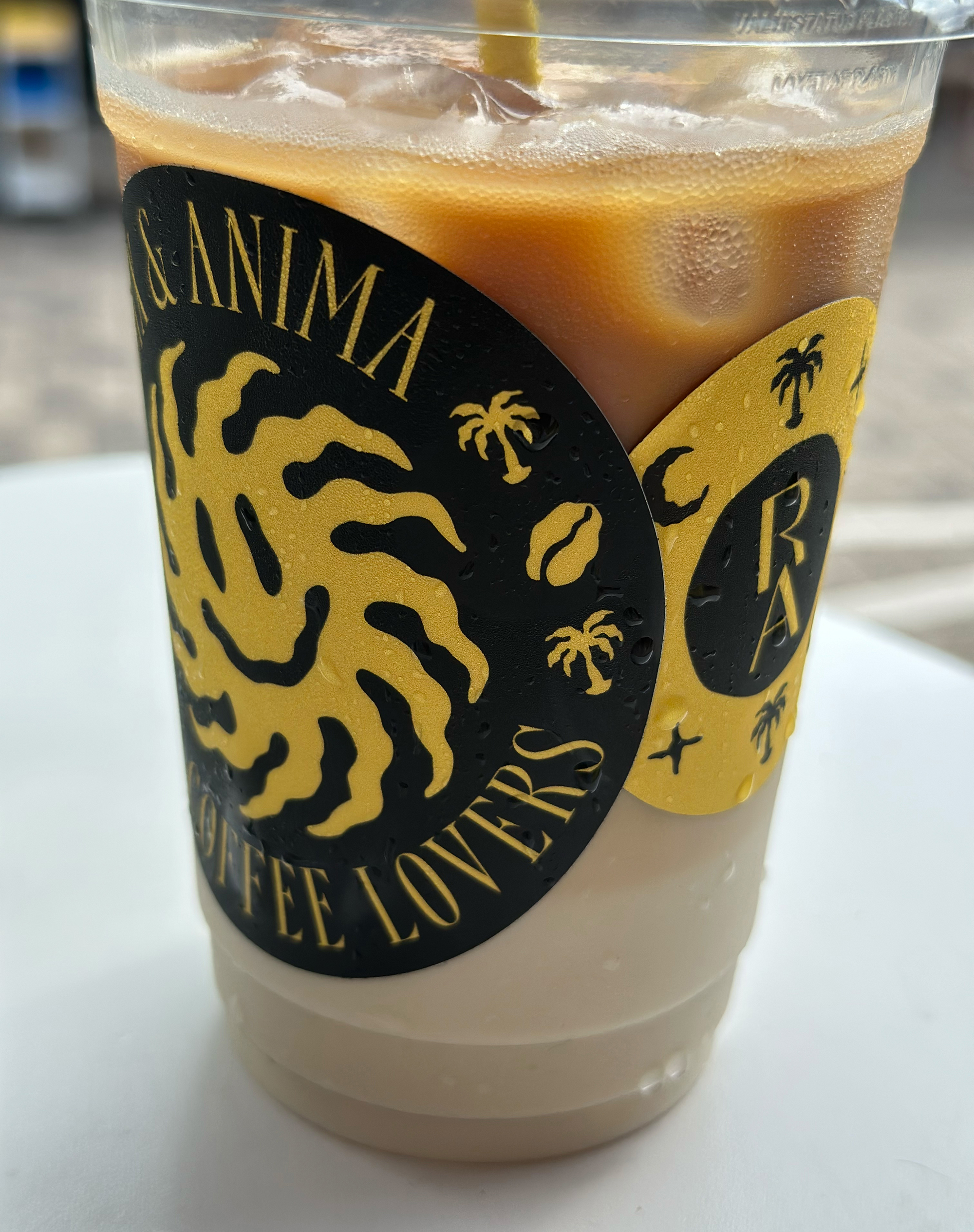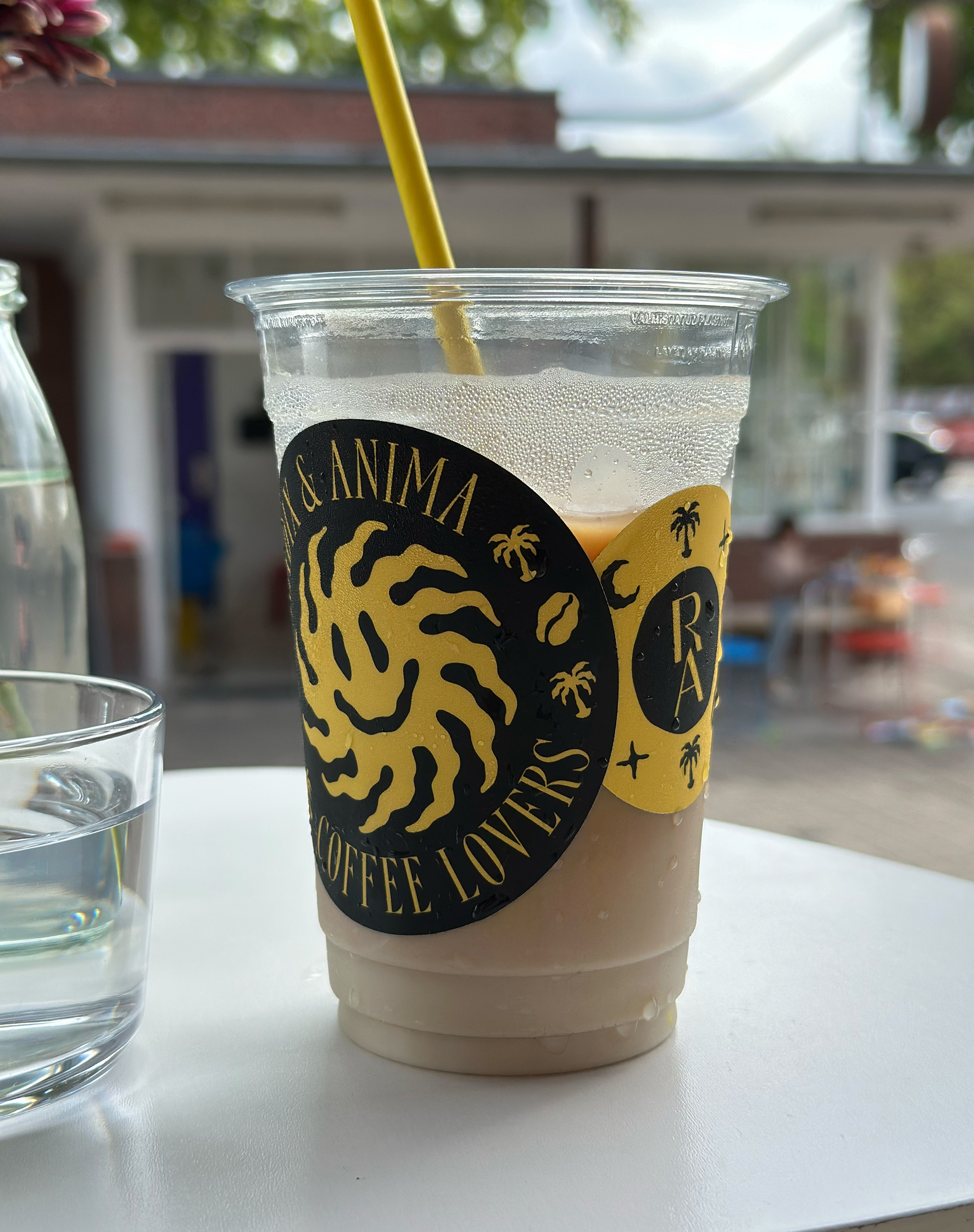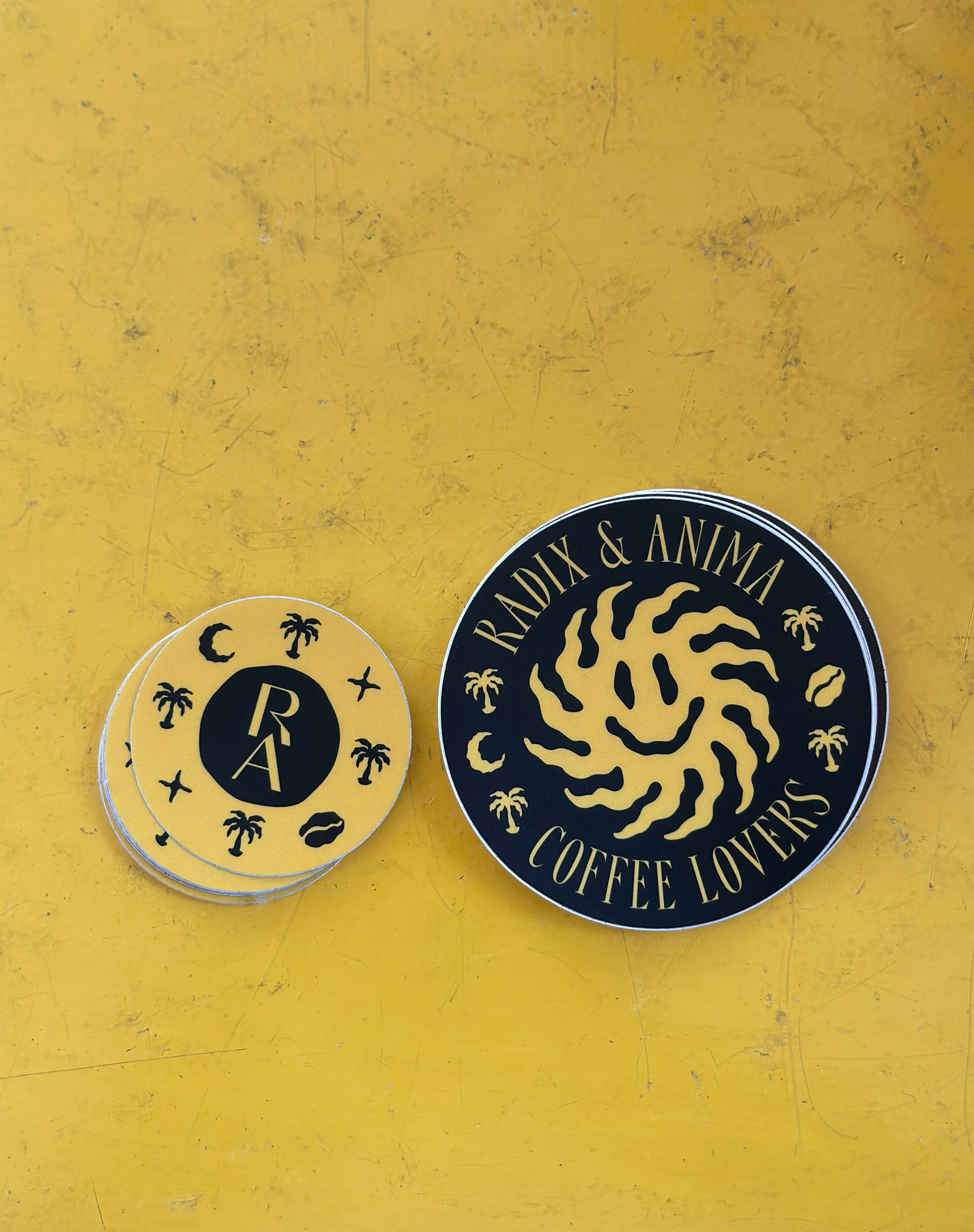 To promote their iced coffees during the summer, Radix & Anima designed two eye-catching stickers in black and yellow. The larger sticker uses Attendorn and reads “Radix & Anima / Coffee Lovers”. The smaller sticker features an “RA” monogram logo and uses Before Paris. Both typefaces are from Azuliq Type. Customers can take the stickers for free, and they are placed on the to-go cups of summer drinks. The café values sustainability, but to-go cups are available upon request.
