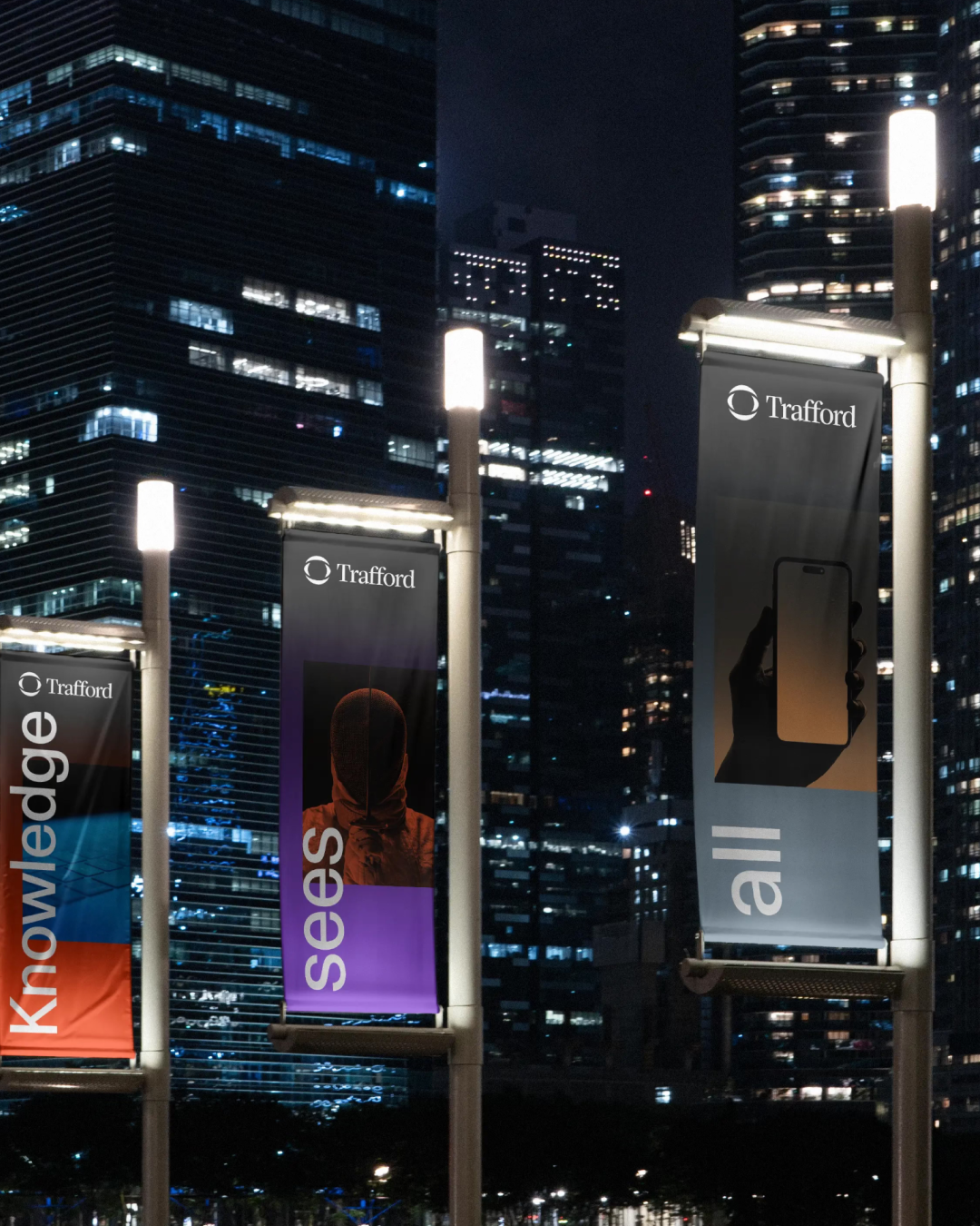 The brand’s design system centers around the interplay between light and darkness, utilizing dynamic gradients that transition from deep shadows to illuminated areas—a direct metaphor for bringing hidden cyber threats into the light. This visual language reinforces Trafford’s core message that “Knowledge sees all” by creating atmospheric compositions where threats emerge from darkness only to be exposed by the vigilant eye of expertise.