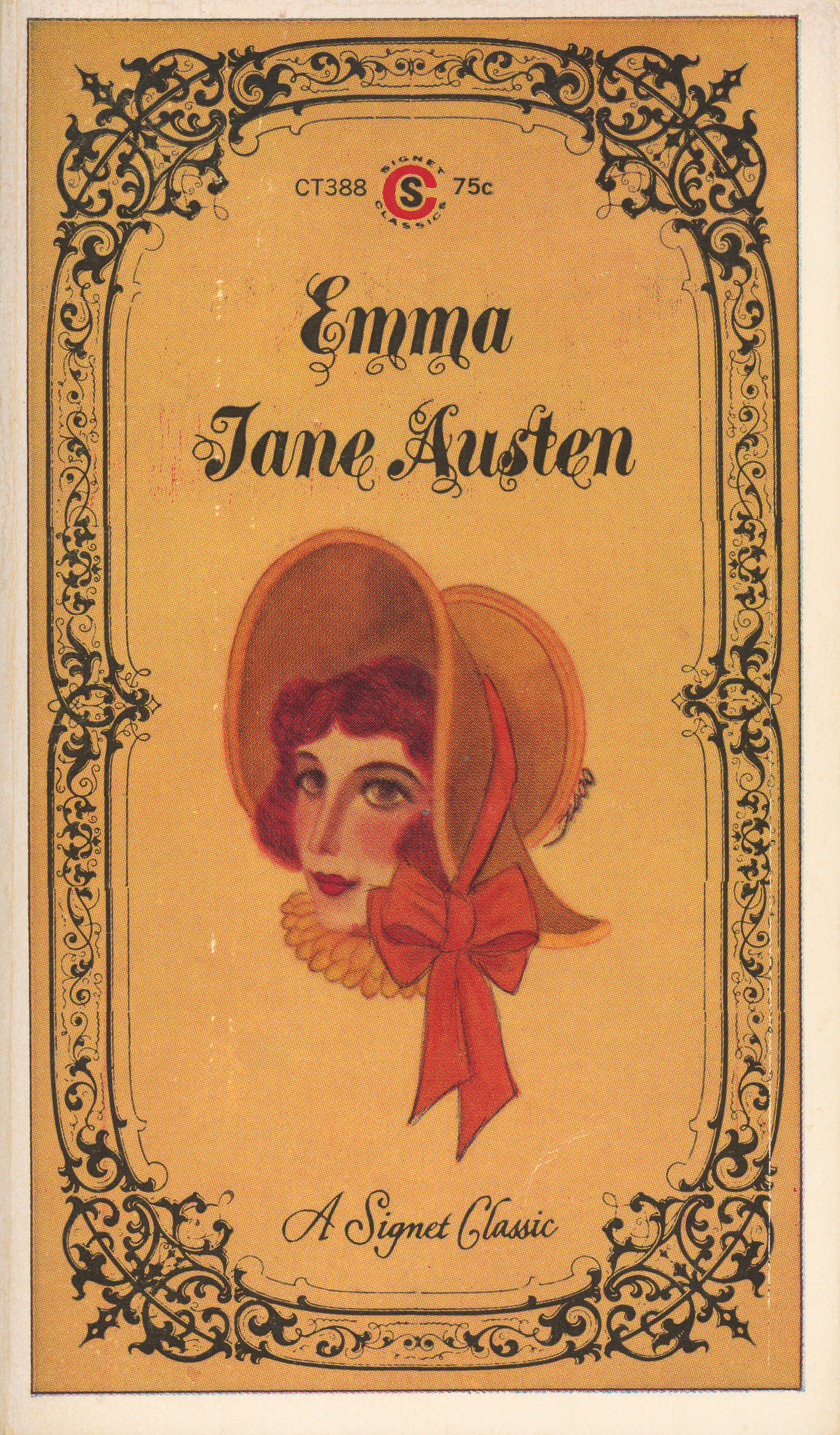 Jane Austen’s Emma is a comedy of manners first published in 1815. The cover of Signet’s 1969 edition (CT388) features art by Alex Tsao. The typeface is not quite as old as the novel: it’s the solid style of Herman Ihlenburg’s Treasury, which MacKellar, Smiths & Jordan first cast in 1874.