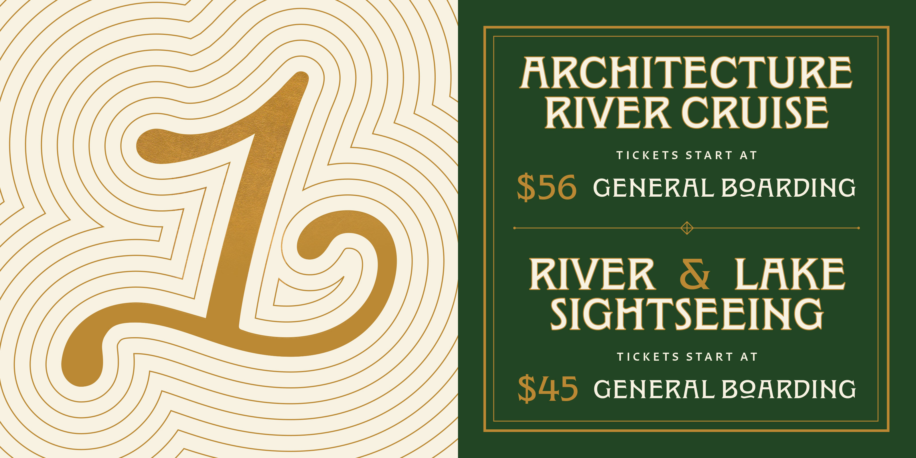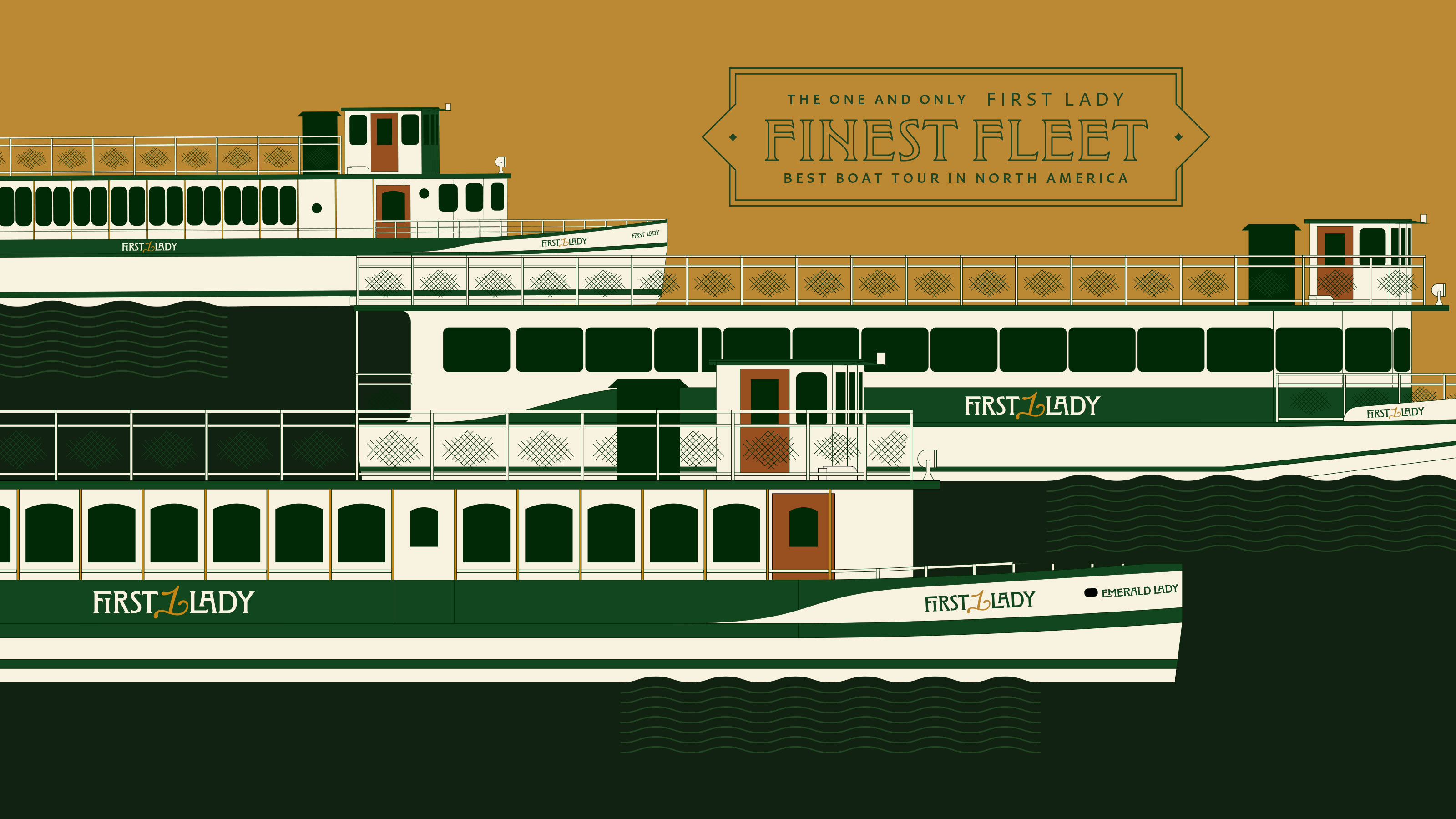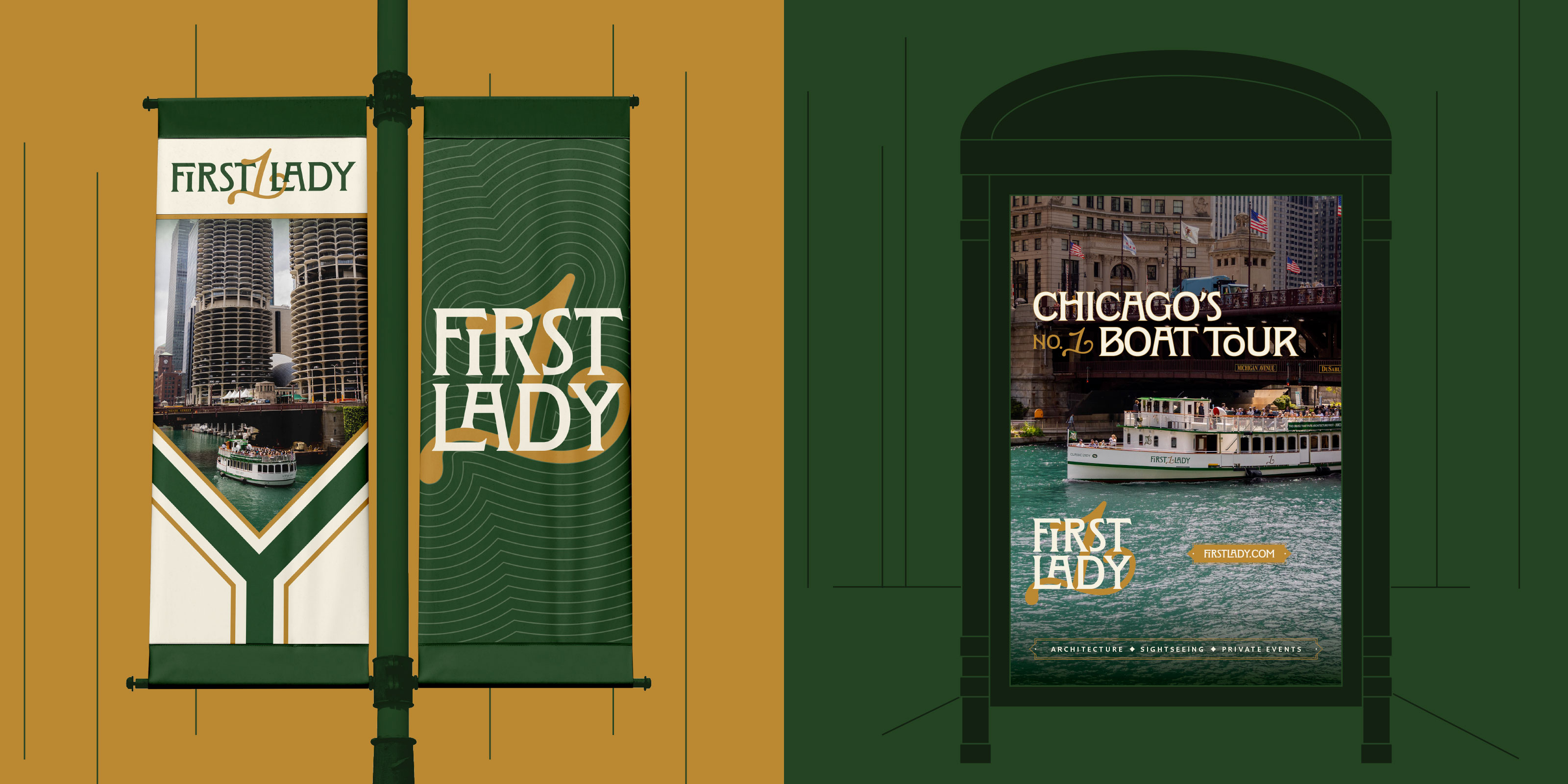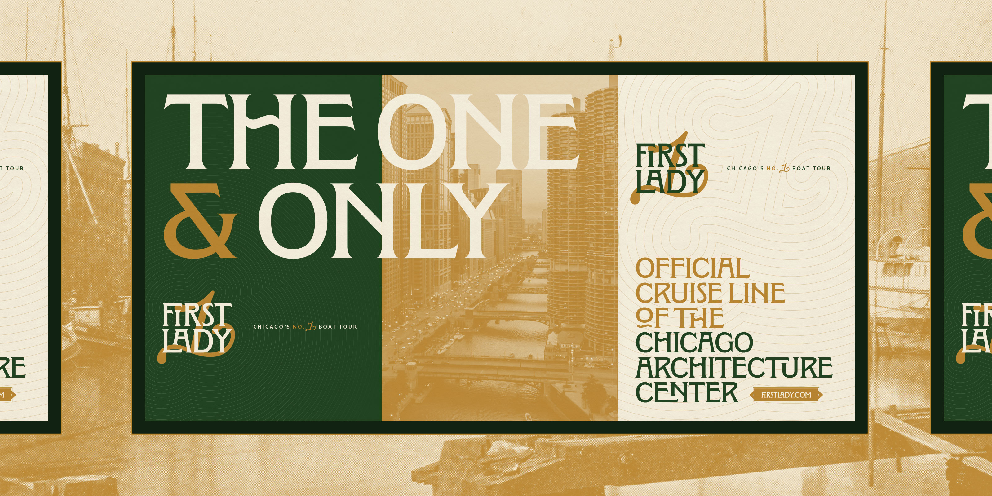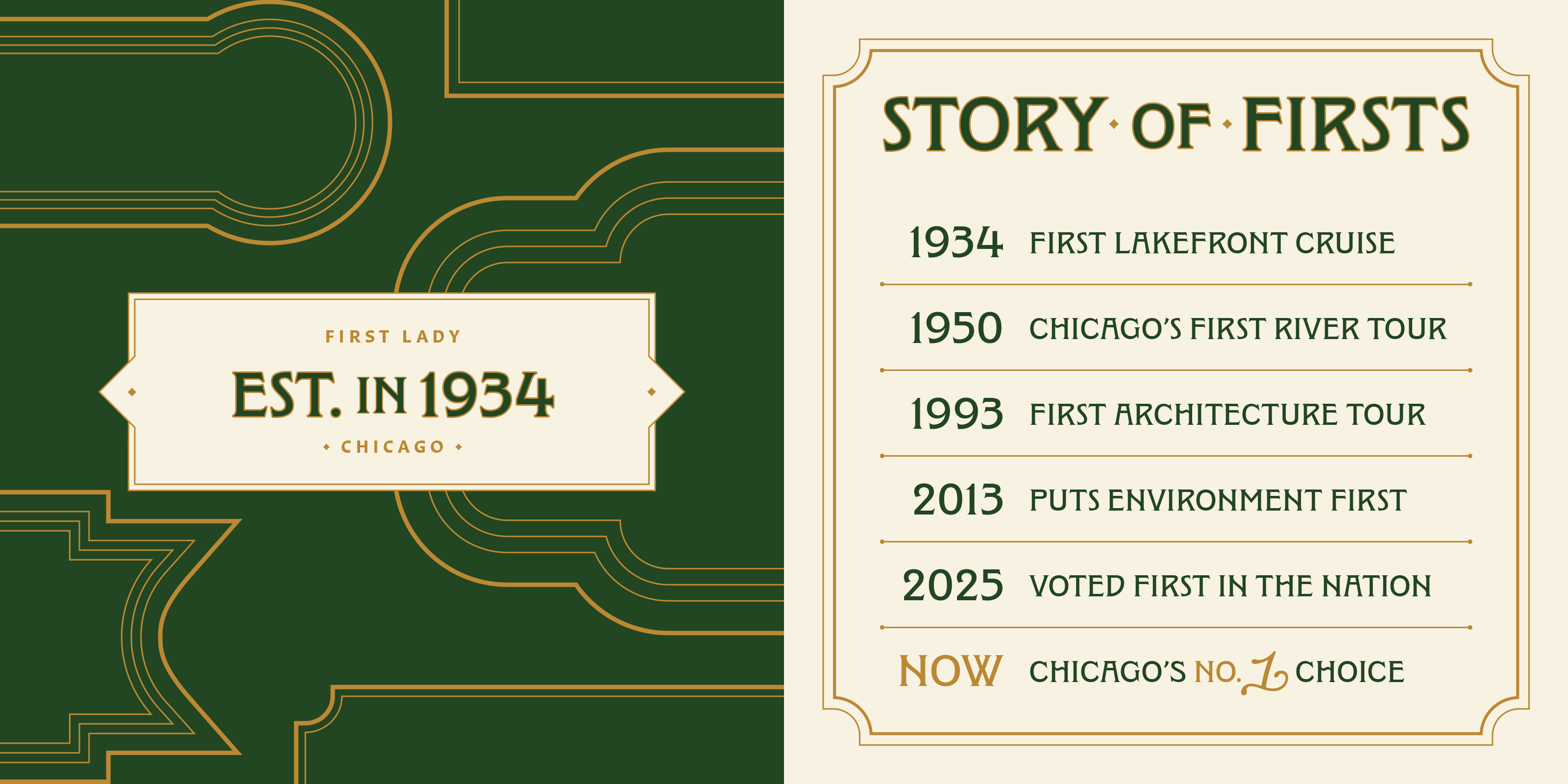 Span began by simplifying the name. From Chicago’s First Lady Cruiseline and Mercury Skyline Cruises, to the more resonant, flexible First Lady. From there, we developed a visual identity that bridges heritage and modernity. Channeling both the utility of the working river and the refined character of the vessels themselves.