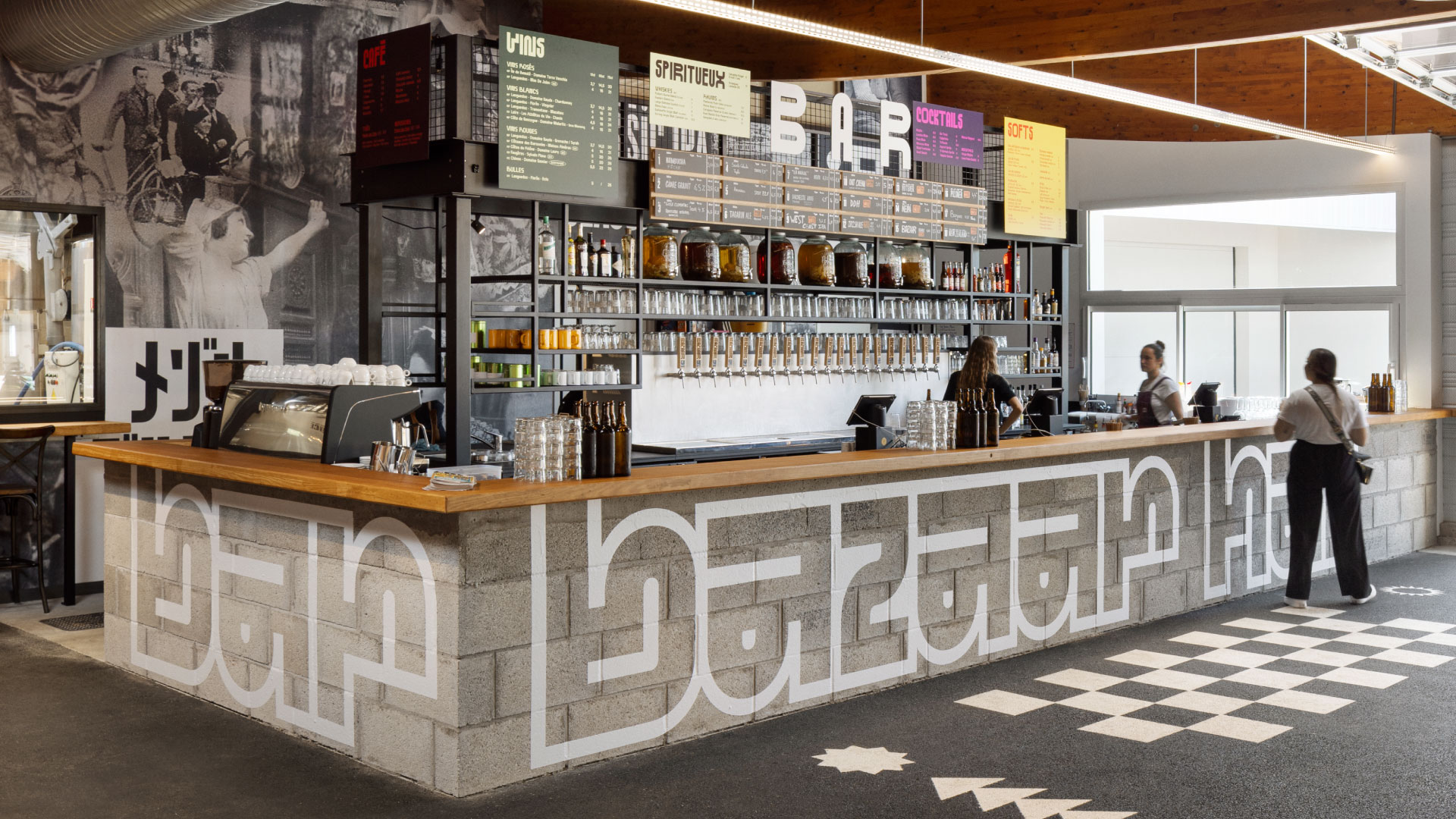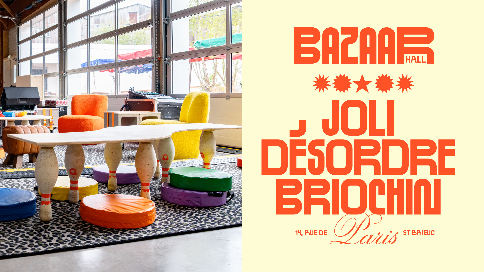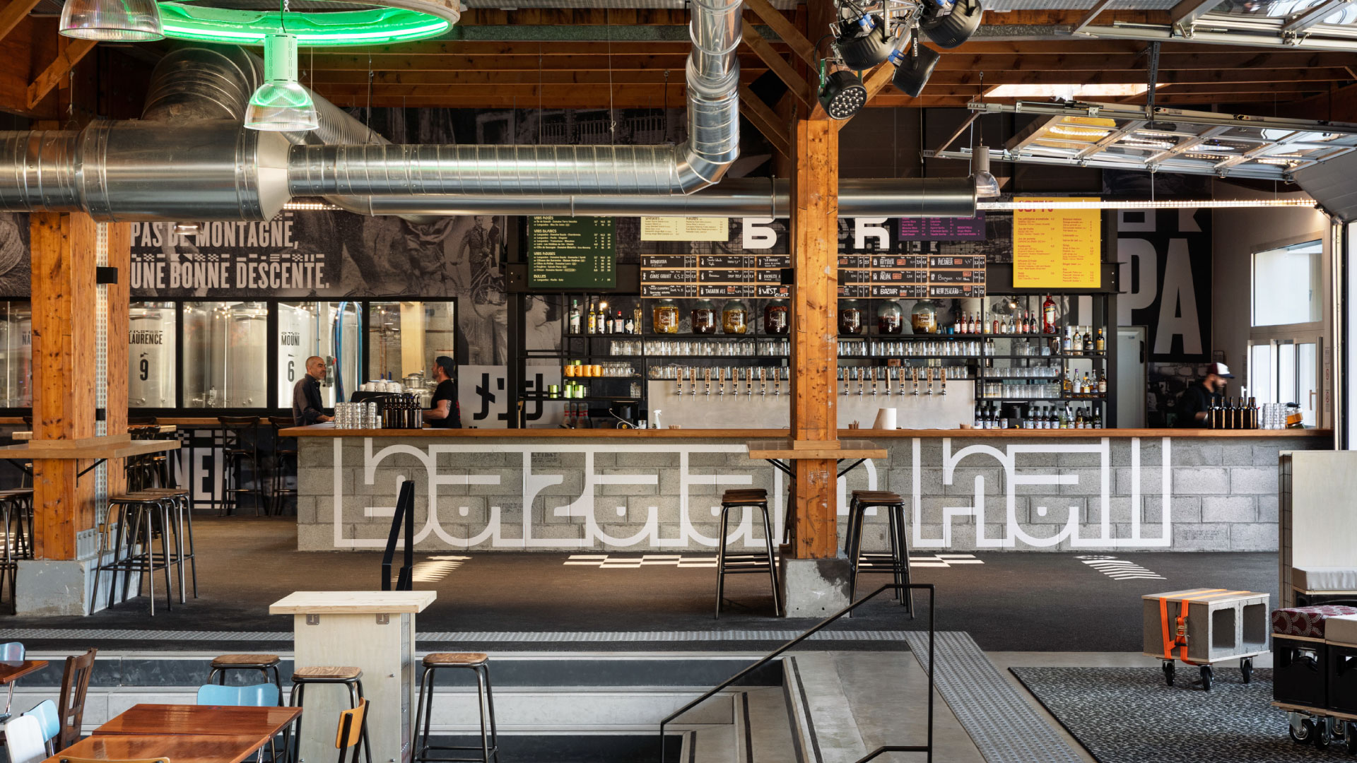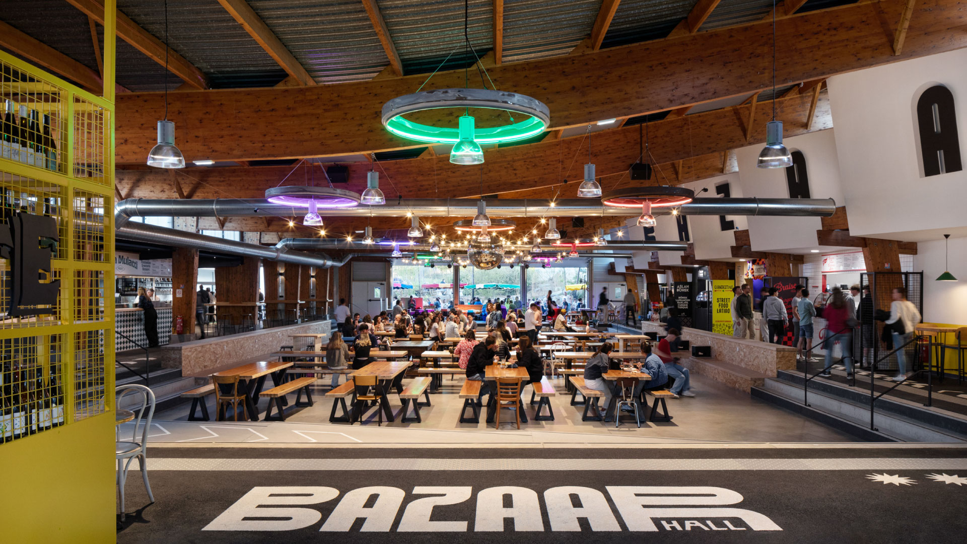 Bazaar Hall is a hybrid mixed-use venue located in Saint-Brieuc hosting multiple activities: food hall, brewery, bar, wine cellar, pop-ups, garden, and a cultural and artistic program. Since 1989, this industrial-style building housed a bowling alley with eight wooden lanes, dozen of pool tables, arcade games, pinball machines, foosball, and darts. Bazaar Hall has come to life within this vast space, entirely reimagined.
