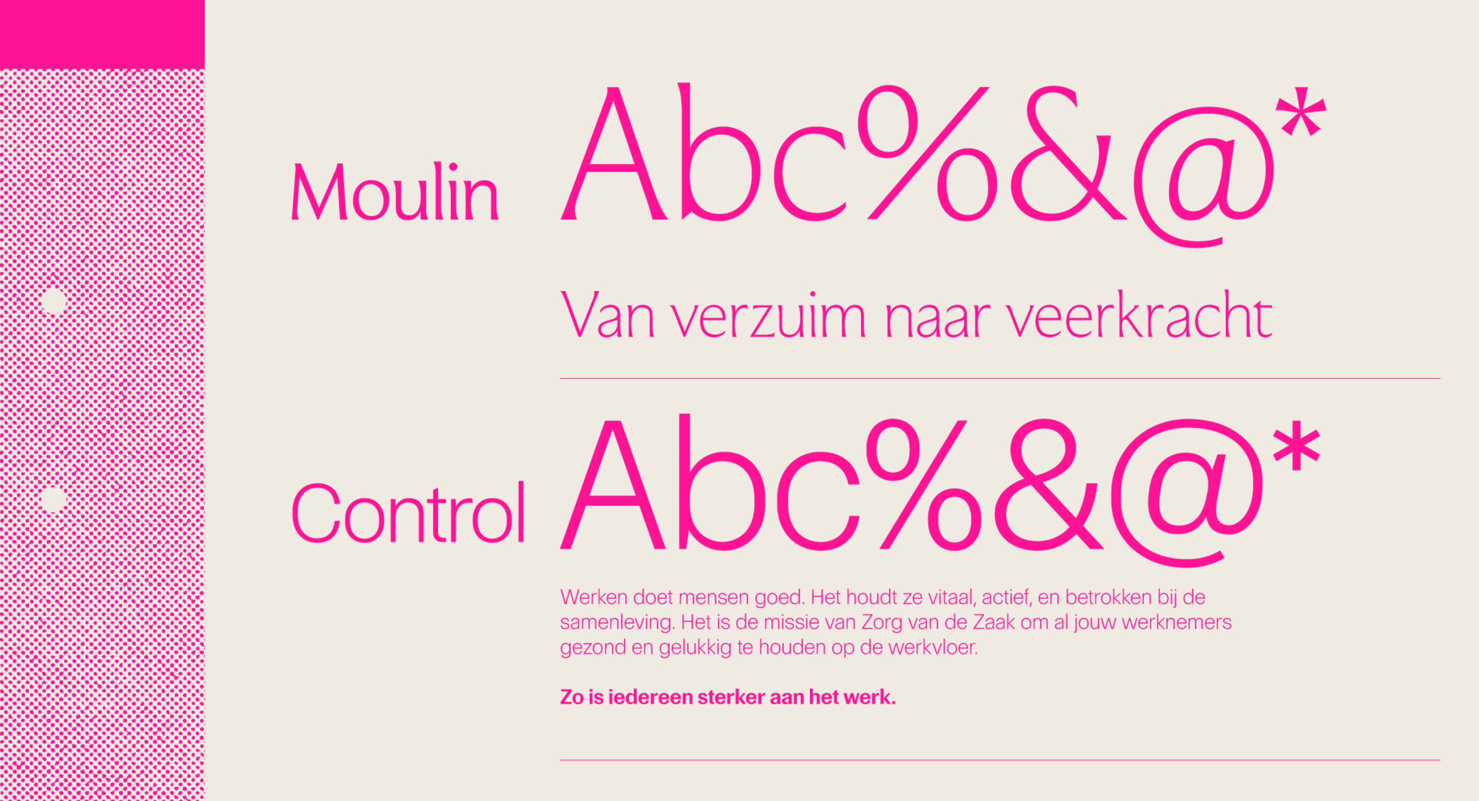 Zorg van de Zaak is one of the Netherland’s largest occupational health services. The rebranding of the identity has been done by Dutch studio Revolte. They chose Moulin and Control by Commercial Type as the typefaces.