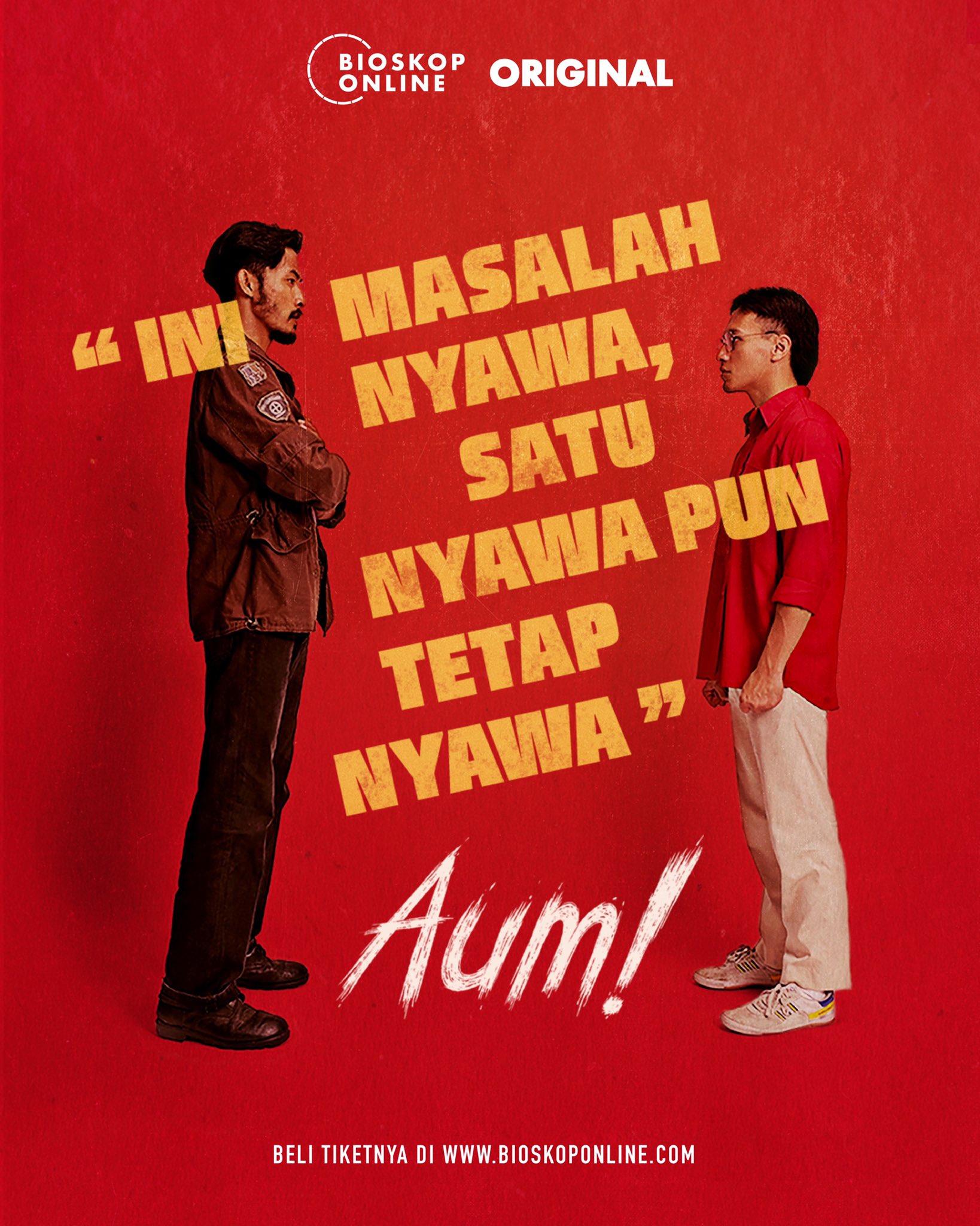 Promotional posters for the 2021 Indonesian adventure mockumentary film Aum! directed and co-written by Bambang “Ipoenk” Kuntara Mukti and produced by Bioskop Online, using Bumper, The extra-heavy-duty industrial sans serif by HvD Fonts is perfect for use in posters, books, magazines, and newspaper headlines.