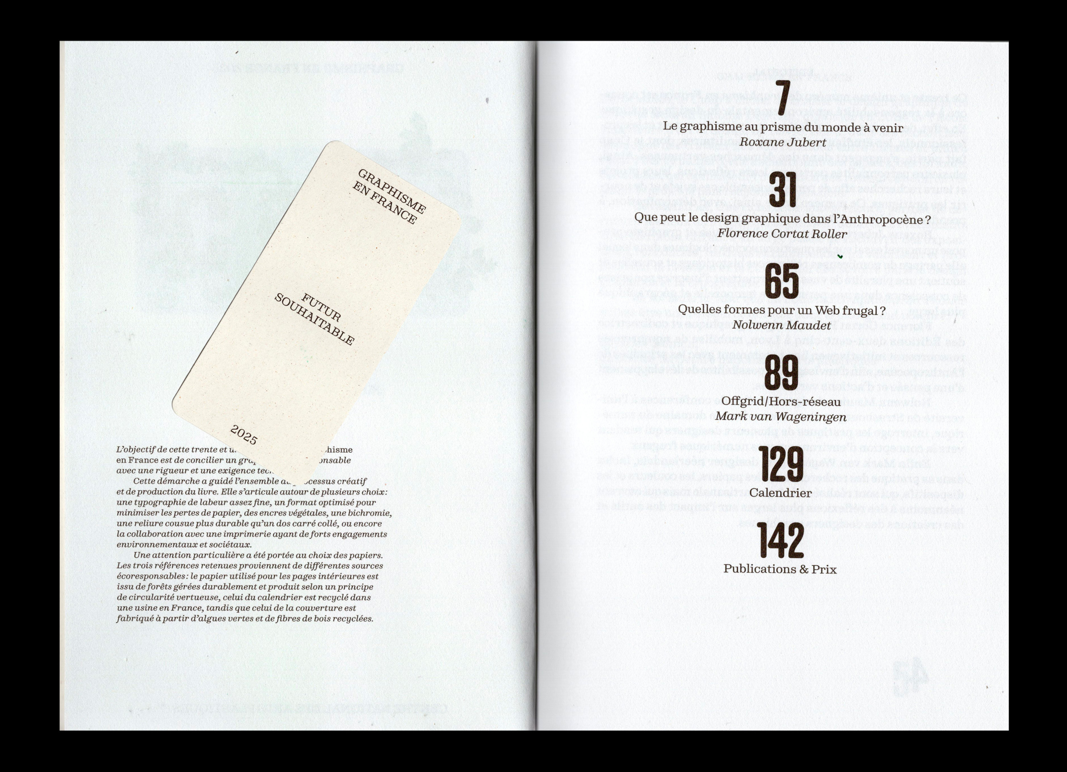 Layout and graphic design of the 31st issue of Graphisme en France – Futur Souhaitable, dedicated to the environmental responsibility of graphic design. With contributions from Roxane Jubert, Florence Cortat Roller, Nolwenn Maudet and Marc van Wageningen, who share their reflections, projects, and research to enrich practices and collectively address these issues.