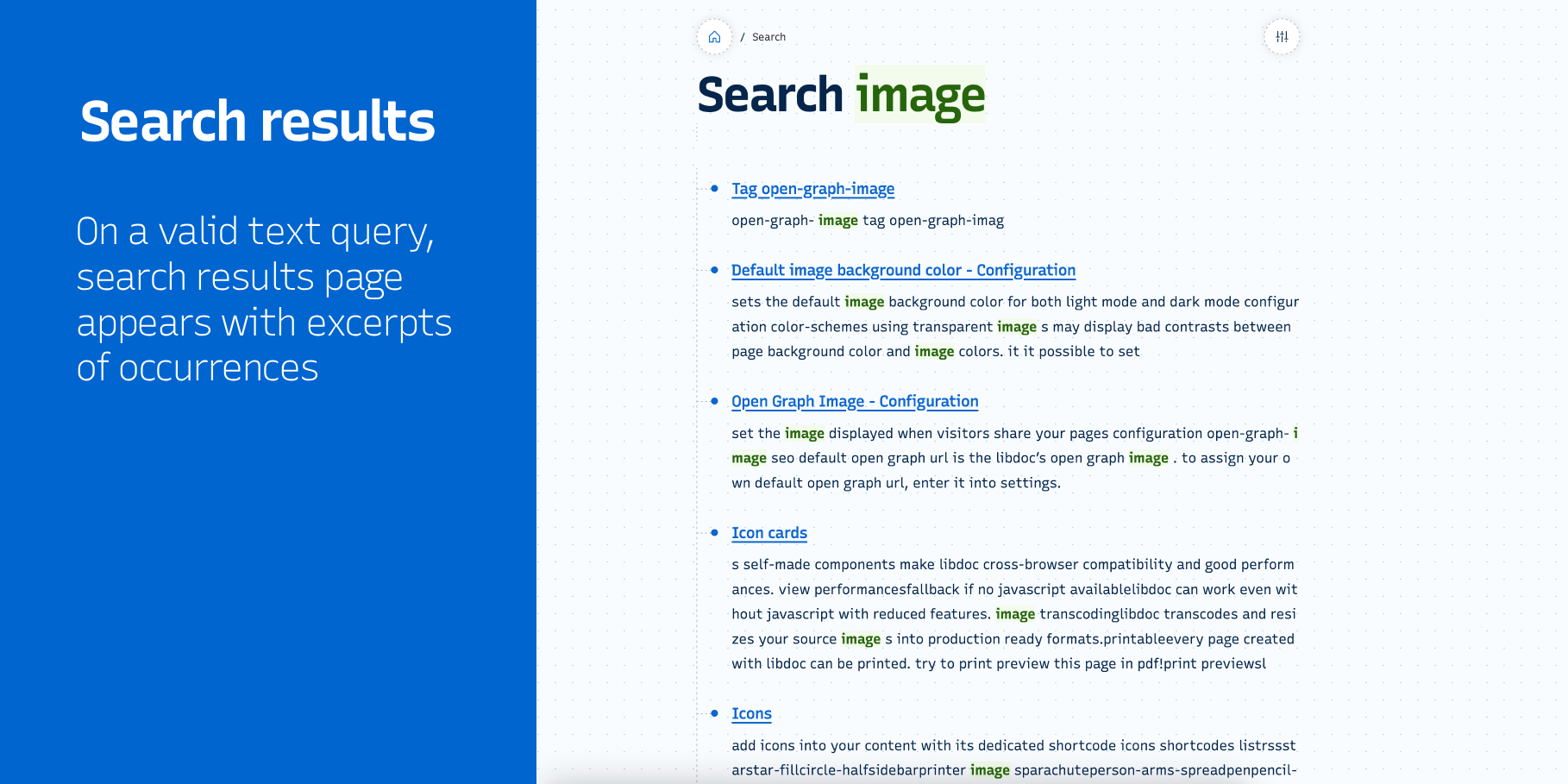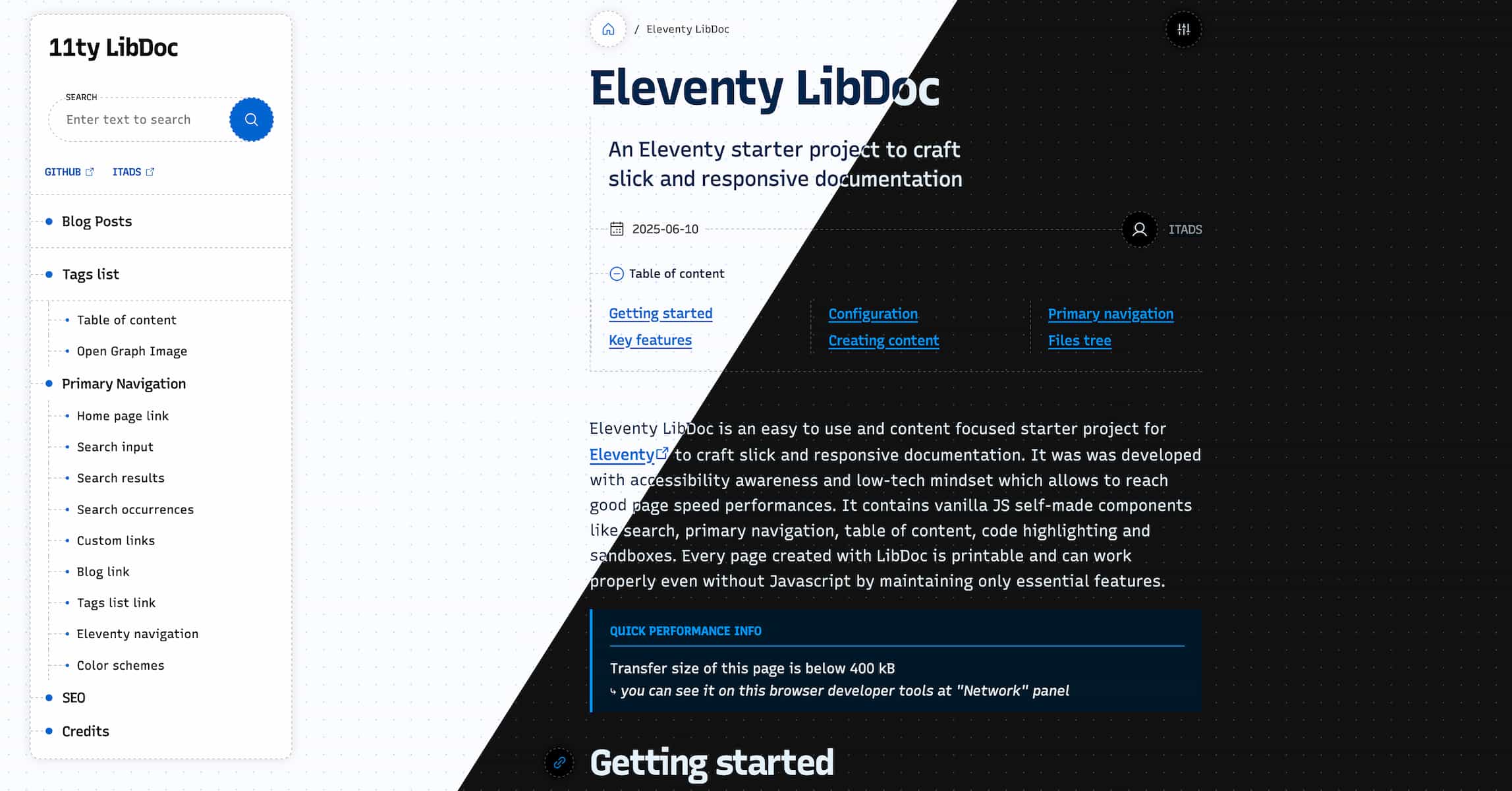 Eleventy LibDoc is an easy-to-use and content-focused starter project for Eleventy to craft slick and responsive documentation. It was developed with awareness for accessibility and a low-tech mindset which allows to reach good page speed performance. It contains self-made Vanilla JS components like search, primary navigation, table of content, code highlighting, and sandboxes. Every page created with LibDoc is printable and can work properly even without Javascript by maintaining only essential features.