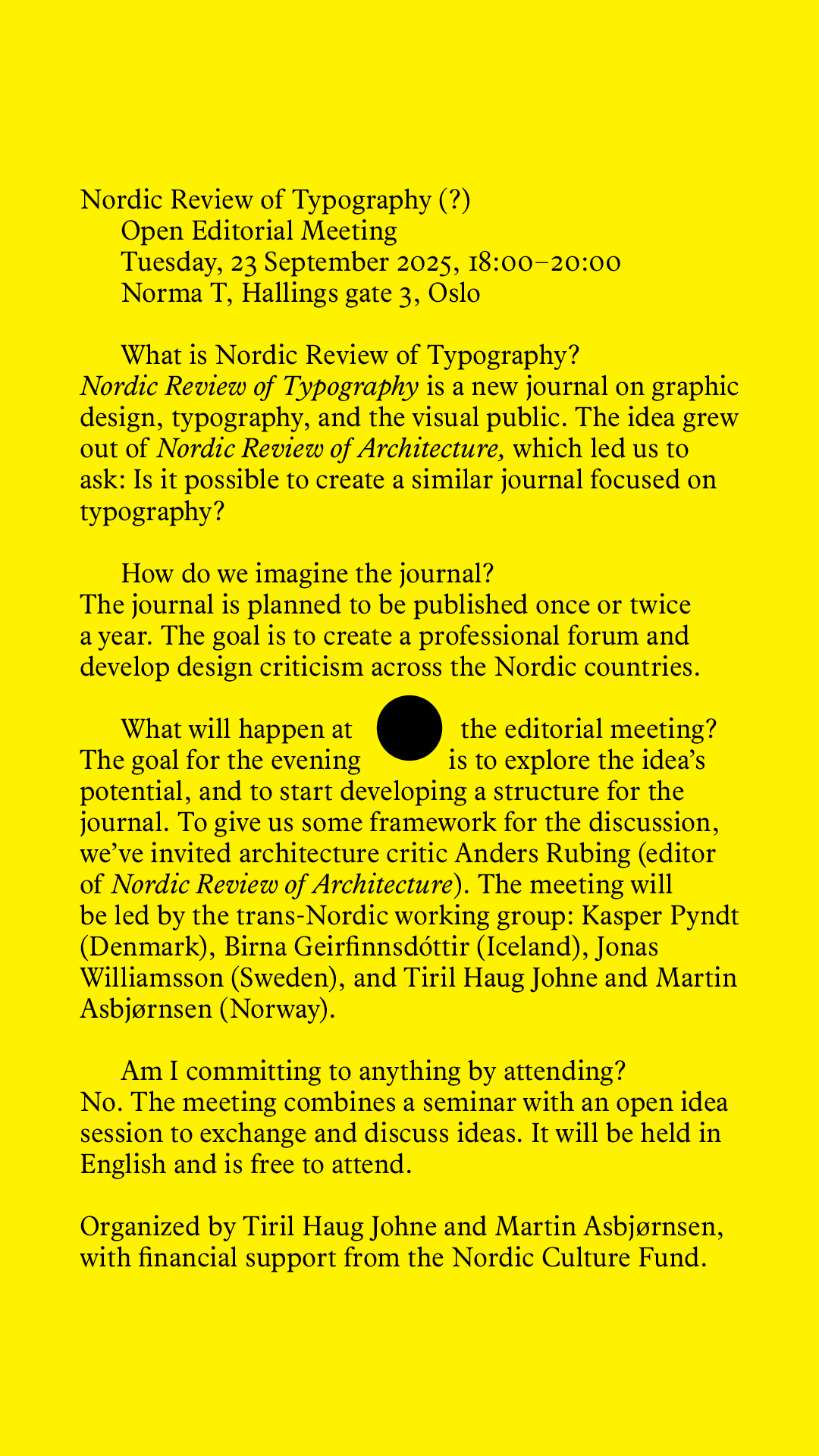The Nordic Review of Typography is a newly conceived journal dedicated to graphic design, typography, and the visual public. Inspired by the success of the Nordic Review of Architecture, this new publication aims to create a professional forum for design criticism and dialogue across the Nordic countries. The journal is envisioned as an annual or biannual release, fostering cross-border conversations and elevating the discourse around visual culture in the region.