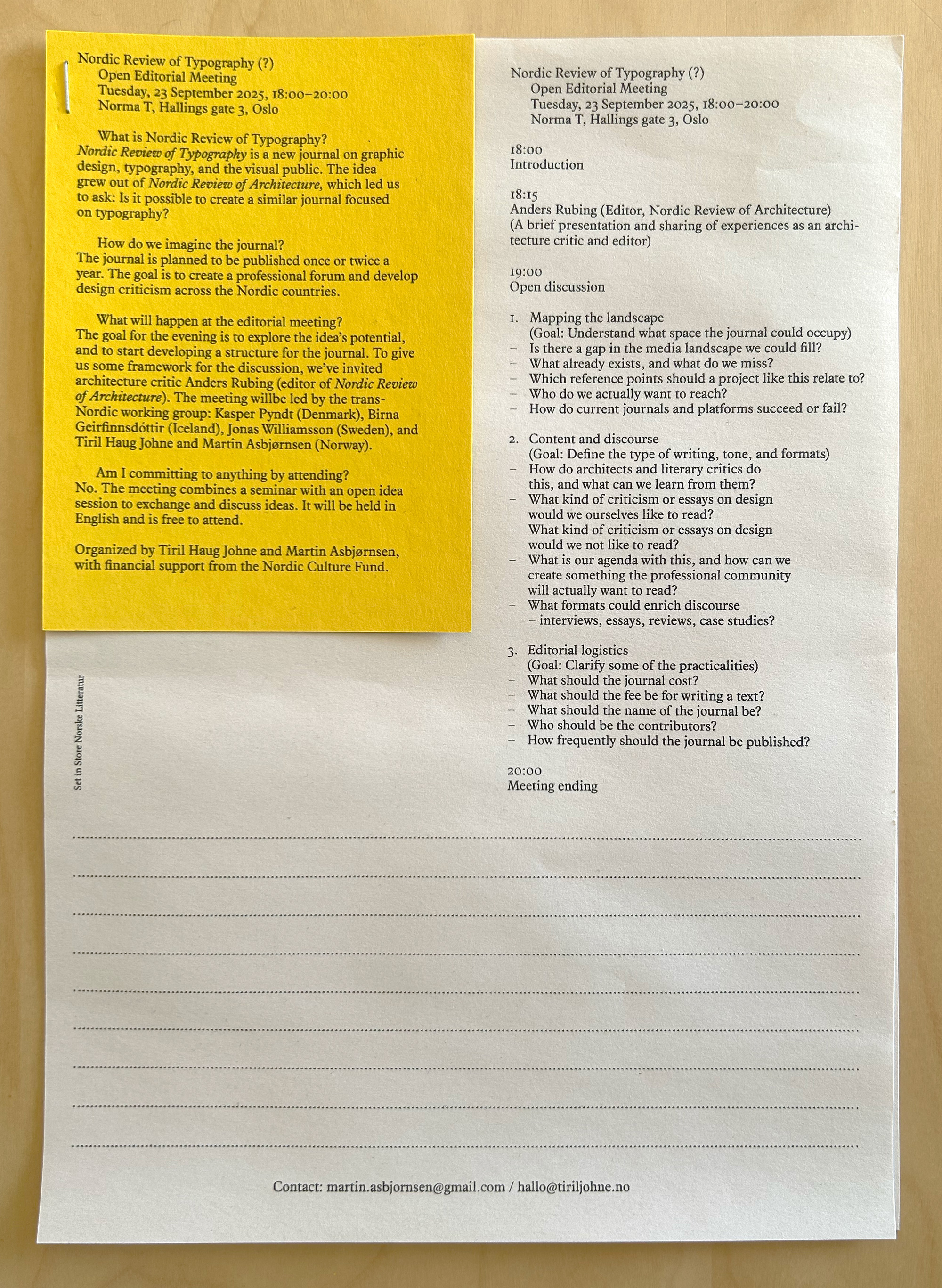 To launch the initiative and shape its direction, an open editorial meeting was held at Norma T in Oslo on September 23, 2025. The event brought together designers, critics, and enthusiasts to discuss potential structures, themes, and ambitions for the journal. Guided by a trans-Nordic working group: Kasper Pyndt (Denmark), Birna Geirfinnsdóttir (Iceland), Jonas Williamsson (Sweden), and Tiril Haug Johne and Martin Asbjørnsen (Norway) and joined by special guest Anders Rubing, editor of Nordic Review of Architecture, the evening combined seminar discussions with a collaborative idea session.