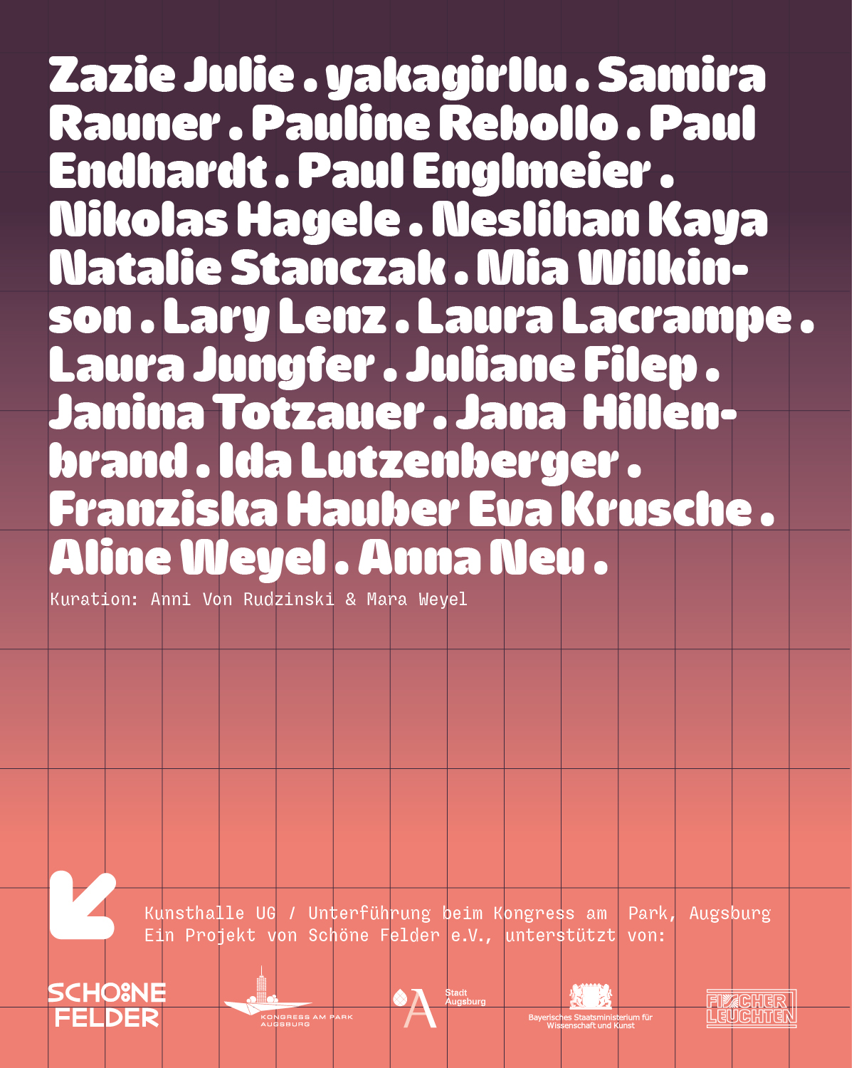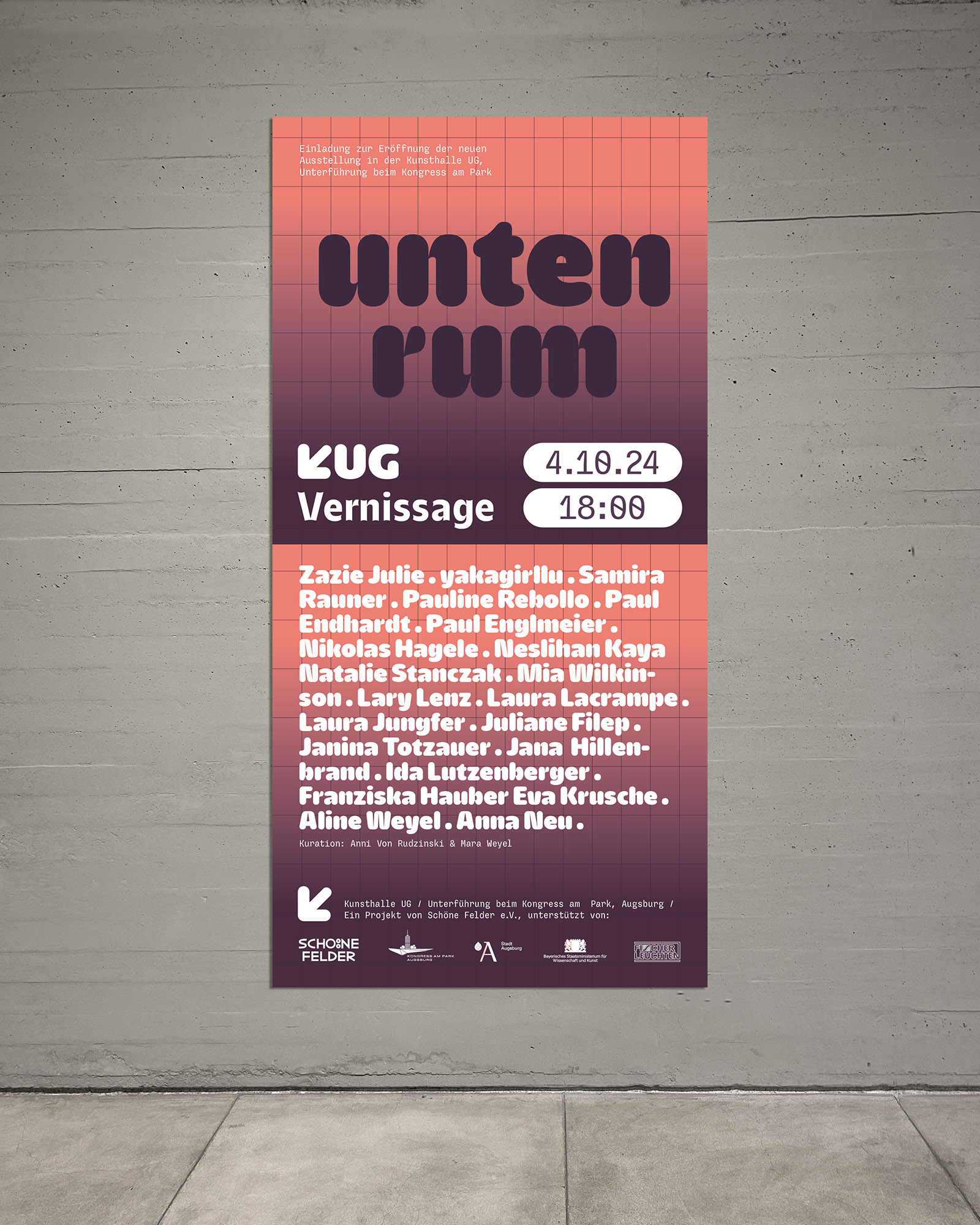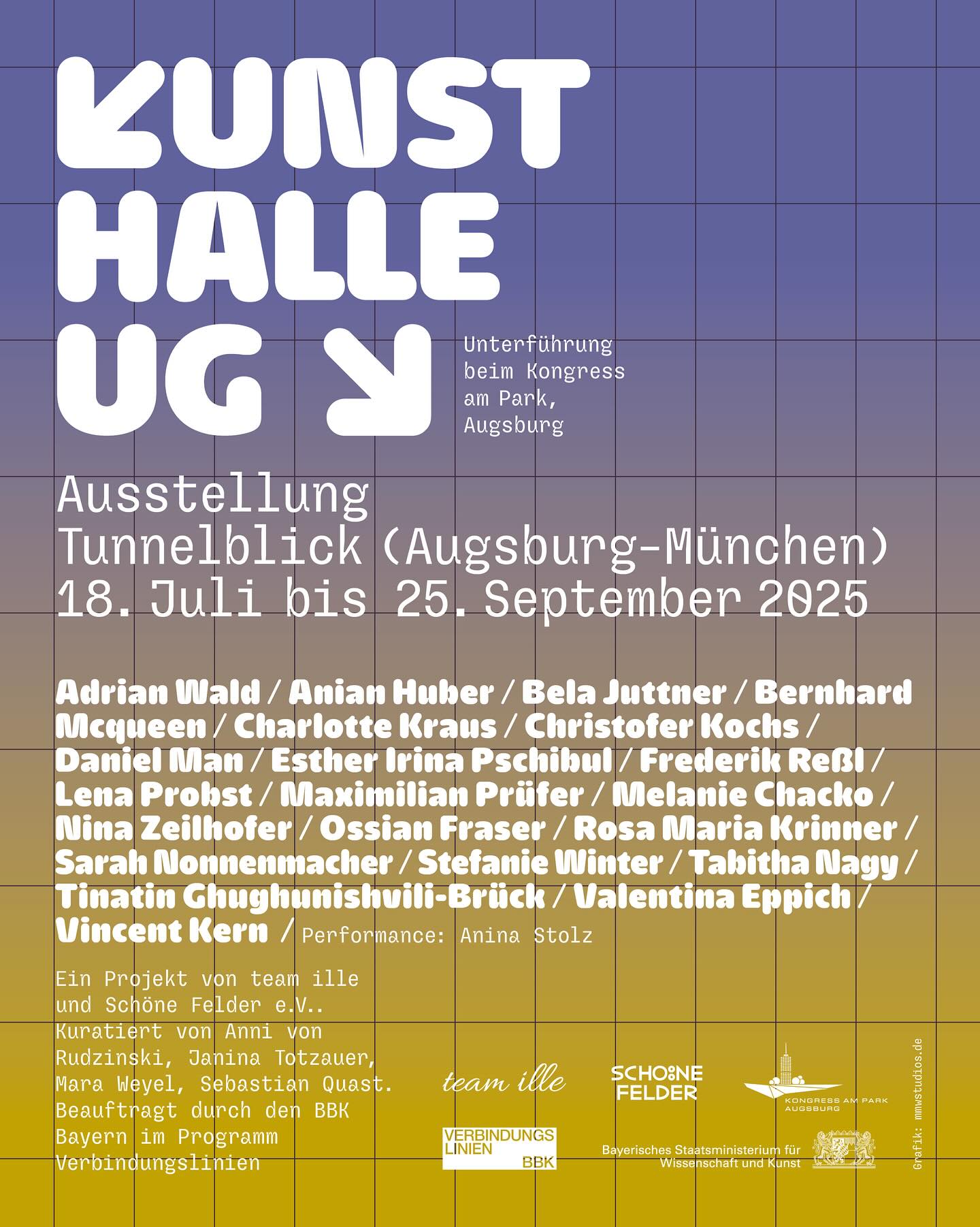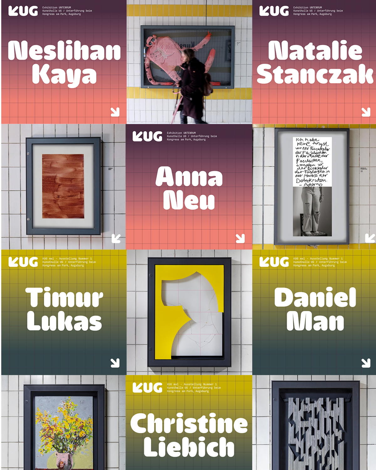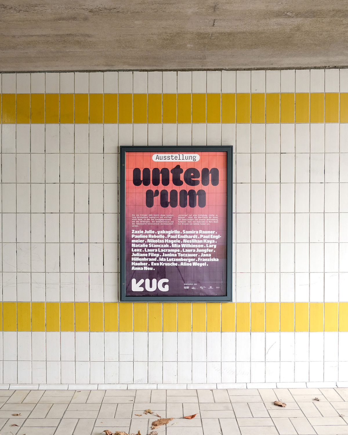 KUG – Kunsthalle UG (Underground Gallery) is an art space initiated by Schöne Felder e.V. and opened in 2023 in an underground passage in the city center of Augsburg in South Germany. MMW Studios has been realizing the communication of the exhibition since the beginnings.