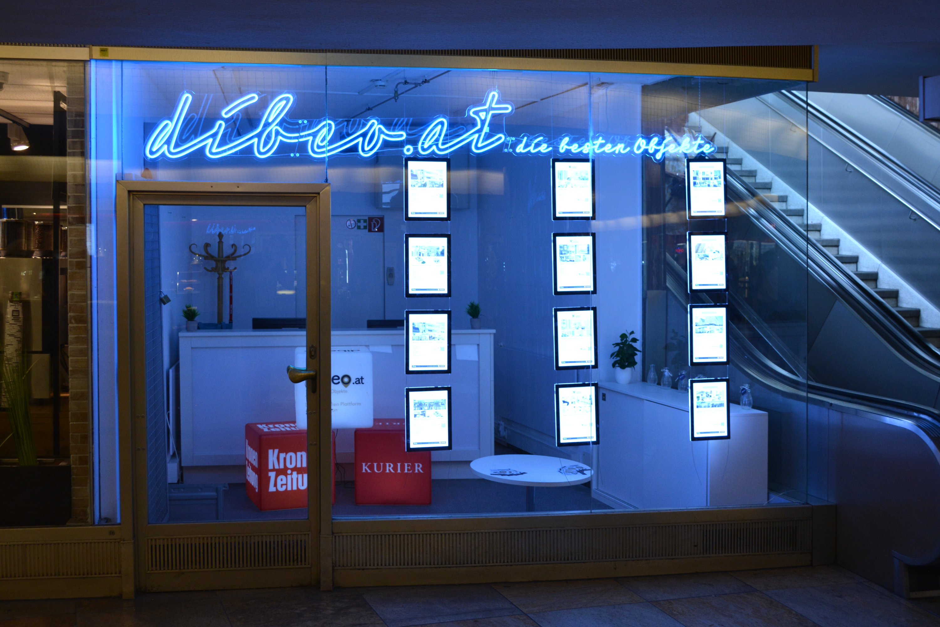 Almost eighty years after the cinema sign was installed and five years after it was dismounted, I’ve spotted Neonoir in use for an illuminated sign, in blue, and in Vienna, no less! It’s not actual neon, though. Also, it doesn’t advertise adult movies, but rather the services of real estate platform dibeo.at.