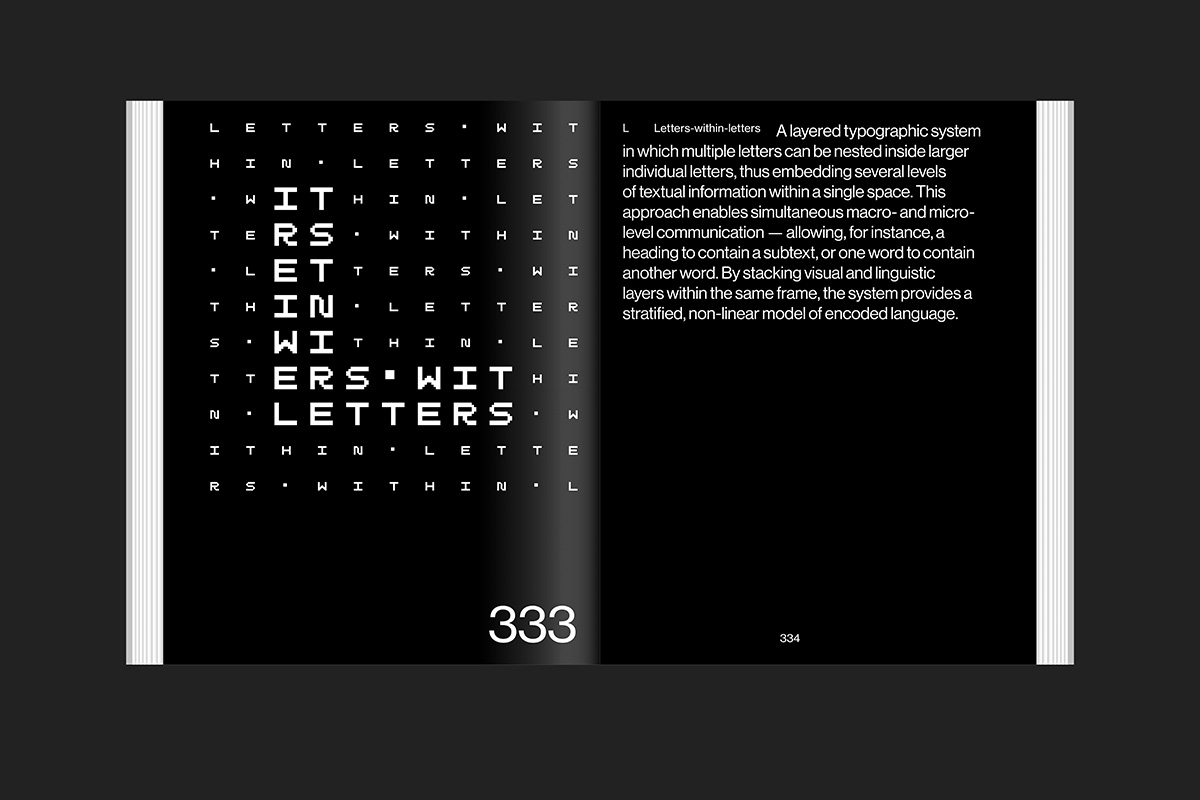 Ultimately—although it may not always be immediately apparent—everything on these pages is language. This work demonstrates how text allows us to embed our thoughts, beliefs and systems within it: a code within a code, a game within a game, a system within a system. It serves as a reminder of the alphabet’s enormous potential to transcend its fundamental purpose as a tool for communication and instead become a limitless space for creative expression.