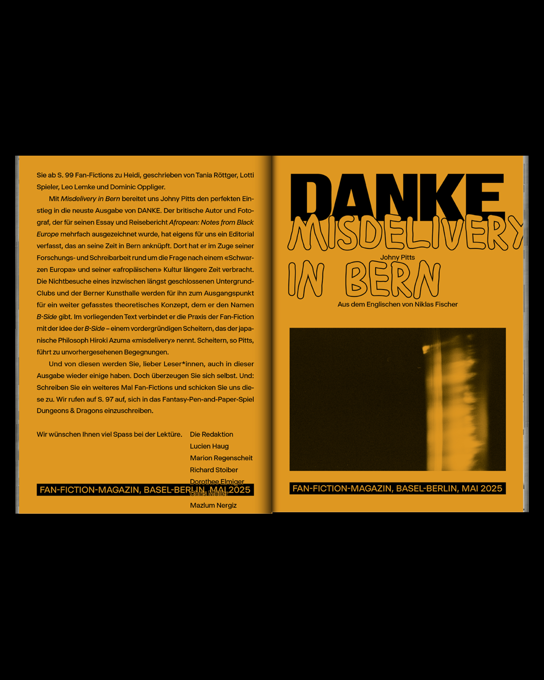 The magazine’s editorial team consists of Lucien Haug, Marion Regenscheit, Richard Stoiber, Dorothee Elmiger, Chris Möller, and Mazlum Nergiz, together with the authors Johny Pitts, Enis Maci, Simoné Goldschmidt-Lechner, Hendrik Otremba, Marina Skalova, Clemens J. Setz, Anna Gien, Leonie Ott, Lotti Spieler, Leo Lemke, Tania Röttger, Dominic Oppliger.
