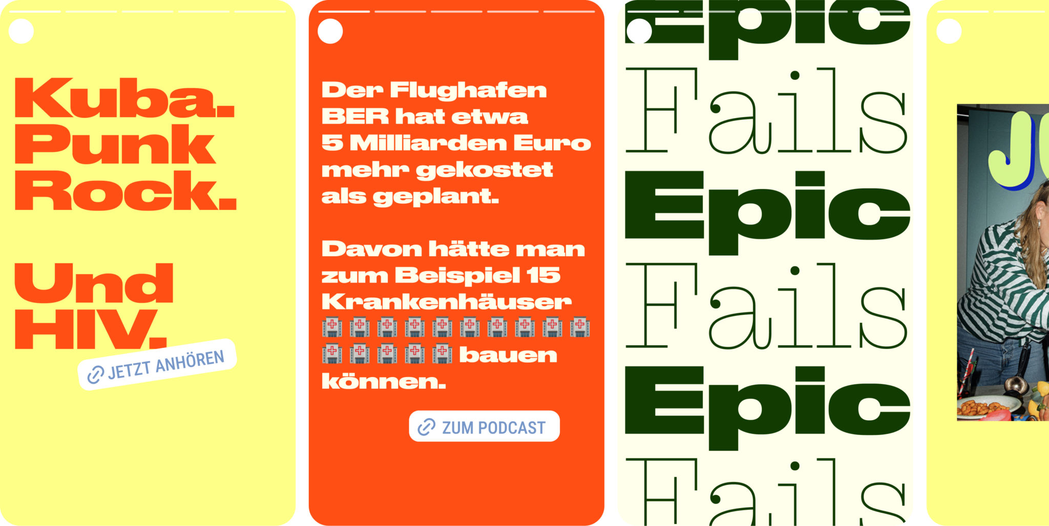 With words being the brand’s most important asset, Studio Veh delivered a typographic solution: a flexible type system using a wide typeface that not only emphasises the larger-than-life stories, but also the impact of the podcasts’ conversations.