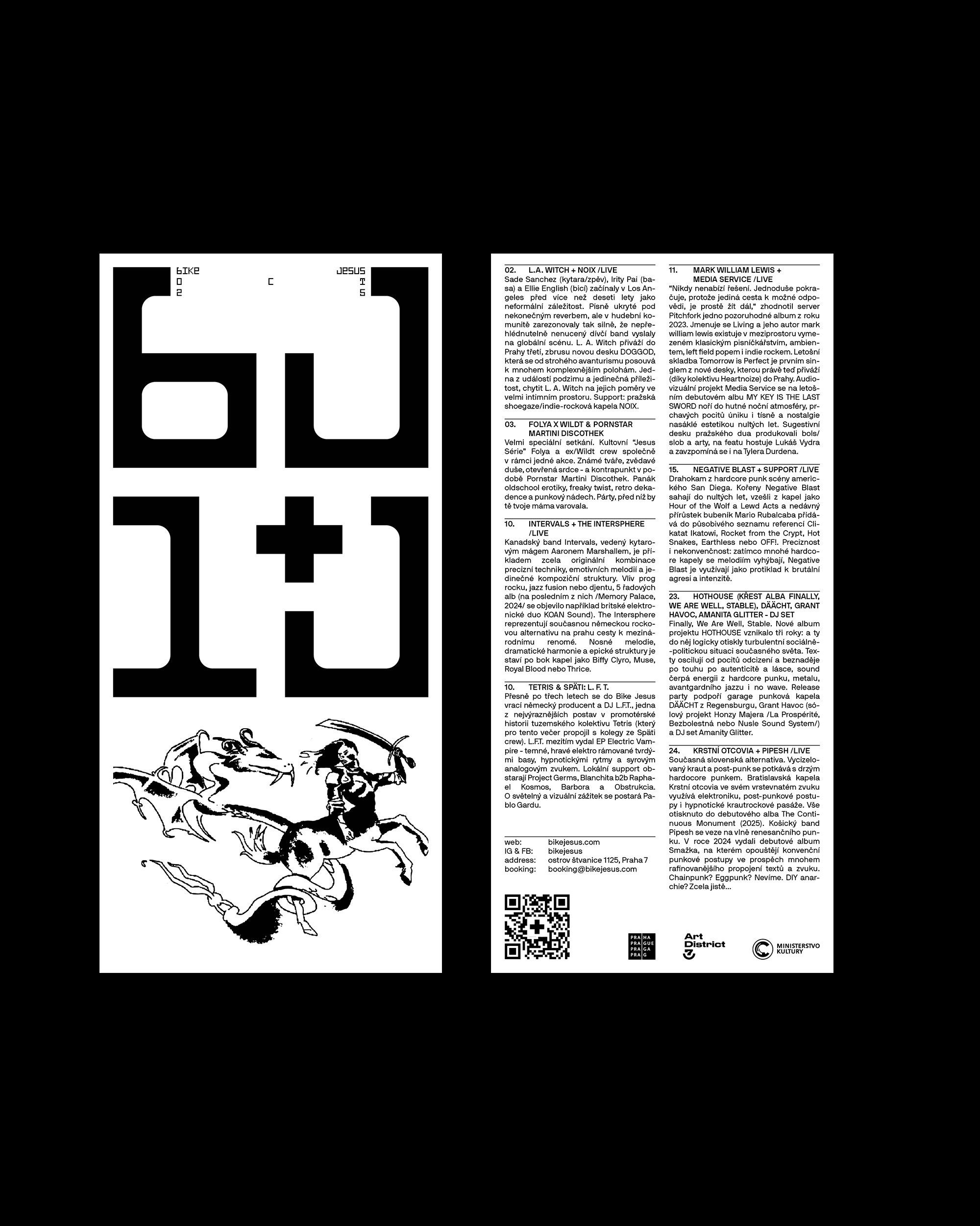 Monthly program and printed newsletter for the Prague club Bike Jesus. Graphic design by Petr Kudláček, with illustrations by Serhij Ďakiv. Typeset in our new typeface Pakatel, available for purchase at Karajan.cz in 15 styles, each containing over 1,200 characters. The back of the newsletter is set in NB International from NeubauLaden.