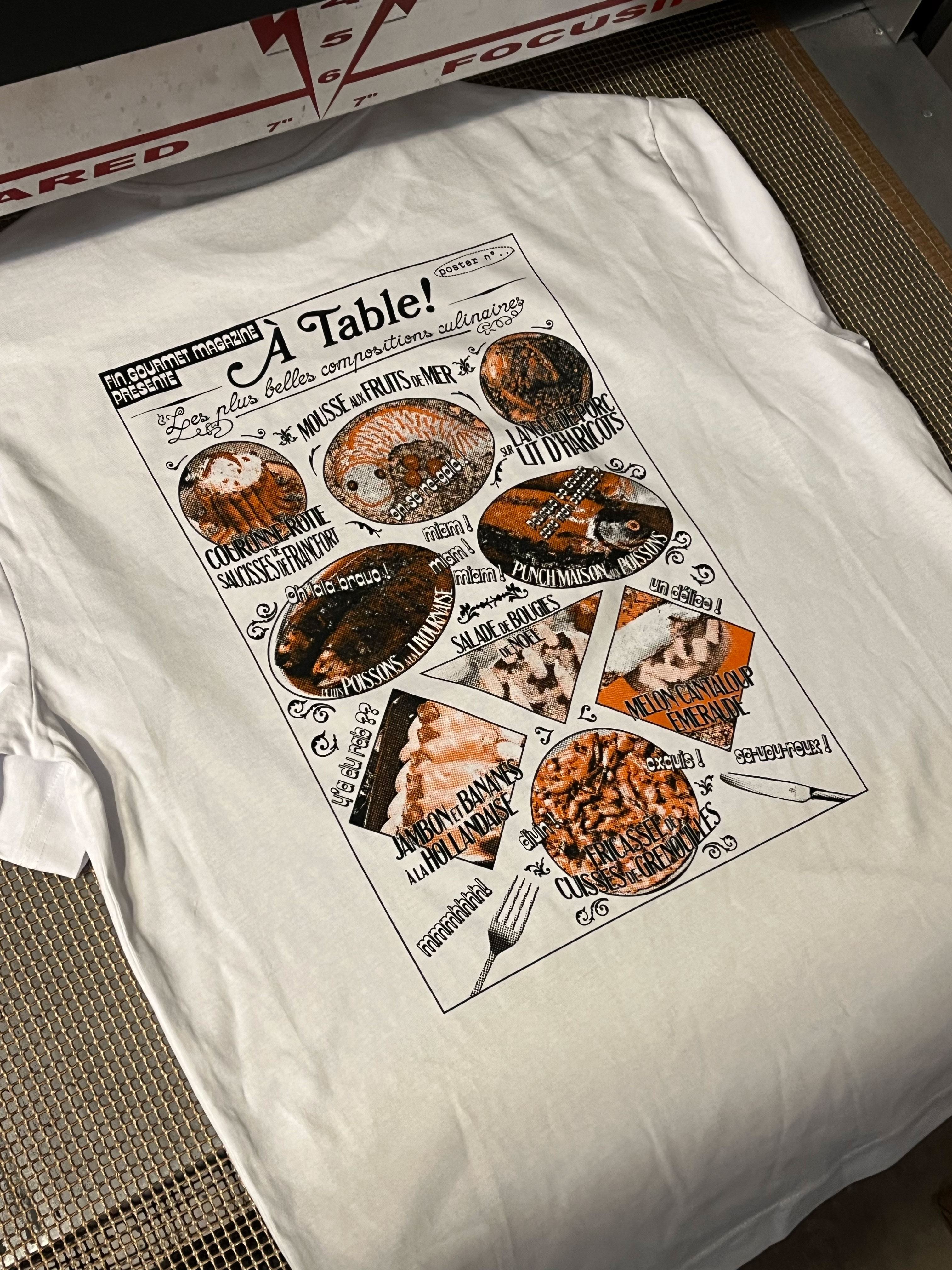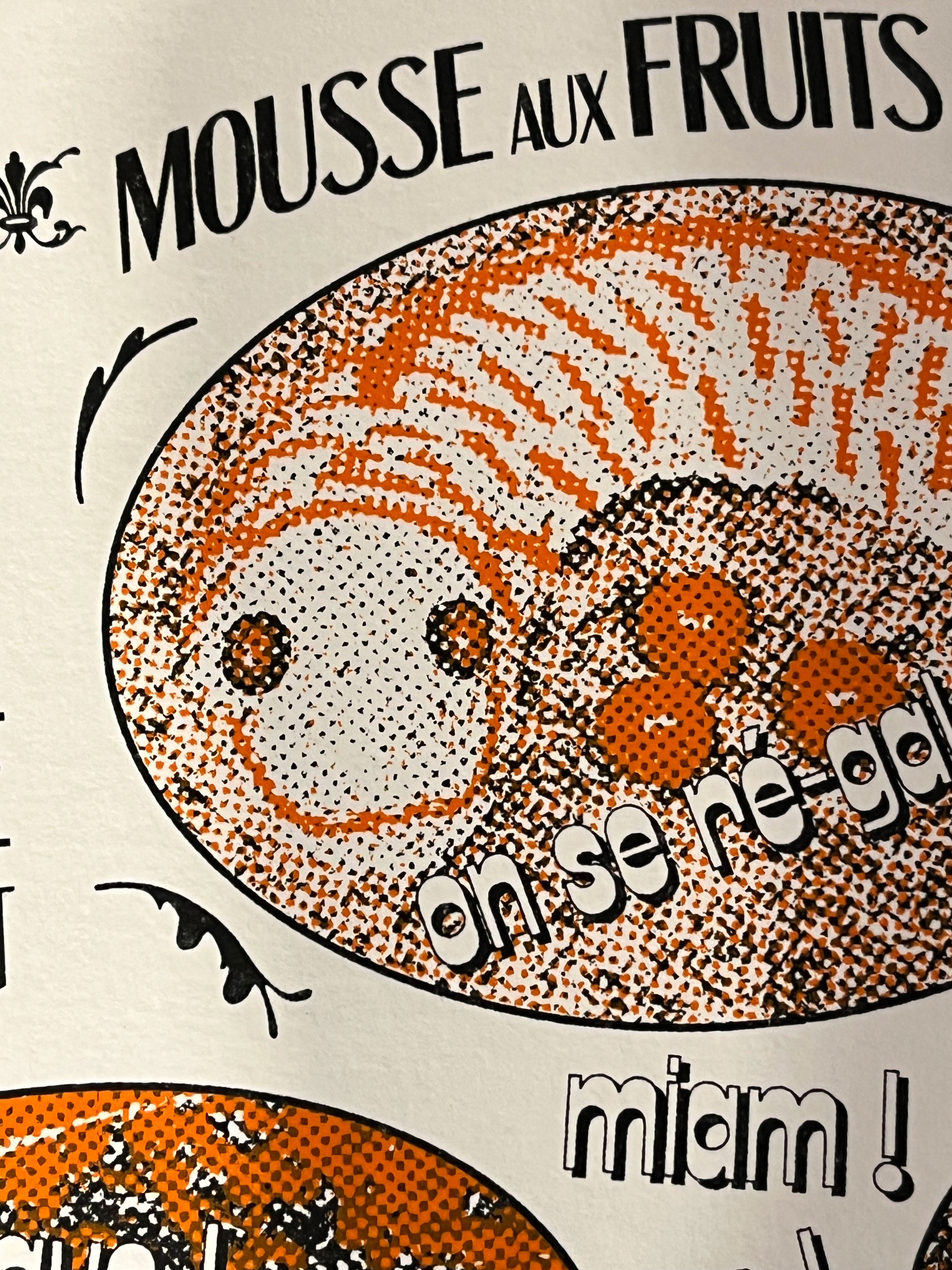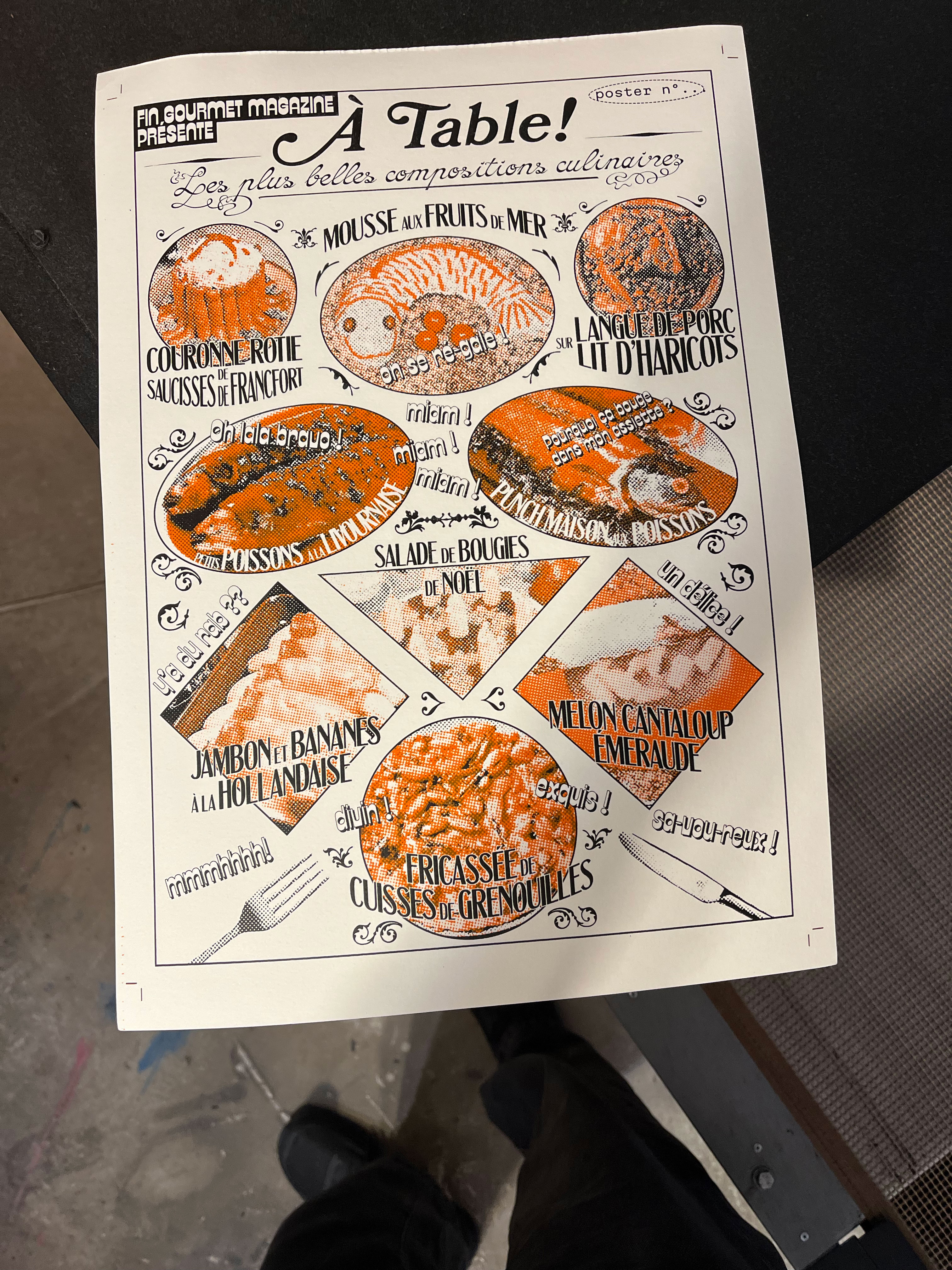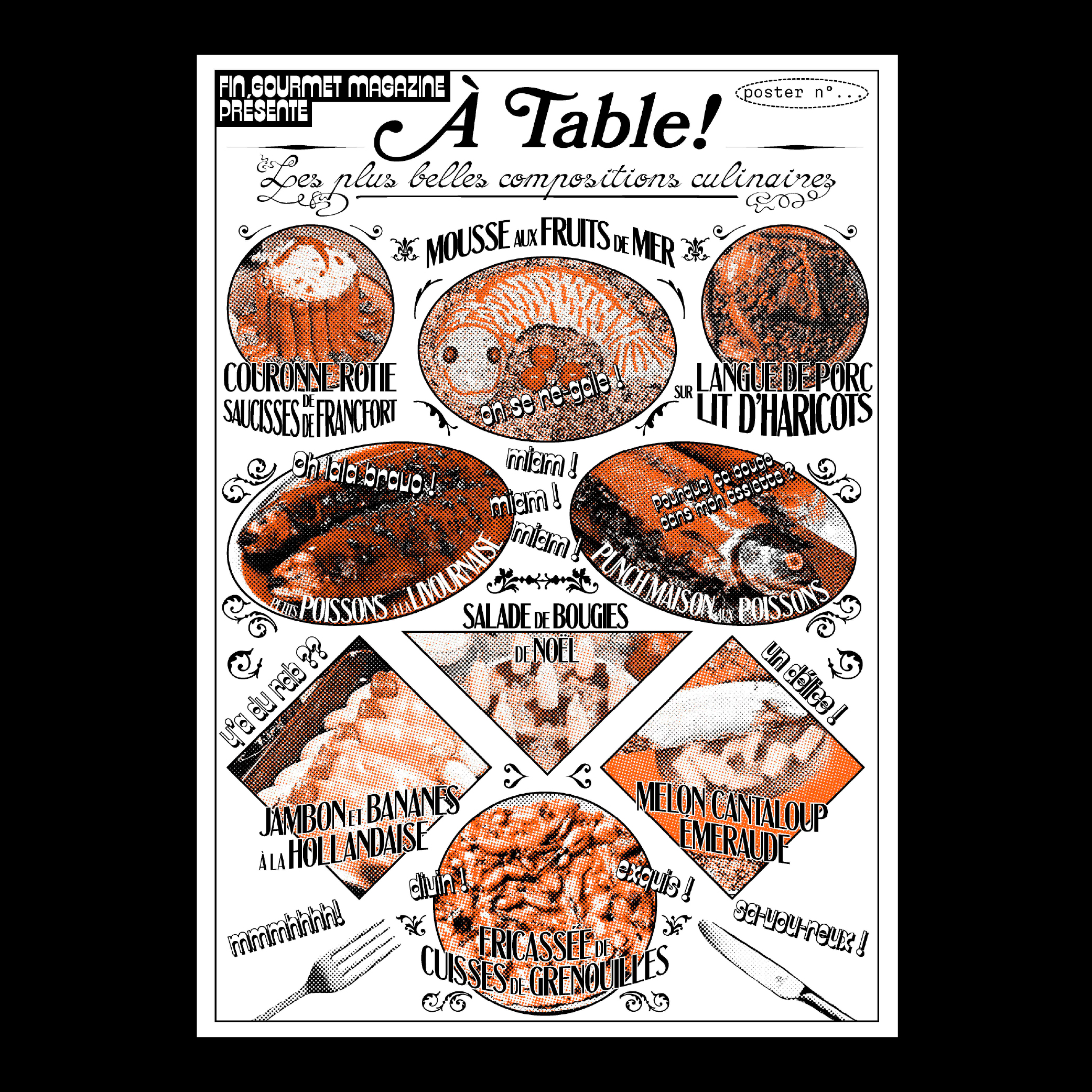 “À Table!” is a two-color screen-printed poster inspired by cookbook photography from the 1970s and 1980s. These images often depict unlikely and visually unappealing dishes, presented with complete seriousness. What makes them compelling is that they were never meant to be ironic. The poster brings together a selection of real recipes found in these cookbooks.