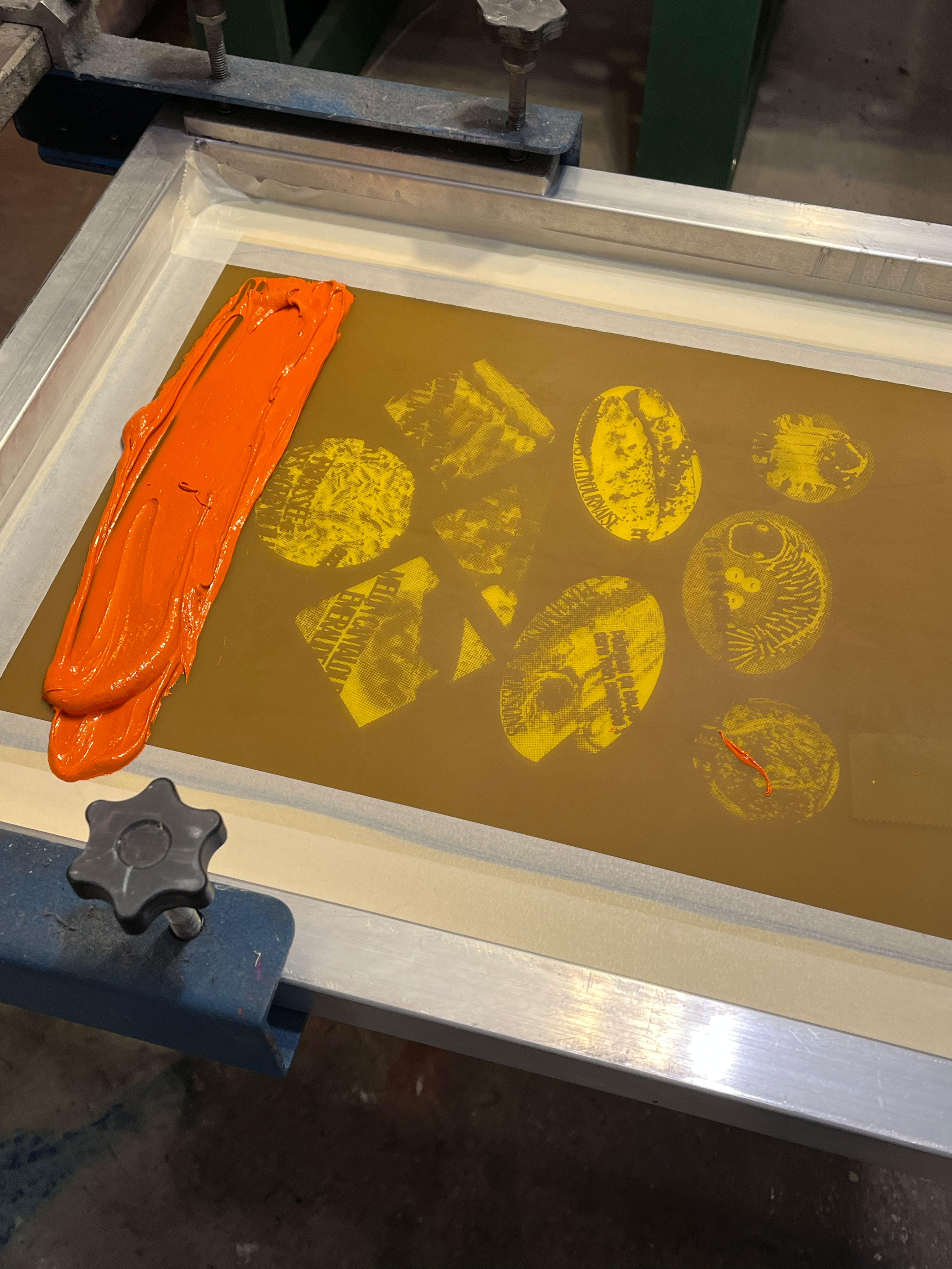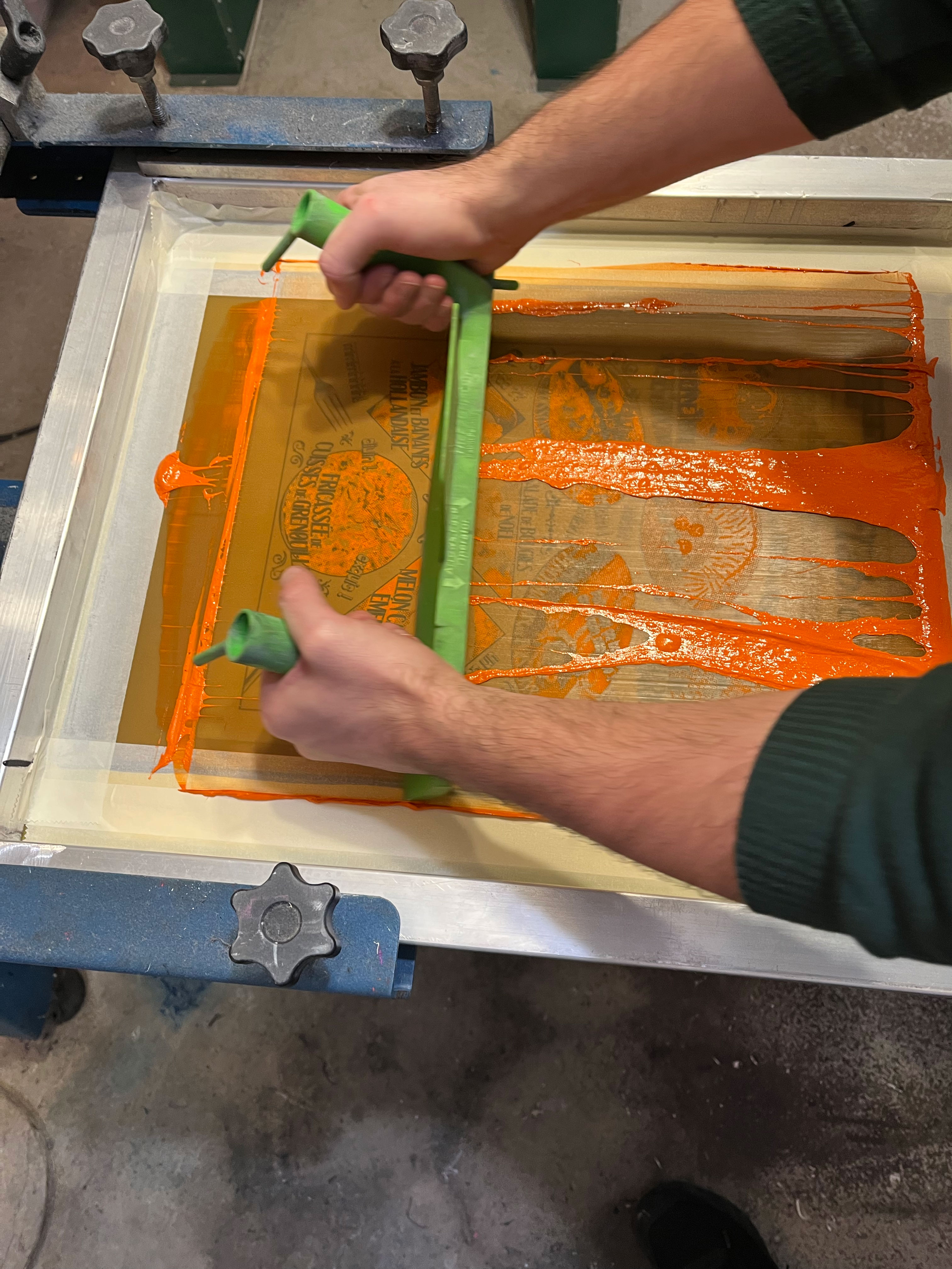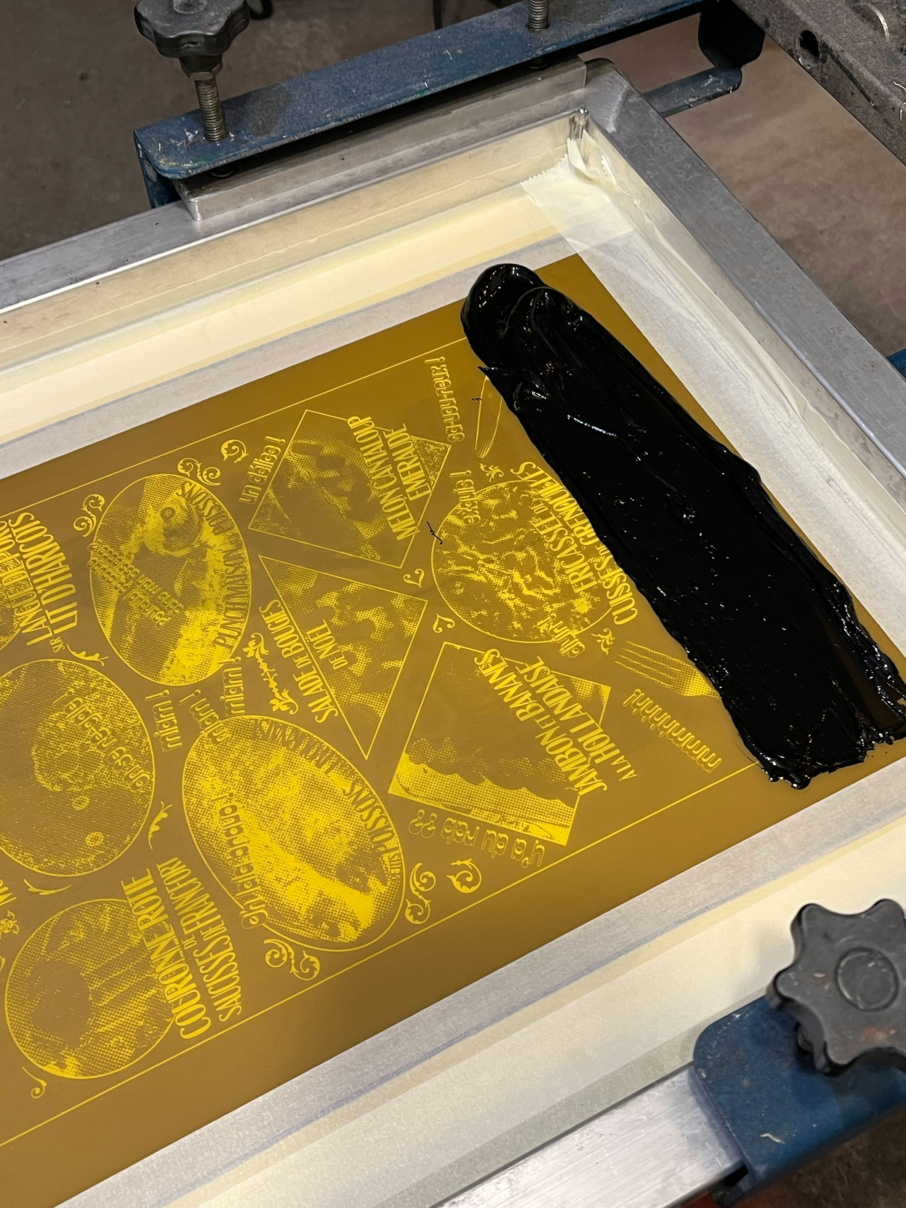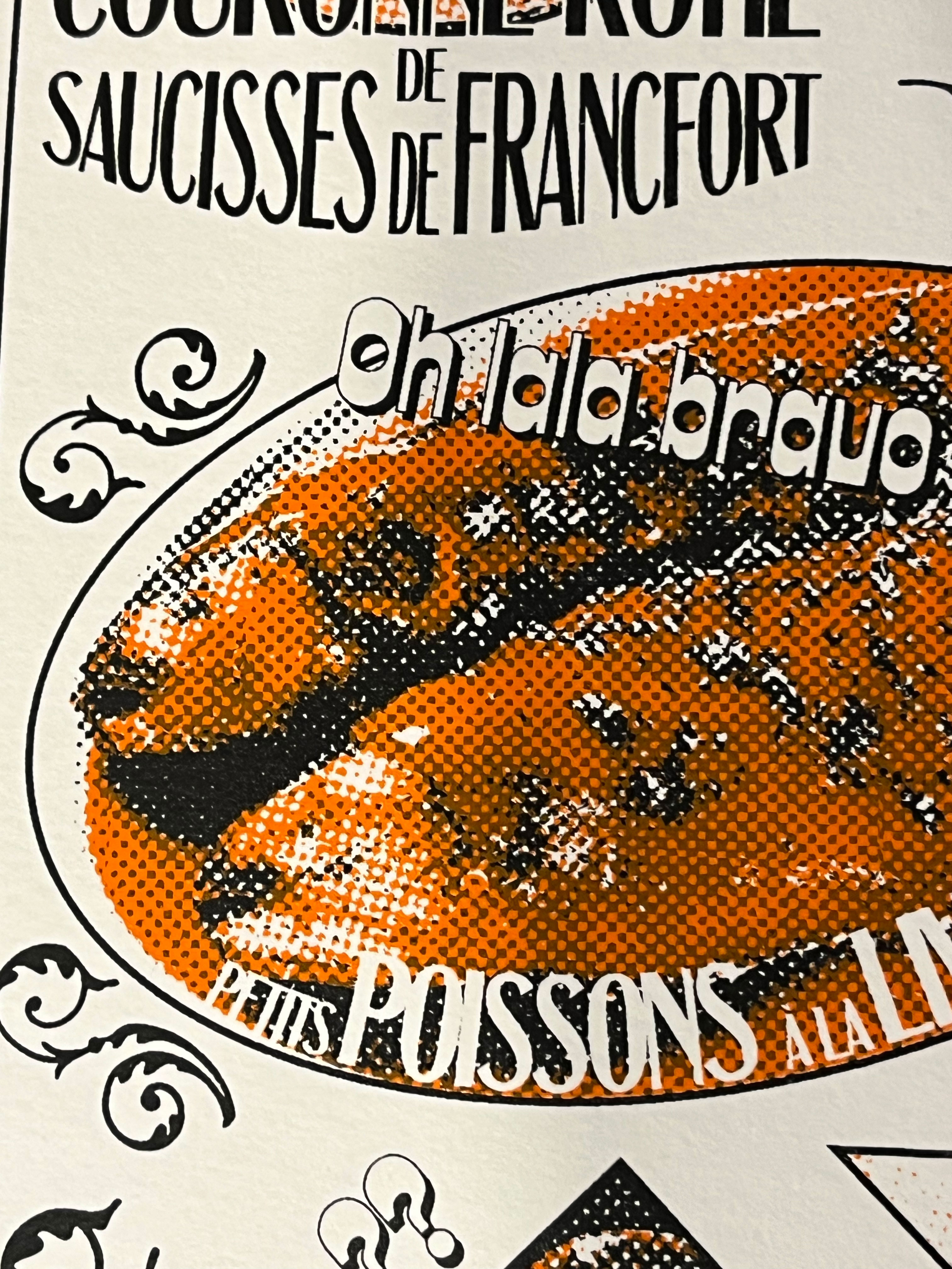 Printed in black and orange using screen printing at Atelier Bambinoin Lyon, France. Paolo (the guy I made the posters with) printed two T-shirts with it. The typefaces in use are Bookman Bold Italic Swash, ITC Bodoni Ornaments, Cesare, Interlope, Martian Mono and Zipper. Bon appétit !