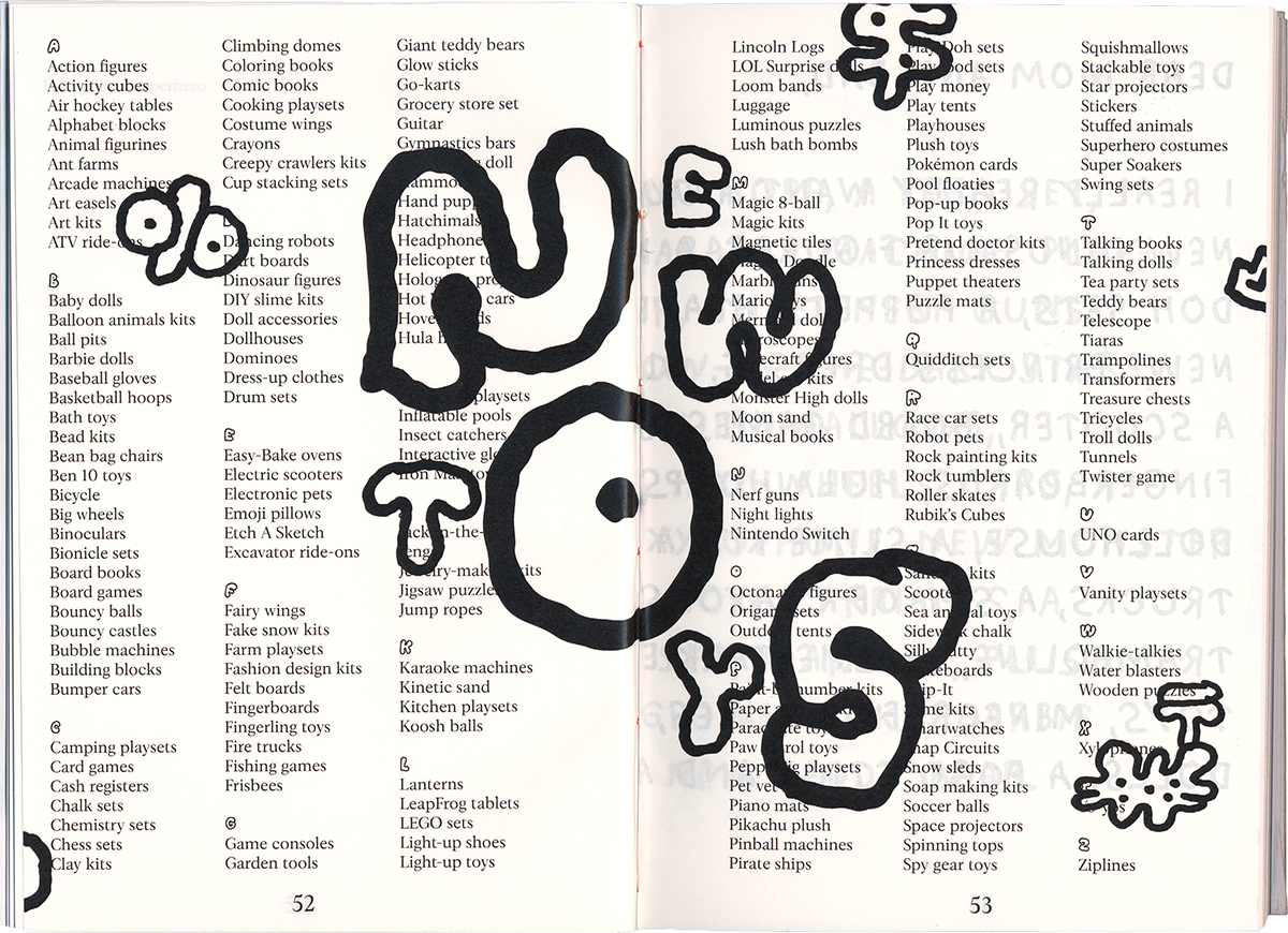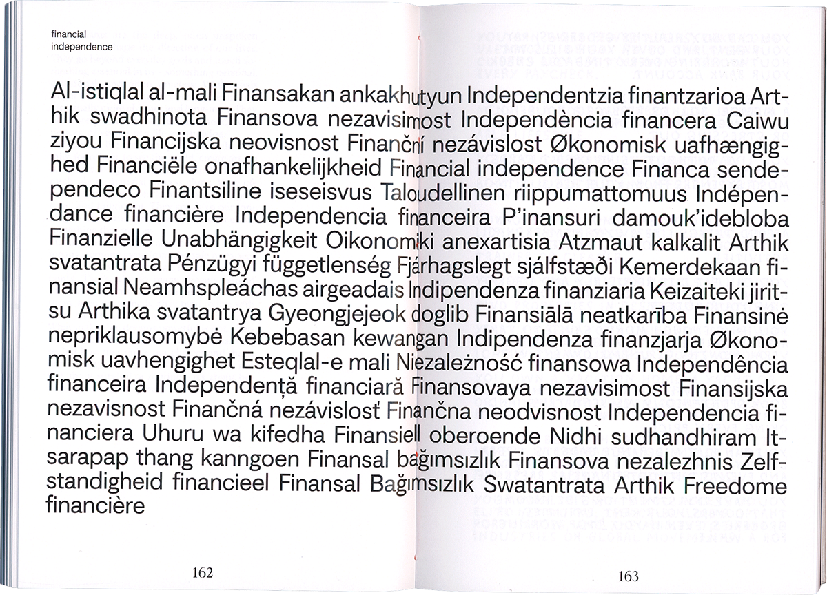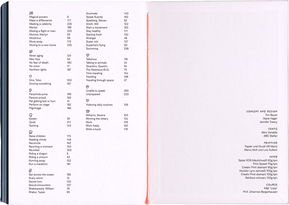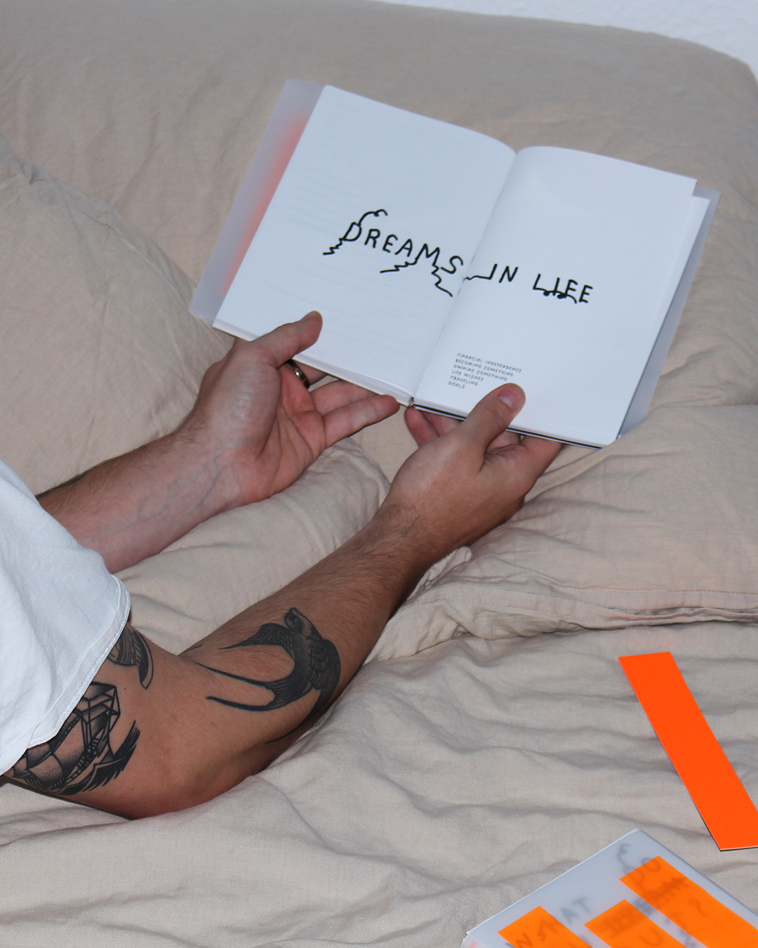 a typographic list of different types of dreams, from children’s dreams to daydreaming, up until nightmares, utilizing six different papers across the six chapters, ranging from light and transparent to thick and dark. the deconstructive nature of the exposed binding, as well as the grid on the wrapping, is used to break up the black and white book content and to further emphasize the experimental nature of the design. this is a list to reflect upon – to read from the beginning or to start in the middle, to use the bookmark and set aside, or to store away for a while.