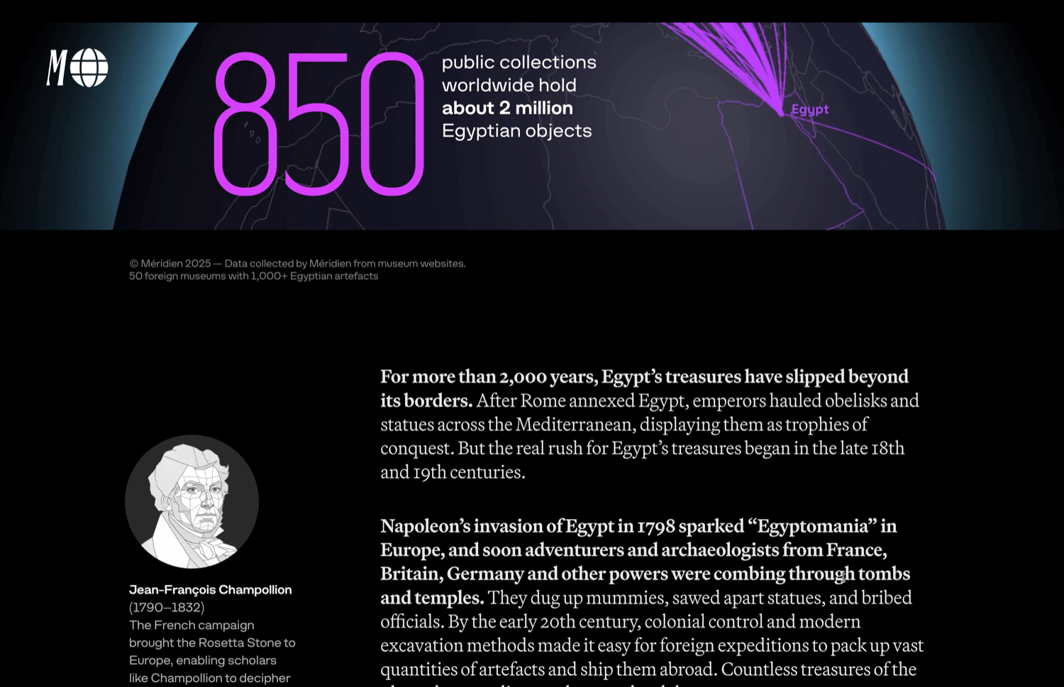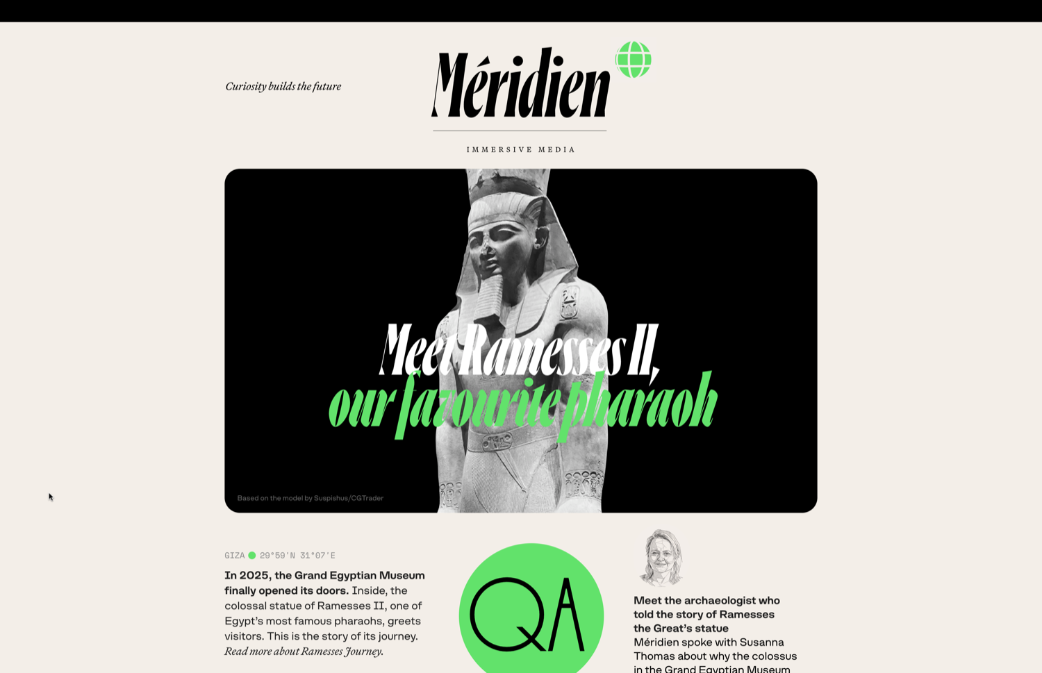 Méridien explores cities, places, and cultural landmarks, from Abu Dhabi and Cairo to London and Berlin. Travelling across meridians and parallels, we search for breakthroughs in engineering, architecture, culture, and technology. Our goal is simple: to reinvent how you see cities, history, and culture.