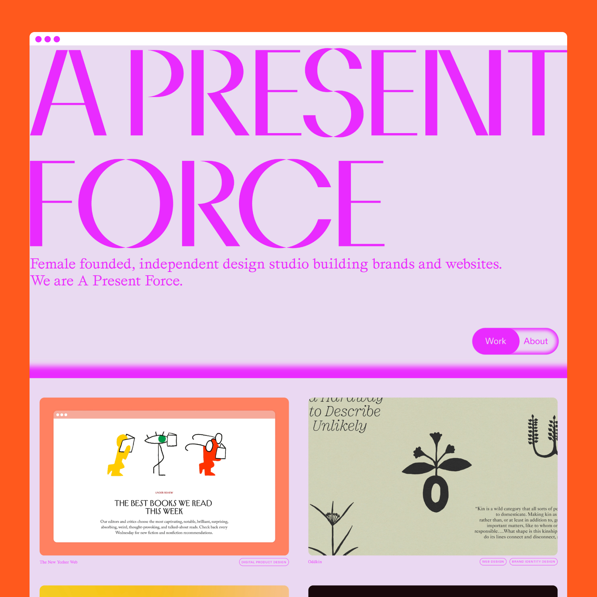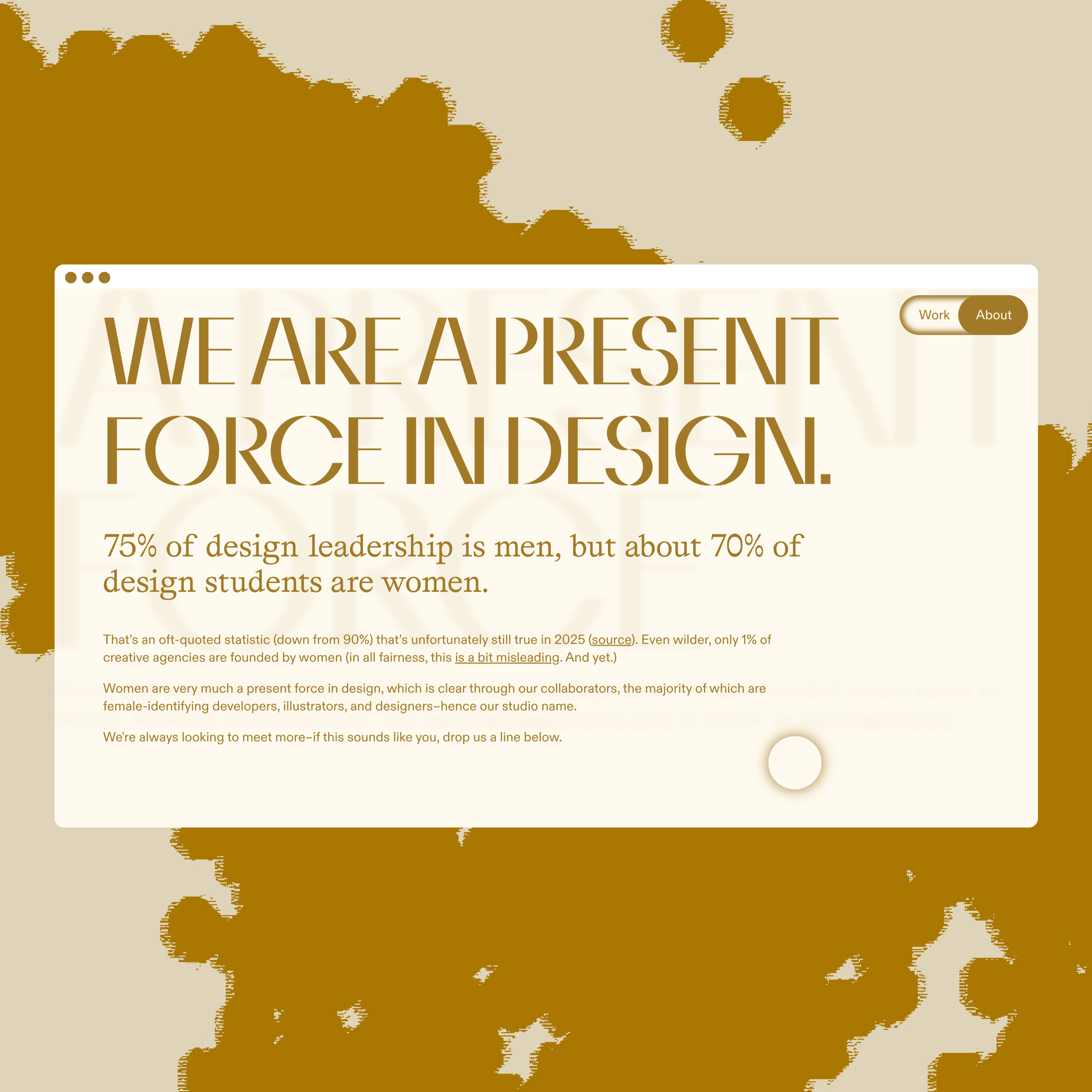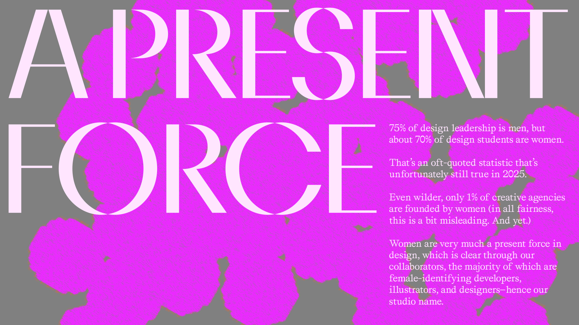 It is named “A Present Force” because despite the lack of representation in leadership, women are very much a present force in design. We are a female-founded practice based on a collective model, and the majority of our collaborators (illustrators, software engineers) identify as female or non-binary.