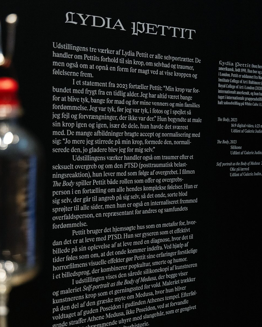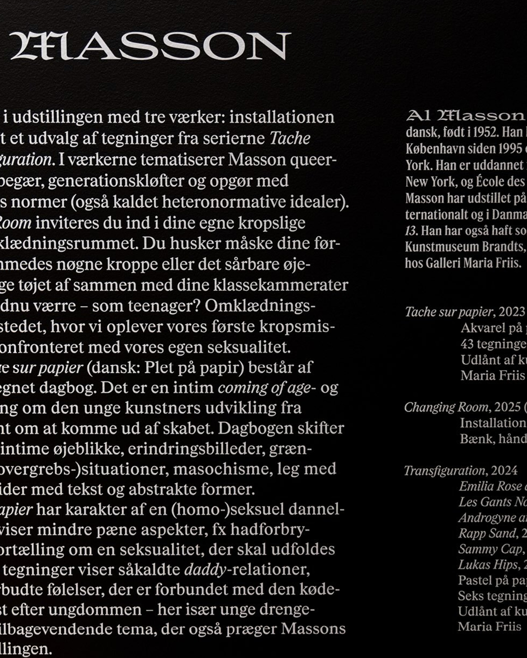 Graphics for the exhibition Anden Krop (English: Other Body) at Fuglsang Kunstmuseum in Toreby, Denmark, curated by Liza Kaaring and Tore Hallas. Spine Studio used Place together with Rhymes. Place is used with the blackletter capitals from its Extra styles. The exhibition architecture is by Louise Witthöft.