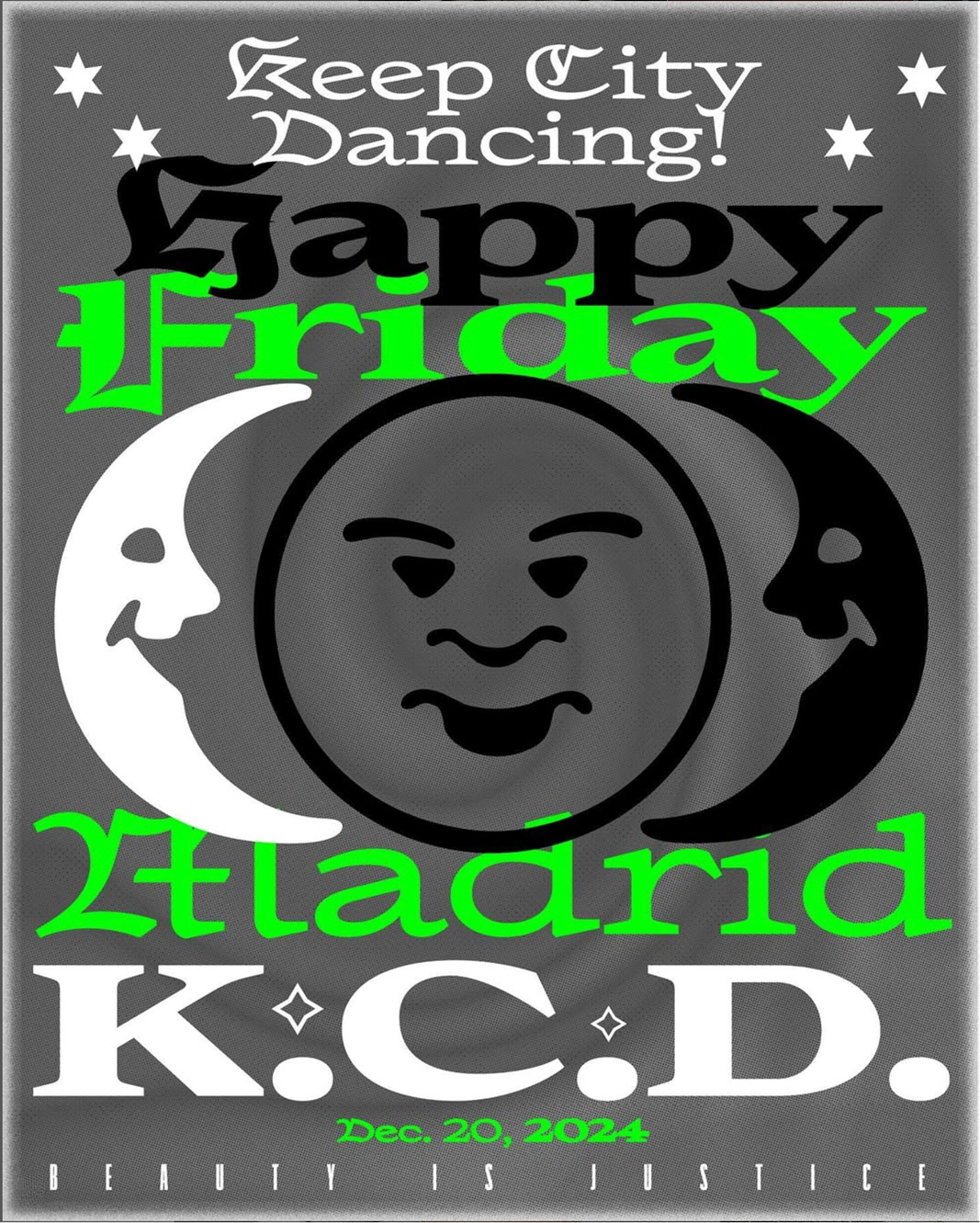 Poster designed by Juanan Velázquez, making early use of Placeby Julien Priez. The compressed sans-serif caps for “Beauty is Justice” are from an unidentified typeface [edit: it’s Graphik XXXX Condensed, see comments].
