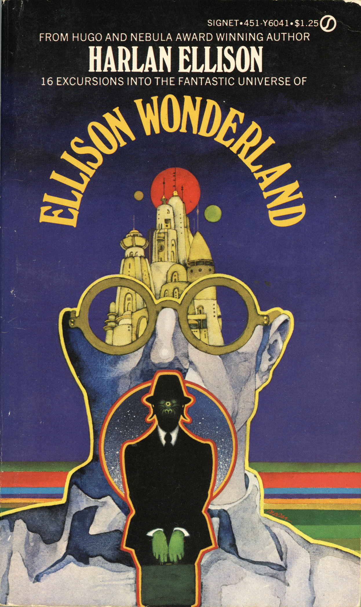 All-caps Windsor Elongated set on a semi-circle for Signet’s paperback edition of Ellison Wonderland from 1974. The title is integrated into the fantastic cover art by Bob Pepper, hovering as a sort of halo above the open head.