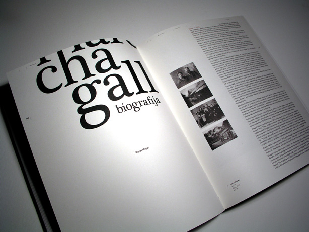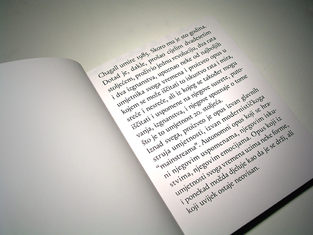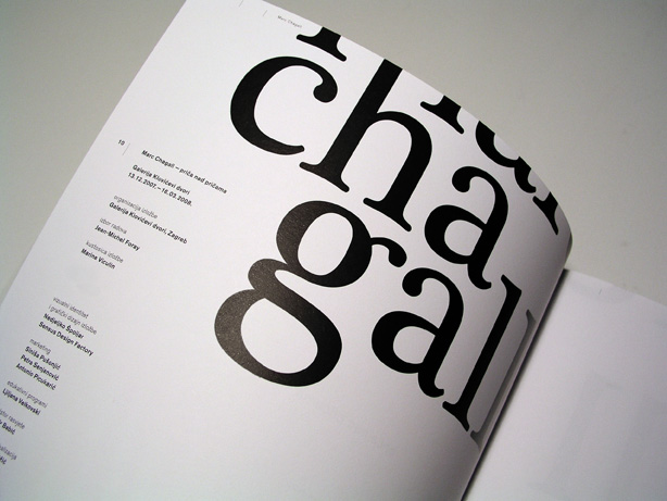 Marc Chagall – priča nad pričama is a monograph authored by Marina Viculin, Meret Meyer and Jean Michel Foray that was published on the occasion of the exhibition of Marc Chagall’s work at Klovicevi Dvori Gallery in Zagreb, Croatia. The key element of the identity is a “levitating” typographic composition of Chagall’s name, deliberately positioned in the upper edge of the format, bleeding off the page. This resembles Chagall’s flying figures, the reoccurring motif he used in his work which symbolizes his wavering between the spiritual and the earthly.