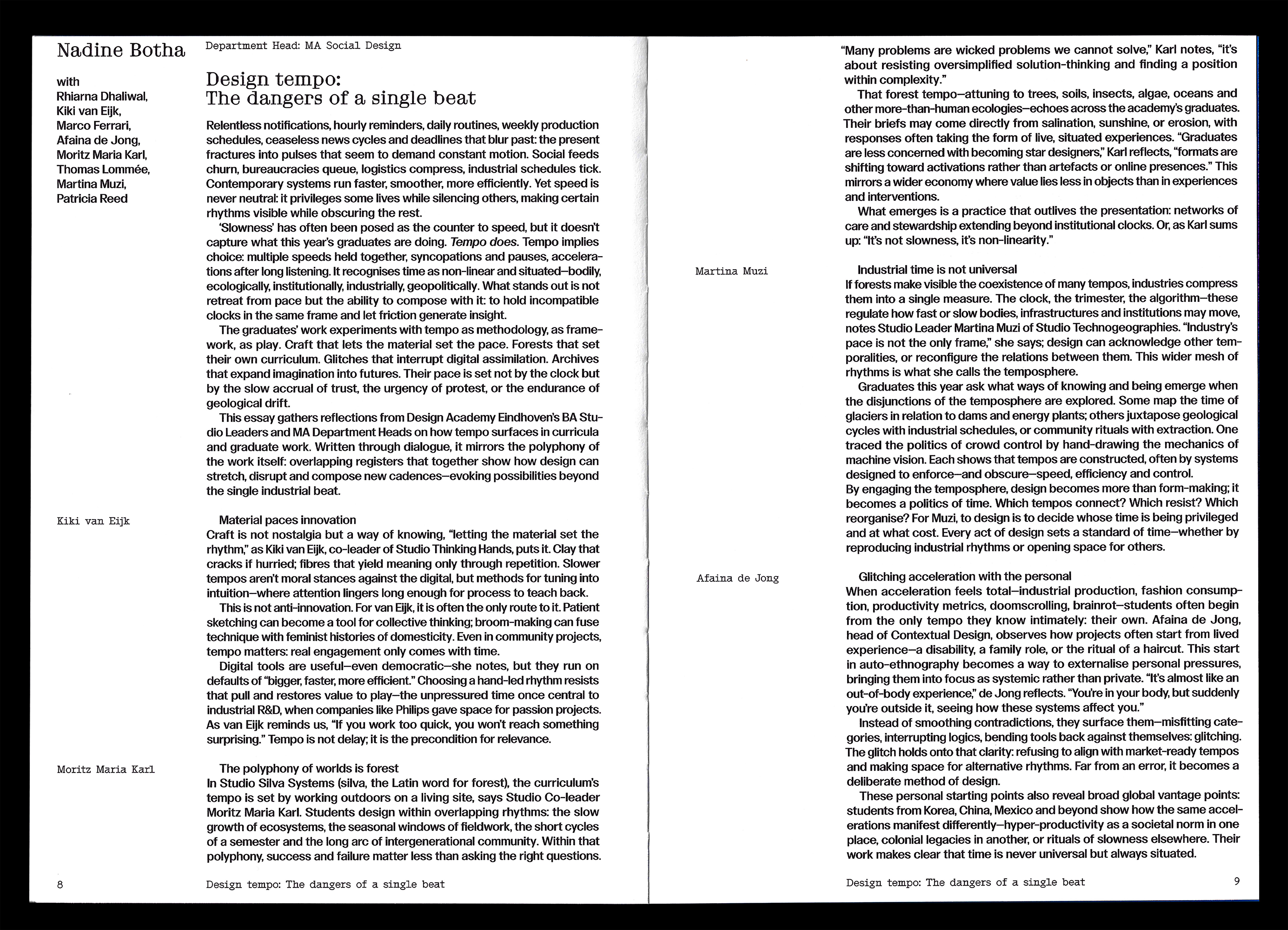 The concept of this graduation catalogue embraces the layered nature of both the graduating students’ personalities and their projects. Presenting not just polished outcomes, the catalogue also reveals personal perspectives and processes, giving graduating students an opportunity to address their positionality and the relational contexts of their work.