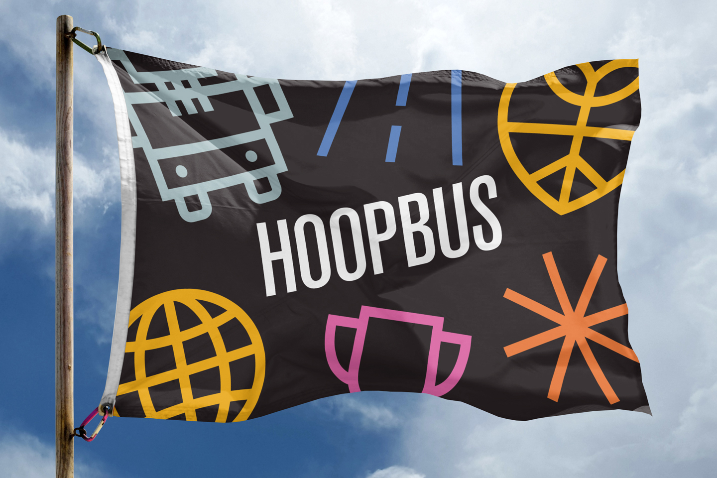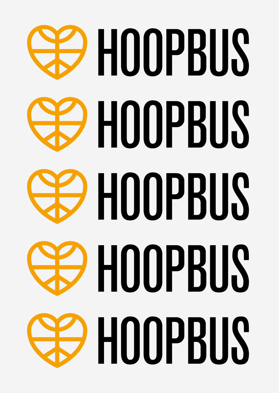 The Hoopbus identity is built around a simple yet powerful symbol – a heart, a peace sign, and a basketball – representing compassion, unity, and sport. Inspired by the classic American school bus, the bold black logotype nods to childhood nostalgia and lettering seen on buses that bring people together.