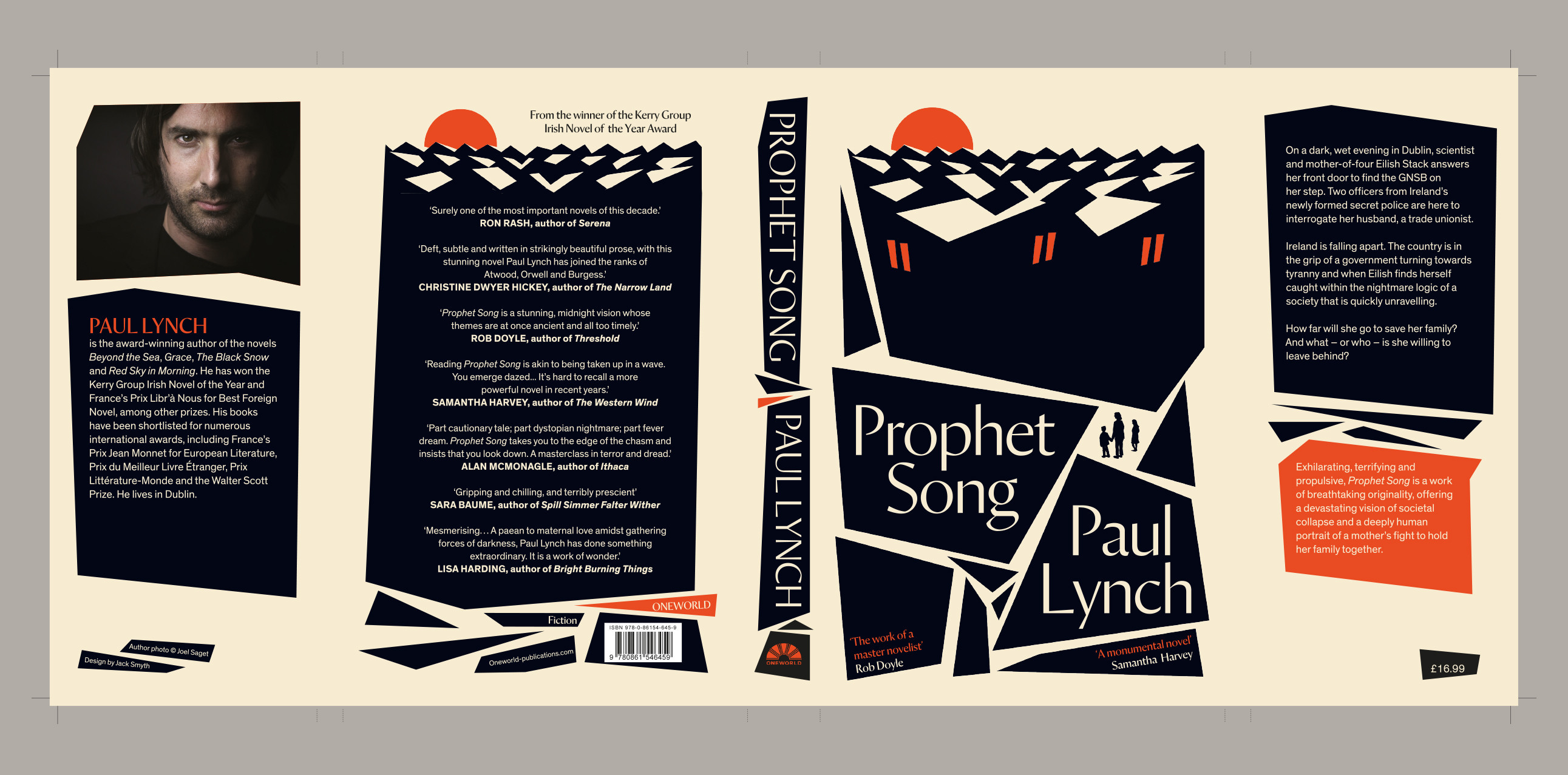 Prophet Song is a dystopian novel by Irish writer Paul Lynch. It was published by Oneworld in August 2023, with a jacket design by Jack Smyth who used Orleans for both title and author’s name. His design was also adapted for the US hardcover by Atlantic Monthly Press, (December 2023) and, in red, the paperback edition by Grove (October 2024).