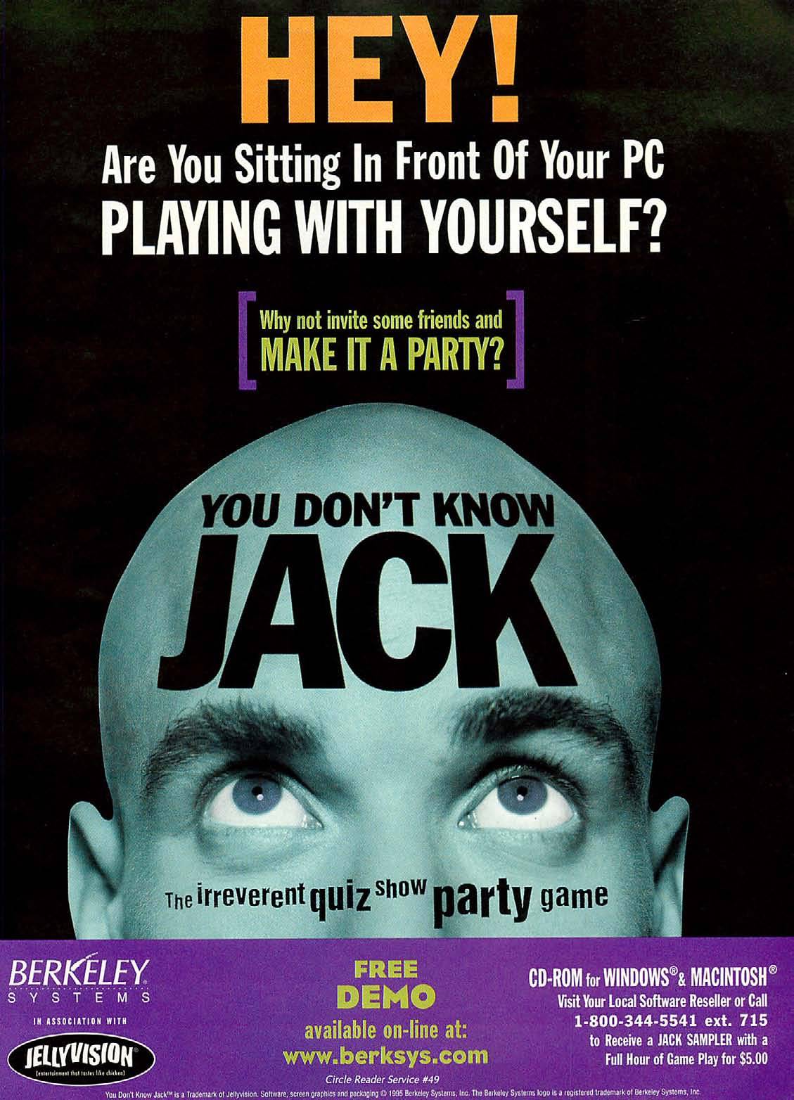 The logo as it appeared in a 1996 ad by Berkeley Systems. The text at the top uses Franklin Gothic Condensed and Extra Condensed. “The irreverent quiz show party game” is in some version of Helvetica Inserat. “Free Demo” and the URL use Eagle.