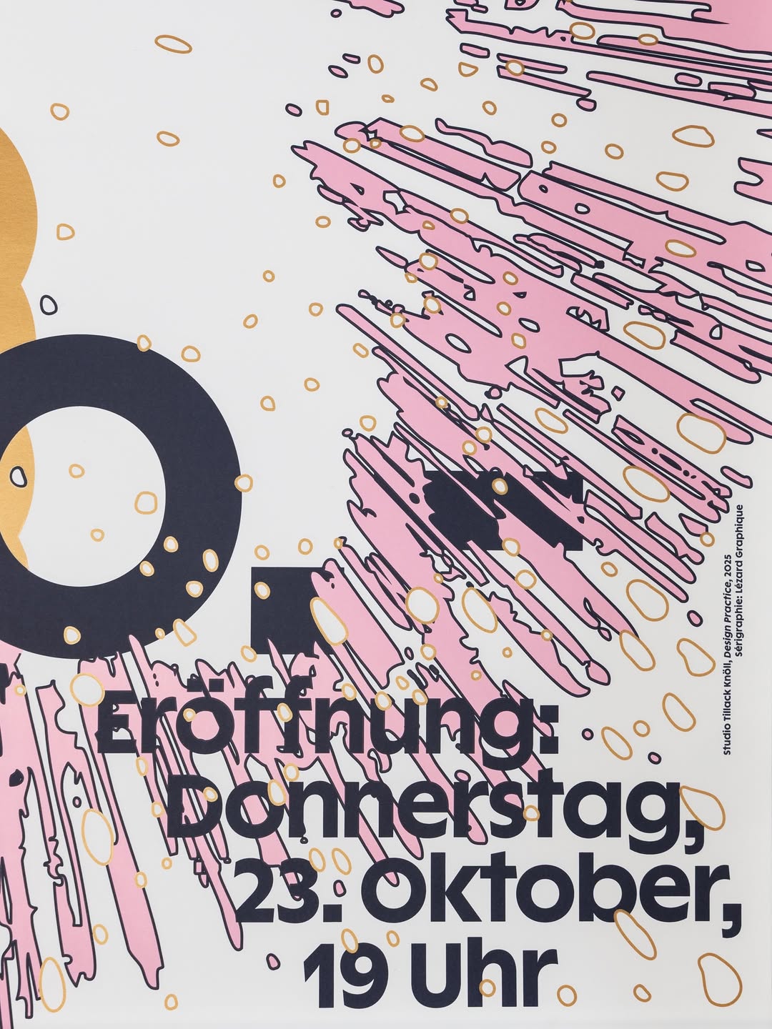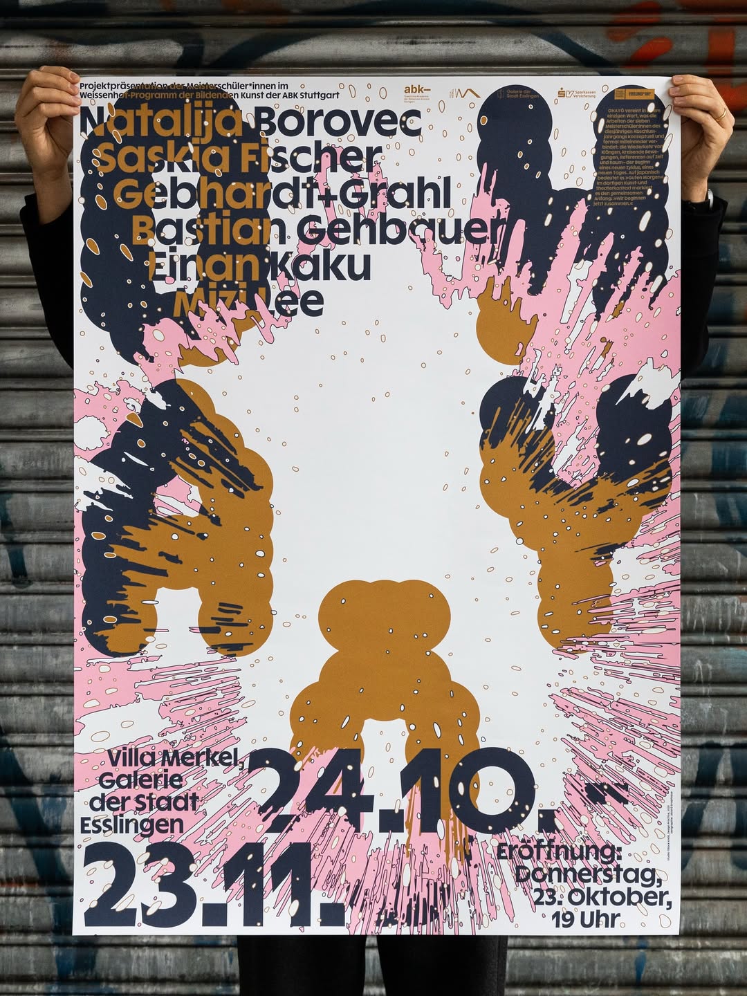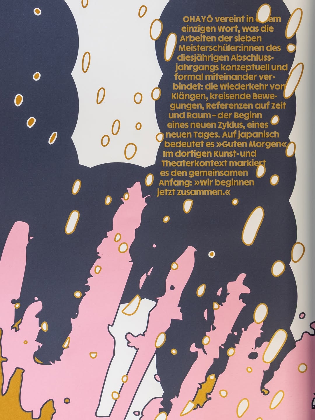 Poster for OHAYŌ, the project presentation of the Master’s students from the Weissenhof Fine Arts program at the ABK Stuttgart, shown from 24 October to 23 November 2025 at Villa Merkel, Esslingen. The poster was designed by the team of Studio Tillack Knöll (consisting of Sven Tillack, Steffen Knöll and Zevako Maryna). It’s a three-color silkscreen print on DIN A0 paper,