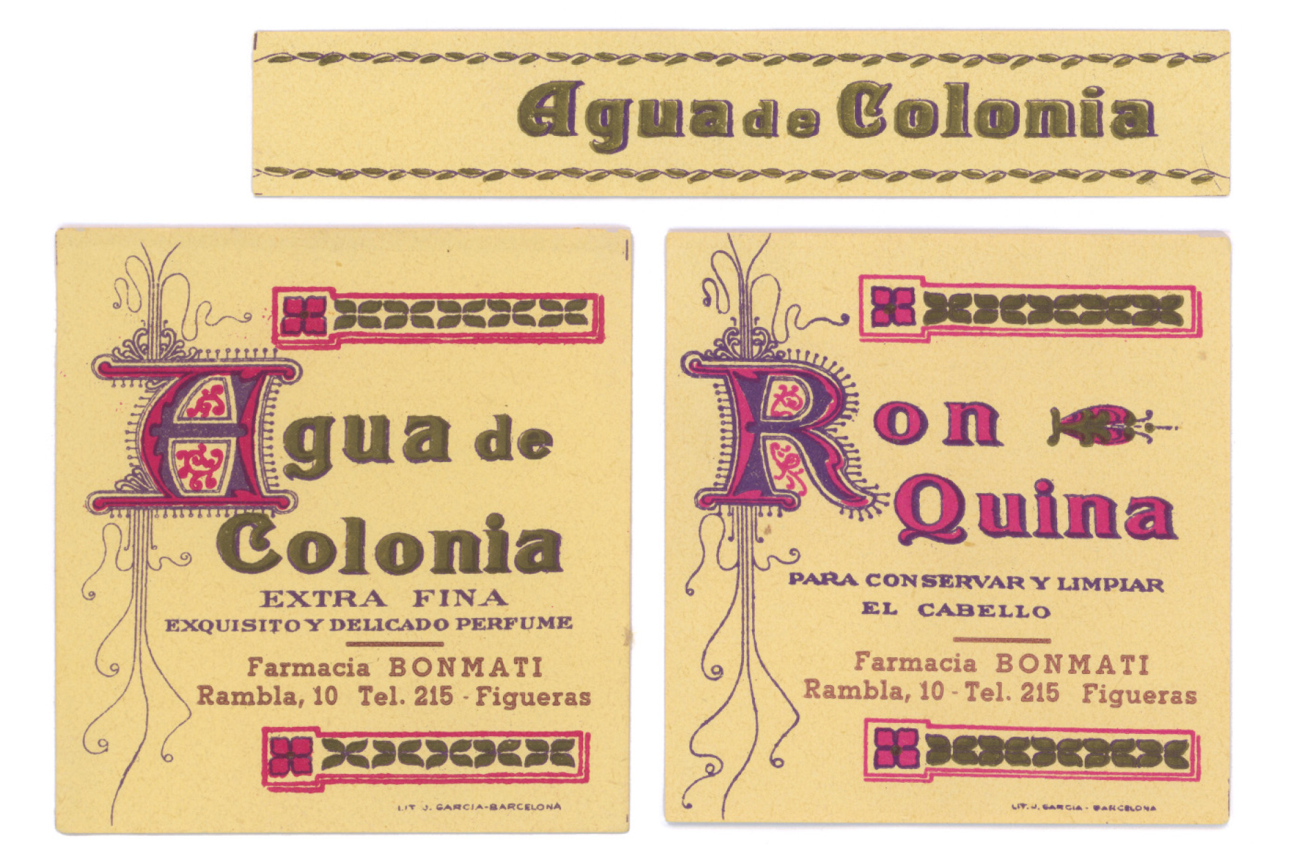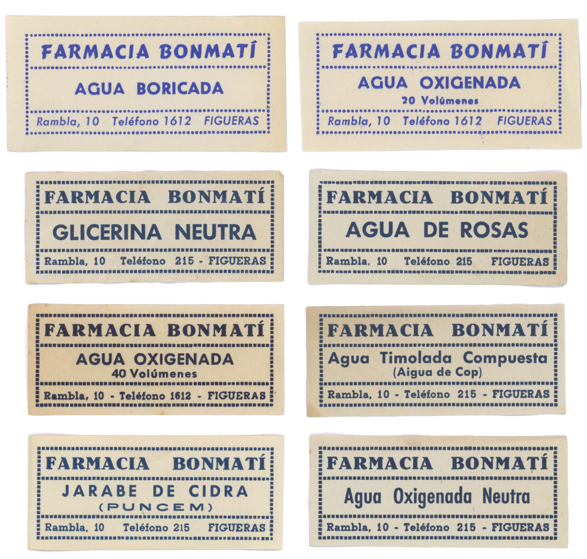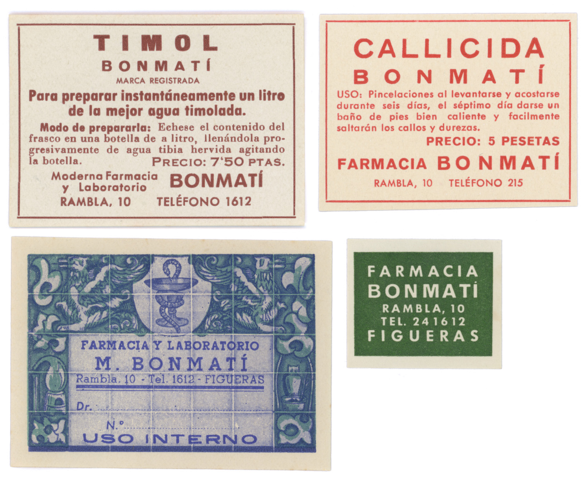 An advert from the early 1940s places the Bonmatí pharmacy at the upperside of the Rambla in Figueres, in the Catalonian region of Girona. Although the pharmacy moved to a new address few years ago, the old signage is still preserved at its original location. At the new address, the Bonmatí family preserves a ceramic sign and the cabinet that was used to store the labels for the pharmacy’s products. Typography and lettering, letterpress and lithography. A few millimetres of paper were used to create small graphic universes to organise the categories of pharmaceutical products.