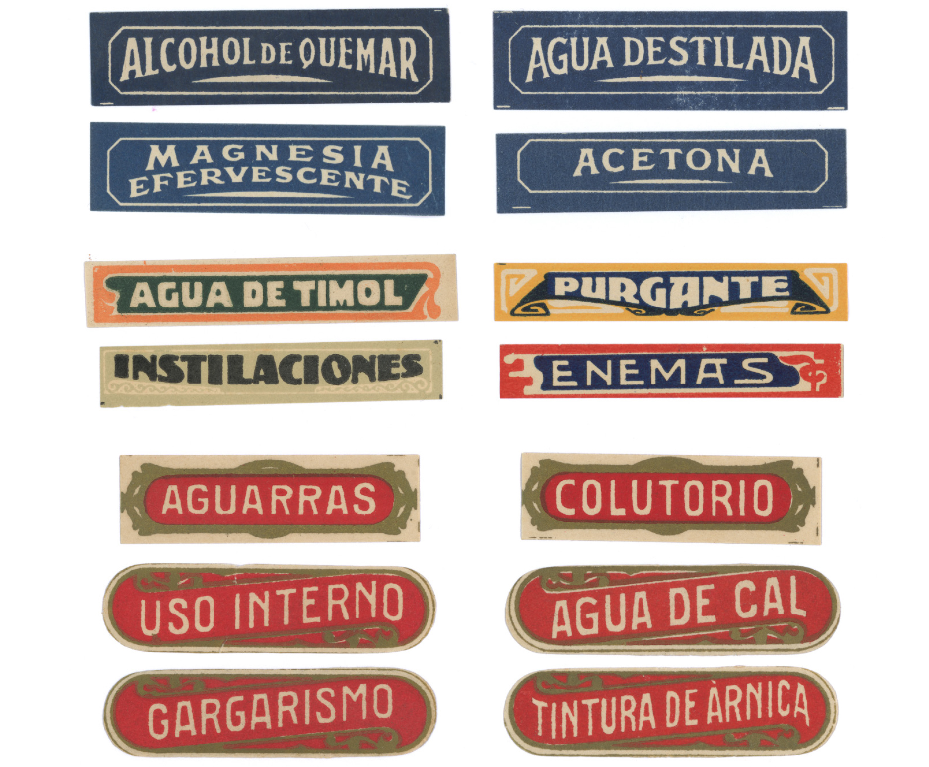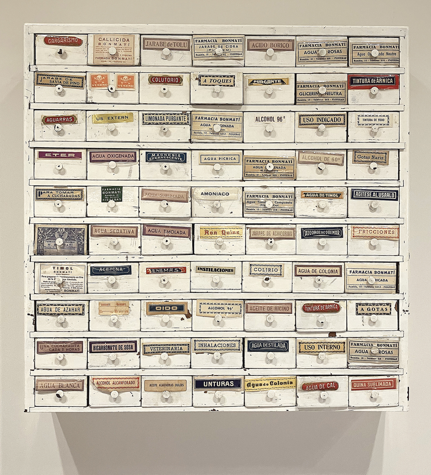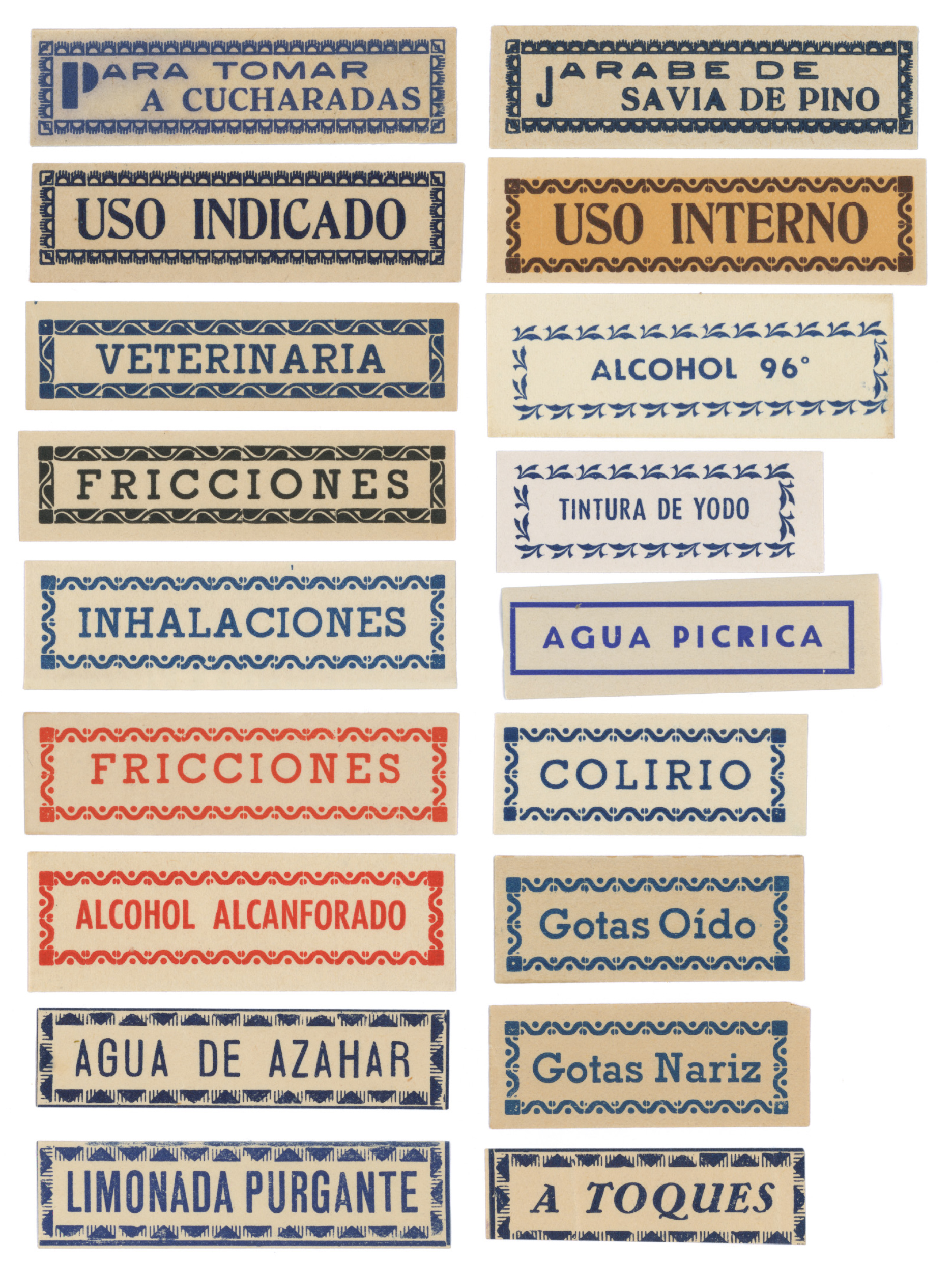 An advert from the early 1940s places the Bonmatí pharmacy at the upperside of the Rambla in Figueres, in the Catalonian region of Girona. Although the pharmacy moved to a new address few years ago, the old signage is still preserved at its original location. At the new address, the Bonmatí family preserves a ceramic sign and the cabinet that was used to store the labels for the pharmacy’s products. Typography and lettering, letterpress and lithography. A few millimetres of paper were used to create small graphic universes to organise the categories of pharmaceutical products.